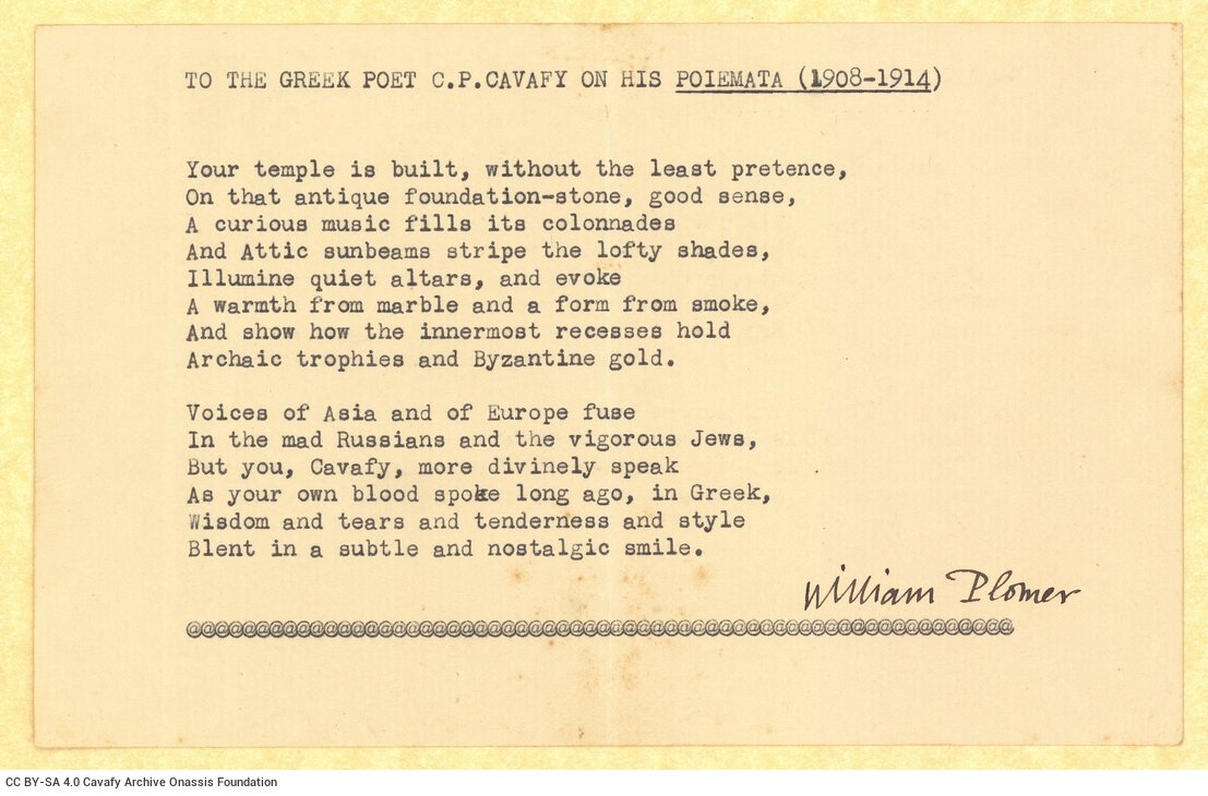 Αντίστοιχα, στο τεκμήριο GR-OF CA CA-SF02-S01-SS03-F23-0006 (366), https://cavafy.onassis.org/el/object/plomer-forster/, βρίσκουμε επιστολή του νοτιοαφρικανικής καταγωγής Βρετανού συγγραφέα William Plomer προς τον E. M. Forster, γραμμένη στις 11/05/1931. Ο Plomer εκφράζει τον θαυμασμό του για την ποίηση του Καβάφη και, μάλιστα, επισυνάπτει δακτυλόγραφο σονέτο εμπνευσμένο από στίχους του ποιητή, με τίτλο “To the Greek Poet C. P. Cavafy on his Poiemata (1908-1914)”.