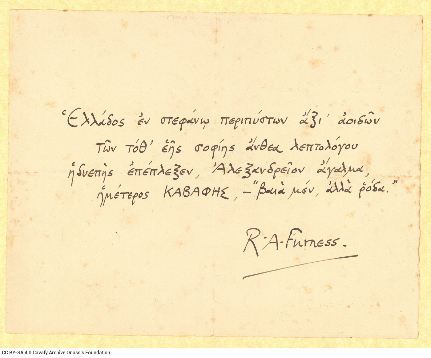 Στο αρχείο του ποιητή σώζεται χειρόγραφο επίγραμμα του Furness, αφιερωμένο στον «ημέτερο» Καβάφη. Πρόκειται για το τεκμήριο GR–OF CA CA–SF02-S02-F25-SF008-0005 (1289), https://cavafy.onassis.org/el/object/uu-11/.