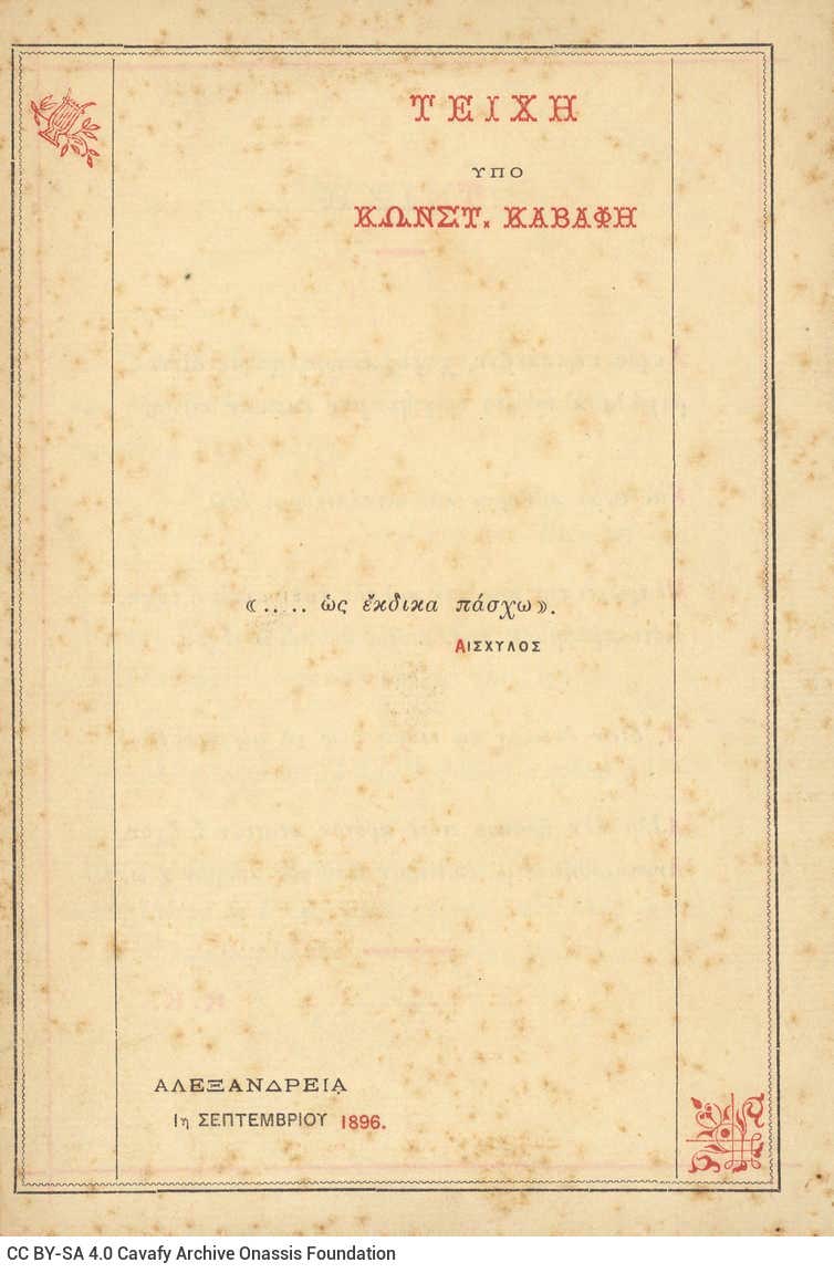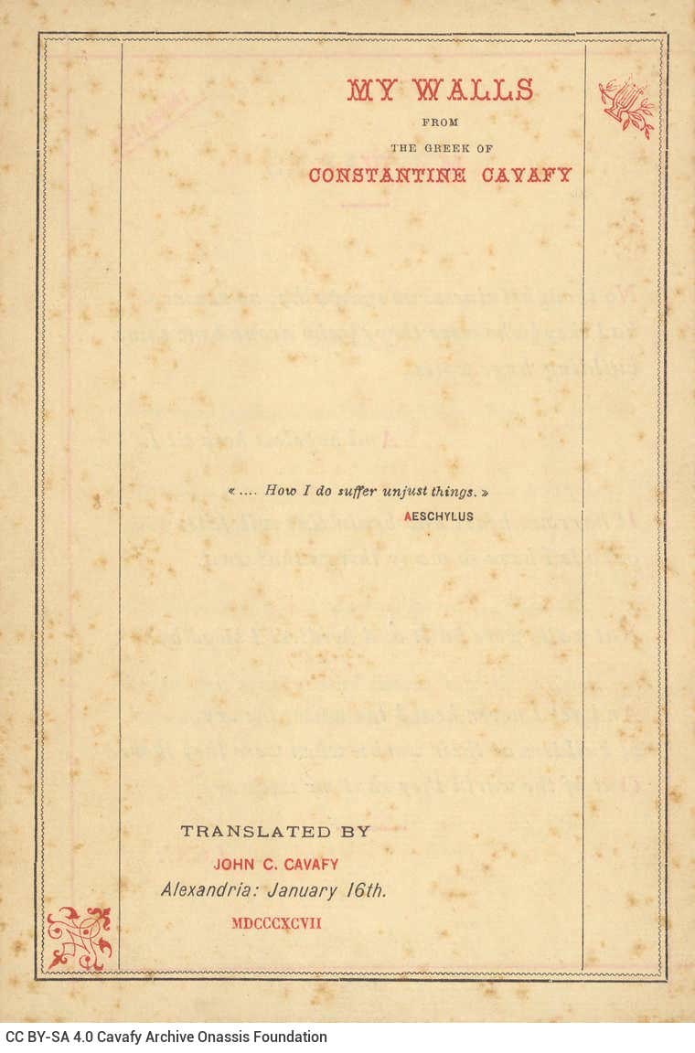 Το 1897 τυπώθηκε το καβαφικό φυλλάδιο «Τείχη», μαζί με την αγγλική μετάφραση του ποιήματος, από τον αδελφό του ποιητή, Τζων Καβάφη. Πρόκειται για το τεκμήριο με τίτλο «Τείχη-My Walls», GR-OF CA CA-SF01-S01-F02-SF001-0003 (2066), και μπορείτε να το δείτε εδώ: https://cavafy.onassis.org/el/object/my-walls/. O Τζων Καβάφης (Ιωάννης Κωνσταντίνος ή John C. Cavafy, όπως υπογράφει) είναι ο πρώτος γνωστός μεταφραστής καβαφικού ποιήματος στα αγγλικά.