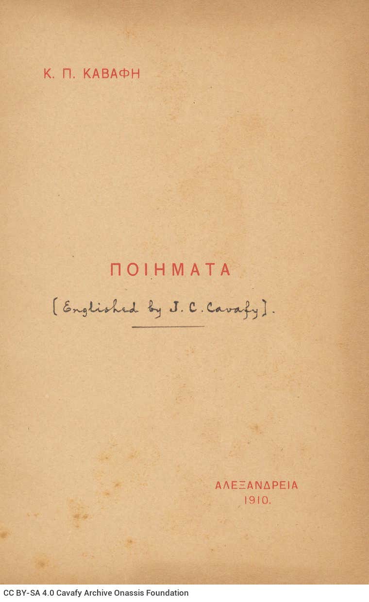 Πάνω στην ίδια σελίδα, παρατηρούμε πως έχει επικολληθεί, με δύο αγγλικά γραμματόσημα, έντυπο με τον τίτλο “Poems by C. P. Cavafy. Translated, from the Greek, by J. C. Cavafy” και την ένδειξη “Alexandria, 1918”. Στον τόμο συμπεριλαμβάνονται ακόμα πέντε σελίδες περιεχομένων, ενώ τα περισσότερα ποιήματα έχουν δακτυλογραφηθεί. Ορισμένα ποιήματα φέρουν χειρόγραφες διορθώσεις, πιθανώς από το χέρι του Τζων. Στην περίπτωση αυτή, δεν έχει συμπεριληφθεί το ελληνικό πρωτότυπο των ποιημάτων.