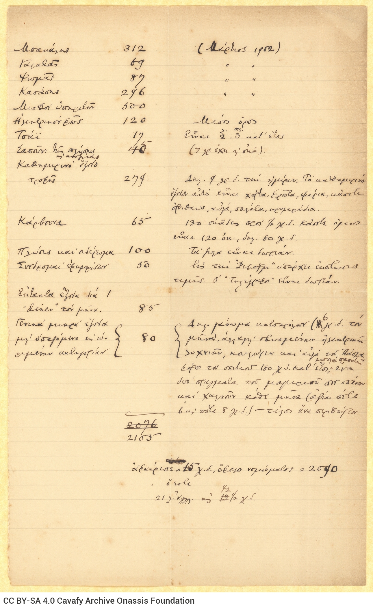 Ωστόσο, εκτός από τη Χαρίκλεια Καβάφη, και ο ίδιος ο ποιητής φαίνεται πως καταπιανόταν με τον οικιακό προγραμματισμό, όπως προκύπτει από τις σχετικές του σημειώσεις. Στο τεκμήριο GROF CA CASF02-S02-F25-SF003-0008 (902), https://cavafy.onassis.org/el/object/u-232/, που χρονολογείται στον Μάρτιο του 1902, καταγράφονται τα μηνιαία έξοδα και η κατανομή τους (μισθοί οικιακών βοηθών, αγορές τροφίμων κ.λπ.). Παράλληλα, ο Καβάφης σημειώνει τα δικά του προσωπικά έξοδα.