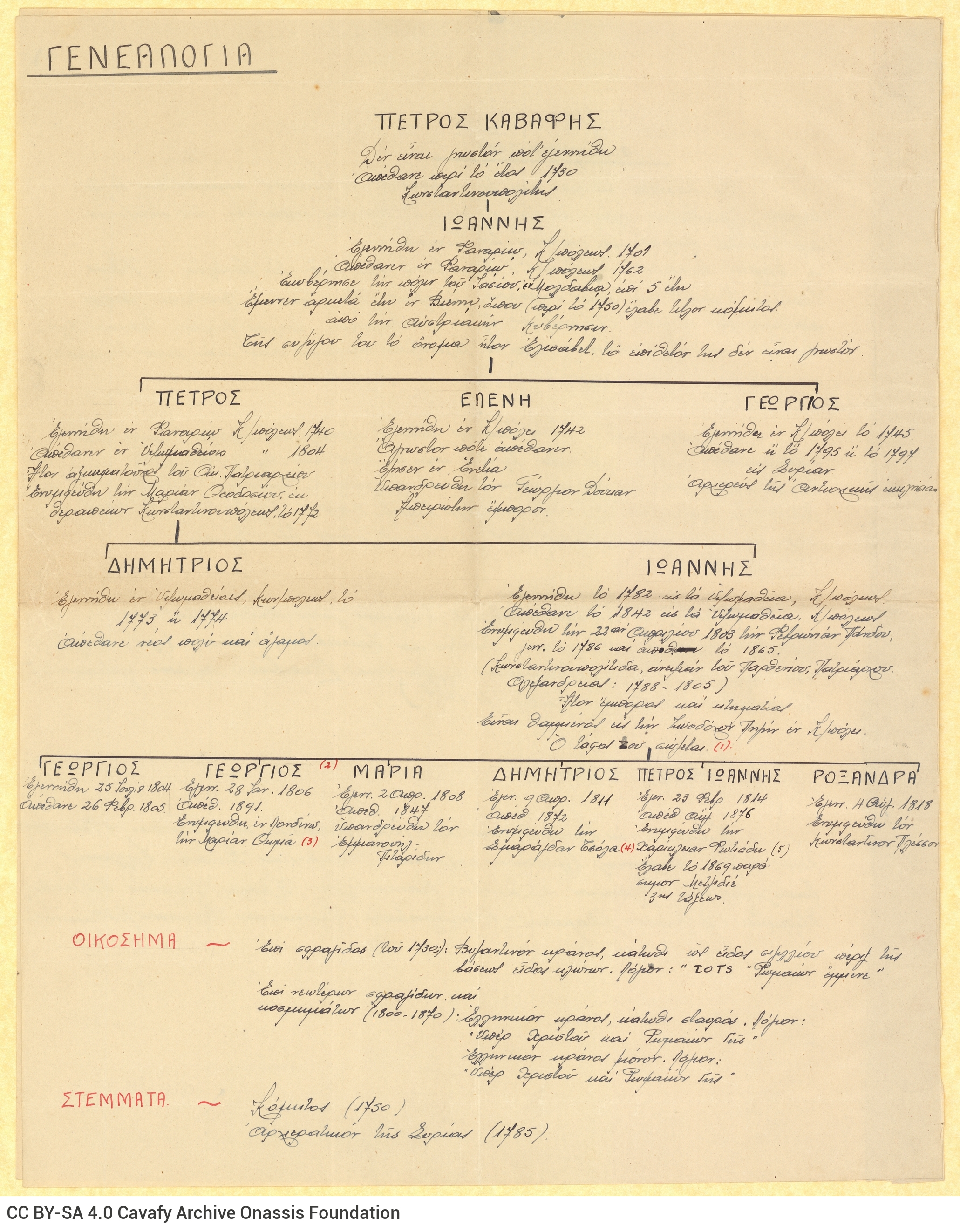 1 Το πρωτότυπο γενεαλογικό δέντρο, χειρόγραφο από το χέρι του ποιητή, φυλάσσεται στο Μουσείο Μπενάκη [Αρχείο Αρ. Εισ. 202 – Χειρόγραφα Κωνσταντίνου Καβάφη (1917-1935)] και συνοδεύεται από εκτενείς σημειώσεις του Καβάφη με γενεαλογικές πληροφορίες. Για περισσότερες πληροφορίες, βλ. σχετική καταχώρηση στο Εθνικό Ευρετήριο Αρχείων, https://greekarchivesinventory.gak.gr/index.php/k-2, καθώς και στο: Β. Τσελίκα, Οδηγός Ιστορικών Αρχείων Μουσείου Μπενάκη, Μουσείο Μπενάκη, Αθήνα 2006, σ. 81. Η μεταγραφή του χειρόγραφου δημοσιεύθηκε για πρώτη φορά το 1948 στο περιοδικό Νέα Εστία, 42 (15 Μαΐου 1948), με τον τίτλο «Η Γενεαλογία του Καβάφη». Το ψηφιοποιημένο τεύχος είναι διαθέσιμο εδώ: http://www.ekebi.gr/magazines/ShowImage.asp?file=75569&code=1354. Νεότερη μεταγραφή, παρουσίαση και σχολιασμός της «Γενεαλογίας του Καβάφη» με ομοιότυπη αναπαραγωγή του χειρόγραφου στο: Β. Καραγιάννης, Σημειώσεις από την Γενεαλογία του Καβάφη, ΕΛΙΑ, Αθήνα 1983, σ. 159-179. Βλ. και Δ. Δασκαλόπουλος, Βιβλιογραφία Κ. Π. Καβάφη (1886-2000), Κέντρο Ελληνικής Γλώσσας, Θεσσαλονίκη 2003, σ. 96, 128, λήμματα με κωδικό Α433 και Α578, αντίστοιχα.