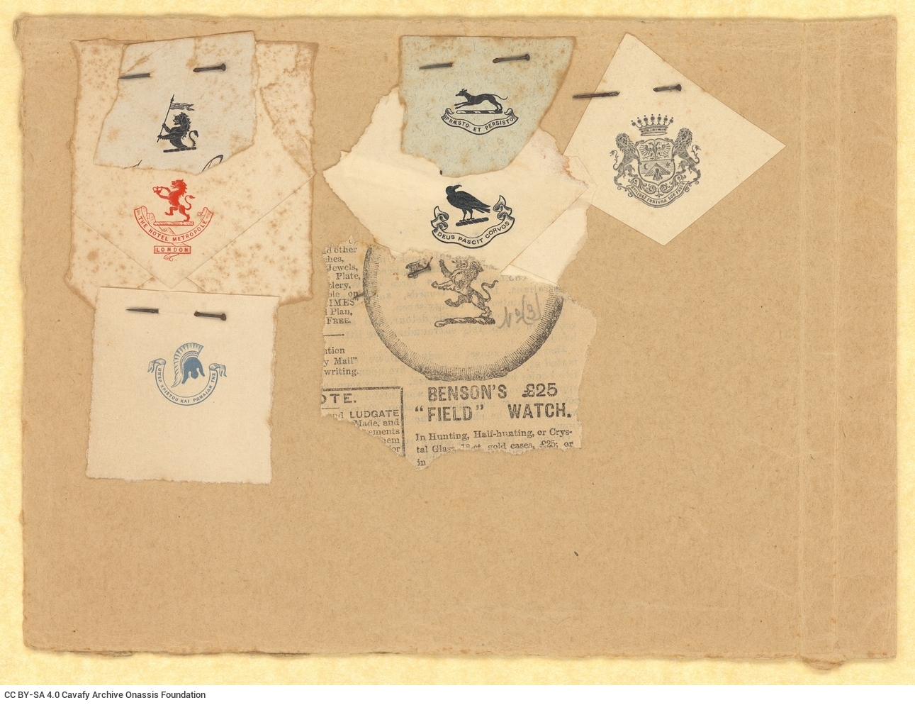 Στο τεκμήριο GR-OF CA CA-SF02-S02-F25-SF006-0017 (1144), https://cavafy.onassis.org/el/object/nysf-pc8k-ycza/, βλέπουμε επίσης αυτοσχέδιο φάκελο, ο οποίος περιέχει «συλλογή» από έντυπα οικόσημα κομμένα από επιστολόχαρτα, επιστολικούς φακέλους κ.λπ., αρχικά καρφιτσωμένα πάνω στον φάκελο (Λήψη 1 και ξεχωριστά το κάθε απόκομμα στις Λήψεις 2 έως 8). Ο φάκελος περιλαμβάνει ακόμα: πρόχειρο σχέδιο οικοσήμου με τη σημείωση “the two branches to take in the helmet” (Λήψη 9)· χειρόγραφη περικοπή από την Πολιτεία του Πλάτωνα (Λήψη 10)· δέκα κομμάτια χαρτιού που φέρουν σχέδια με μολύβι (Λήψεις 11 έως 21)· επιστολόχαρτο με το «οικόσημο» της οικογένειας (Λήψη 22) και άλλα σχετικά αποκόμματα. Φαίνεται πως ο ποιητής συλλέγει εμπορικούς λογότυπους και οικόσημα, δοκιμάζει διαφορετικές φράσεις (ίσως ψάχνοντας το ιδανικό μότο;) και αντιγράφει το σχέδιο οικοσήμων. Μάλιστα, σε κάποια από τα σχέδια με μολύβι, τα οποία περιλαμβάνονται στον φάκελο, αναφέρεται παραπομπή σε σελίδες αγνώστου εντύπου (για παράδειγμα, Λήψεις 12 έως 19).
