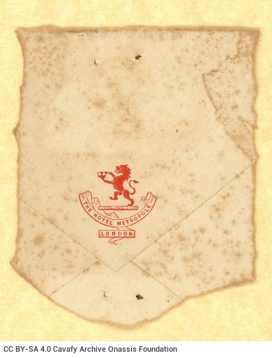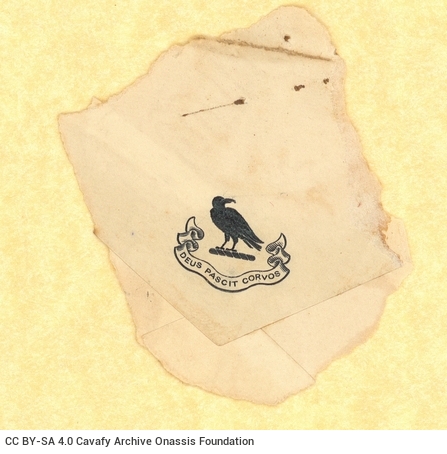Στο ίδιο τεκμήριο βρίσκουμε και απόκομμα φακέλου με έντυπο λογότυπο-κράνος και το μότο «Υπέρ Χριστού και Ρωμαίων Γης» (Λήψη 4). Το τεκμήριο συνοδεύεται από χαρτί με χειρόγραφη σημείωση του Καβάφη (Λήψη 5). Ο ποιητής σημειώνει «ανήκει στο Ε΄»· όπως διαβάζουμε στην περιγραφή του τεκμηρίου, στο κάτω μέρος της οθόνης μας, η σημείωση παραπέμπει σε τμήμα του γενεαλογικού δέντρου της οικογένειας Καβάφη.