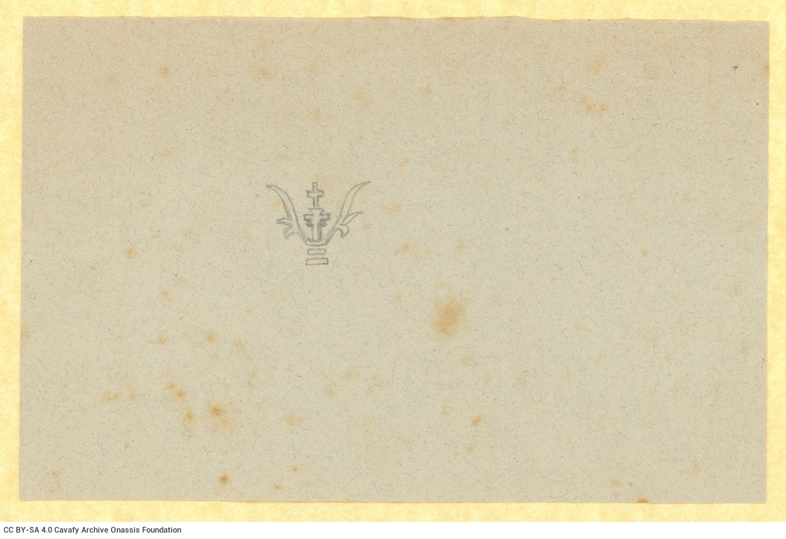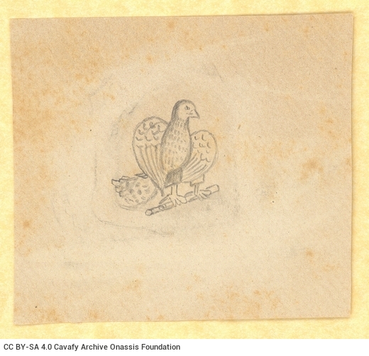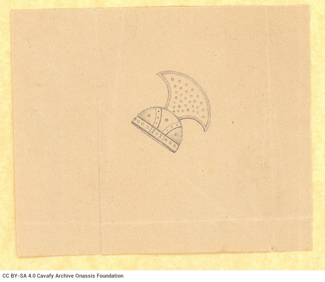 Στο τεκμήριο με τον κωδικό GR-OF CA CA-SF02-S02-F25-SF002-0005 (469), https://cavafy.onassis.org/el/object/u-161/, βρίσκουμε τρία ζωγραφικά σχέδια αποτυπωμένα με μολύβι σε κομμάτια χαρτιού μικρών διαστάσεων. Το πρώτο απεικονίζει ένα κράνος (Λήψη 1), το δεύτερο έναν σταυρό (Λήψη 2) και το τρίτο ένα πουλί (Λήψη 3).