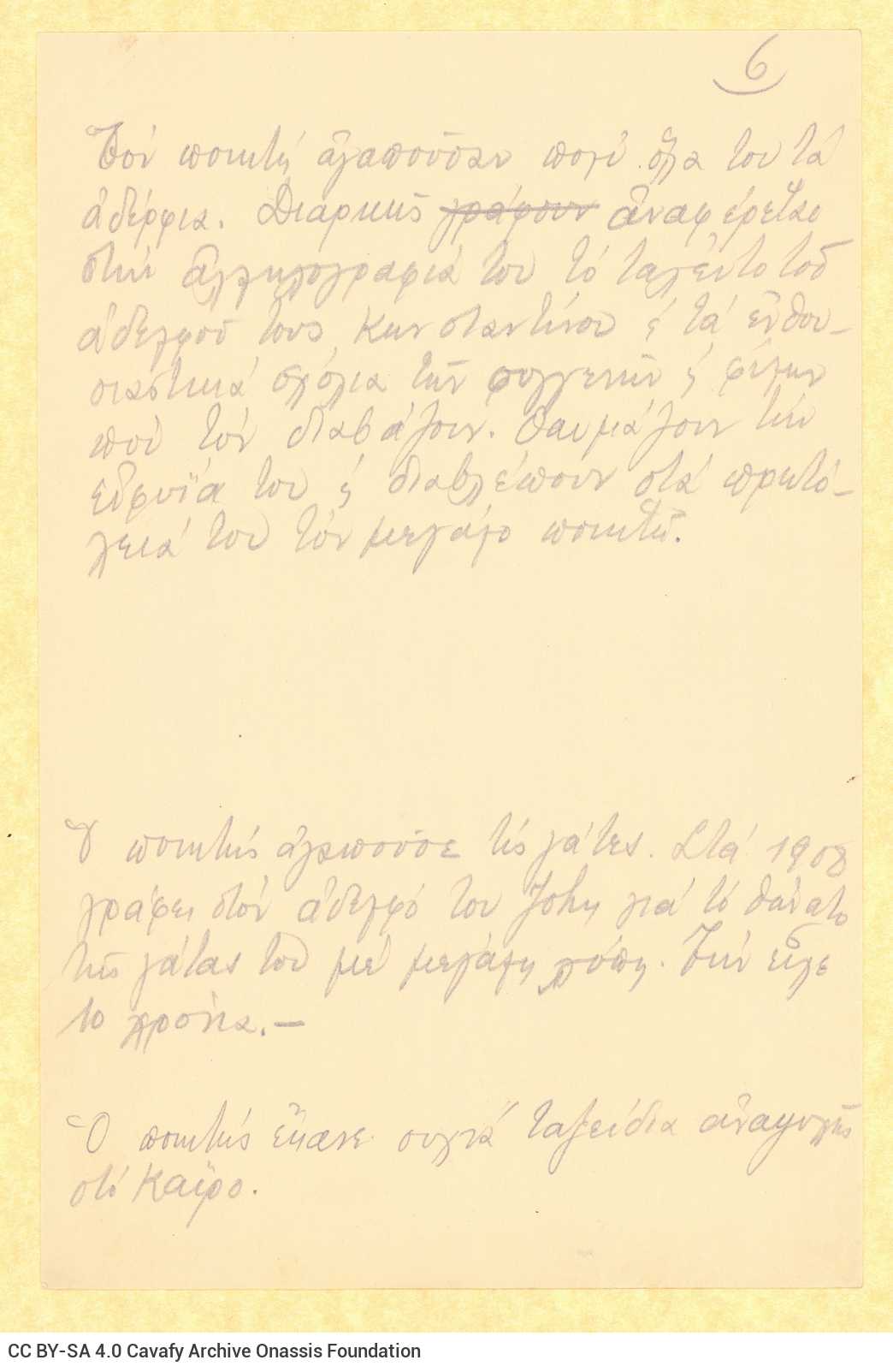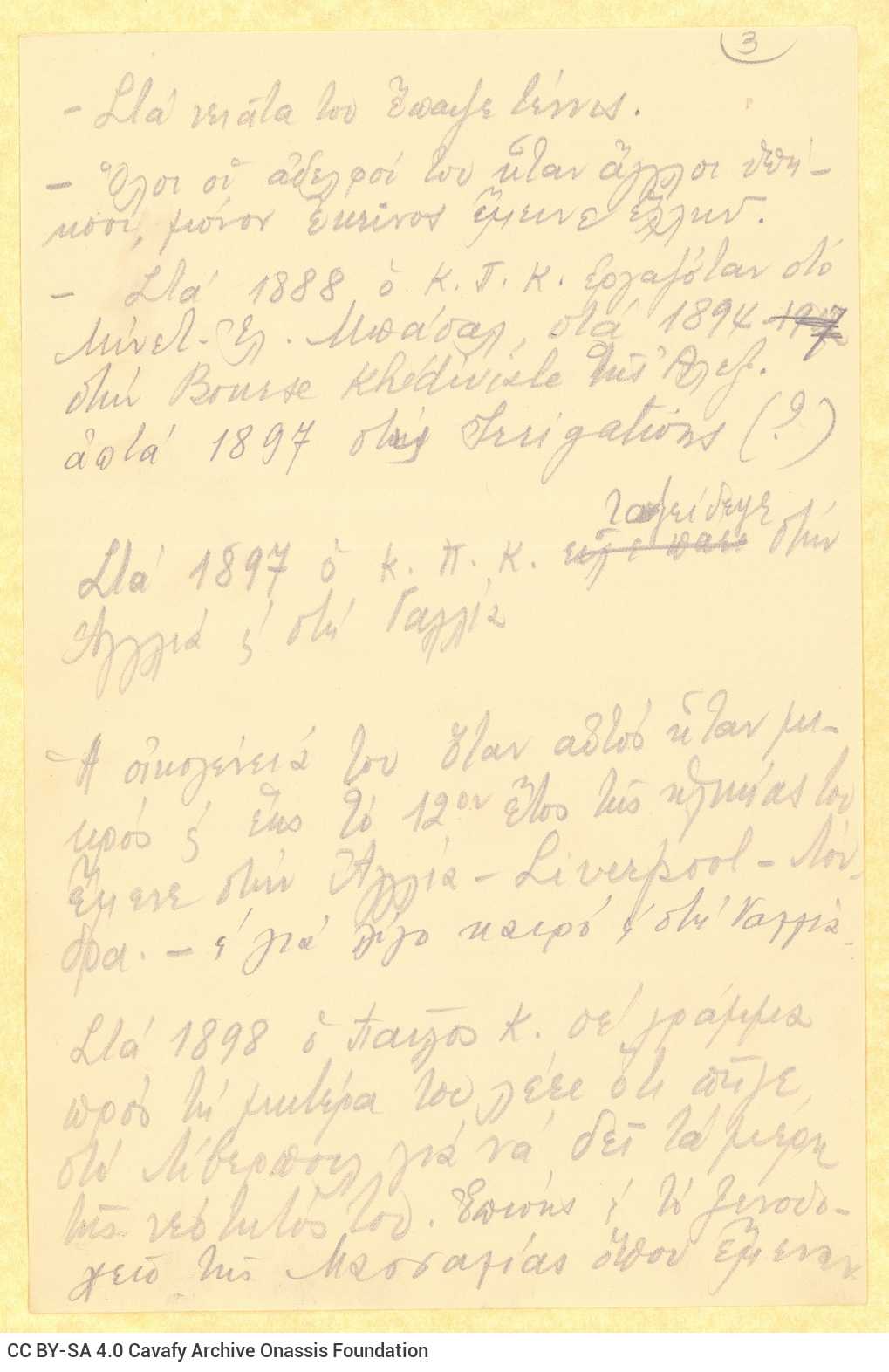 Σημειώσεις για την οικογένεια του ποιητή περιέχει και το τεκμήριο GR-OF CA SING-S01-F01-0013 (1629), https://cavafy.onassis.org/el/object/u-414/, στο οποίο επίσης γίνονται αναφορές σε συνήθειες και ασχολίες του ίδιου του ποιητή. Εντοπίζονται κάποιες ανακρίβειες, όπως η χρονολογία γέννησης του ποιητή (1865 αντί για 1863). Συχνά, οι παρατιθέμενες πληροφορίες έχουν ανεκδοτολογικό χαρακτήρα και αποτυπώνουν περιστατικά της καθημερινότητας, όπως για παράδειγμα: