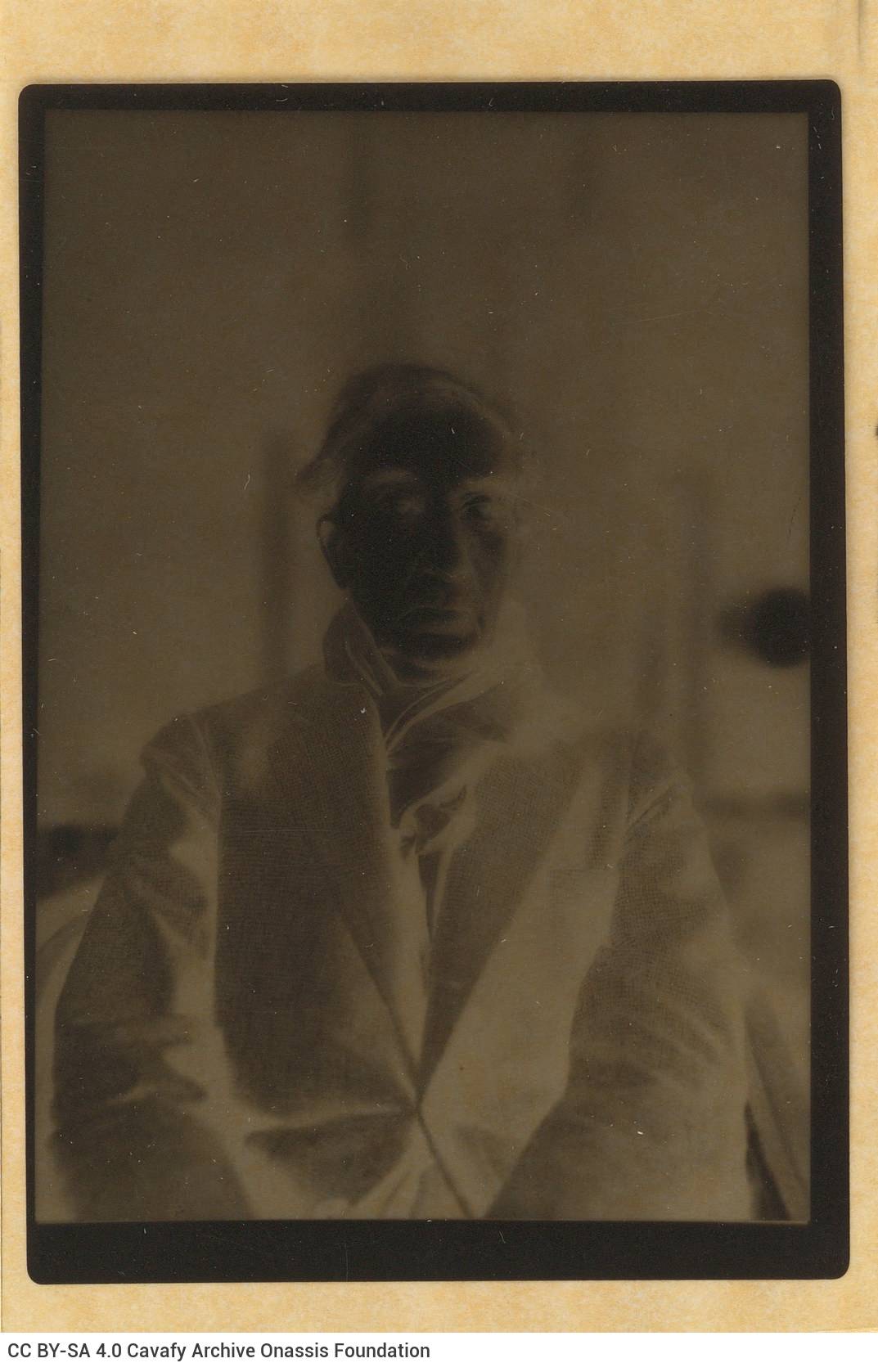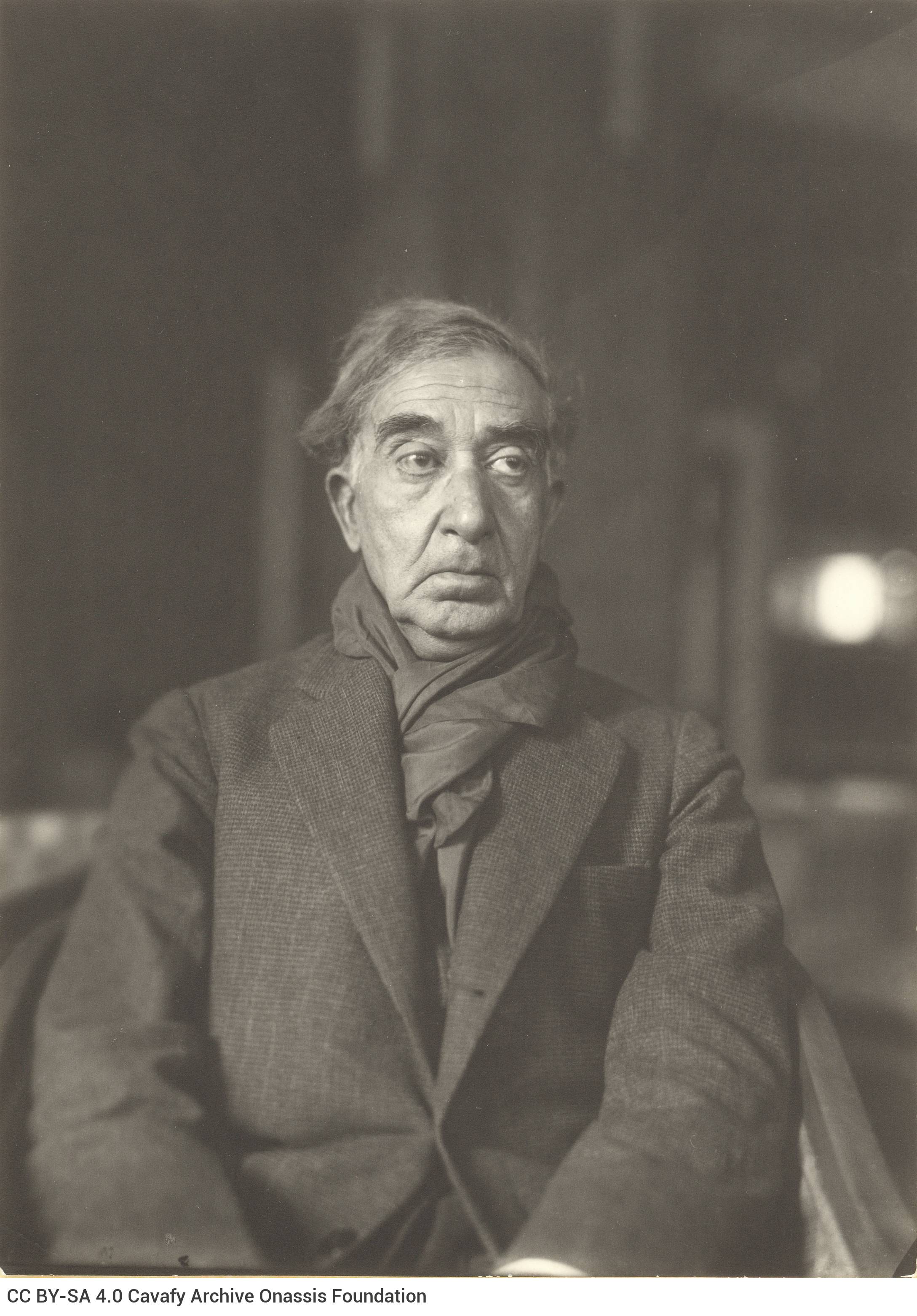 Το 1932, ο Καβάφης ταξιδεύει στην Αθήνα για τελευταία φορά. Θα μείνει εκεί περίπου 4 μήνες (Ιούλιος-Οκτώβριος 1932). Εισάγεται στο νοσοκομείο του Ερυθρού Σταυρού, όπου υποβάλλεται σε εγχείρηση τραχειοτομίας, με αποτέλεσμα να χάσει οριστικά τη φωνή του. Η παρακάτω φωτογραφία χρονολογείται κατά το διάστημα που ο ποιητής αναρρώνει από την επέμβαση. Έχει τραβηχτεί από τον φωτογράφο Κυριάκο Παγώνη στο εργαστήριο του γλύπτη Μιχαήλ Τόμπρου και σώζεται στο αρχείο Καβάφη, στο τεκμήριο GR-OF CA CA-SF02-S03-F26-SF001-0014 (1947), https://cavafy.onassis.org/el/object/ztxc-ehc8-4a4f/ (μπορείτε να δείτε το αρνητικό της ίδιας φωτογραφίας στο τεκμήριο GR-OF CA CA-SF02-S03-F26-SF001-0015 [1948], https://cavafy.onassis.org/el/object/qcry-2stn-2nhb/).