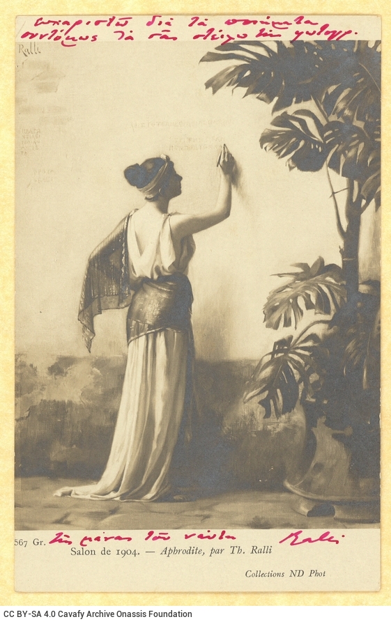 Αντίστοιχα, στο τεκμήριο GROF CA CASF02-S01-SS01-F18-SF003-0021 (1241) https://cavafy.onassis.org/el/authority/peopleel/rallitheodoreiel/, μπορεί κανείς να δει δύο καρτ ποστάλ του Θεόδωρου Ράλλη προς τον Κ. Π. Καβάφη, οι οποίες απεικονίζουν έργα του ζωγράφου (AphroditeLes Dernières lueurs) από το Salon του 1904. Η μία καρτ ποστάλ φέρει χειρόγραφο ευχαριστήριο σημείωμα του καλλιτέχνη προς τον Καβάφη και η άλλη την υπογραφή του στην πλευρά της εικόνας.2
