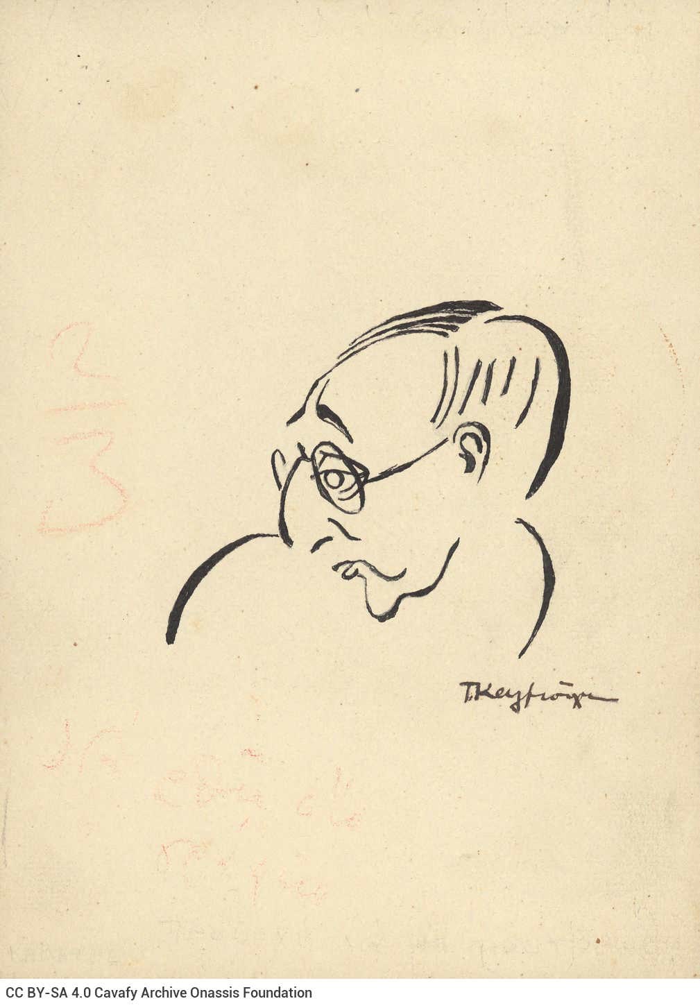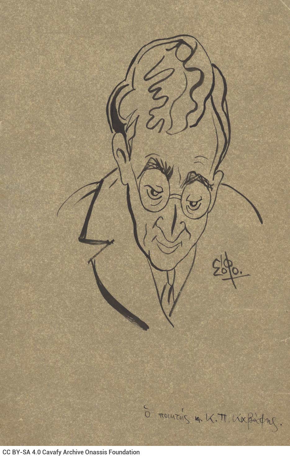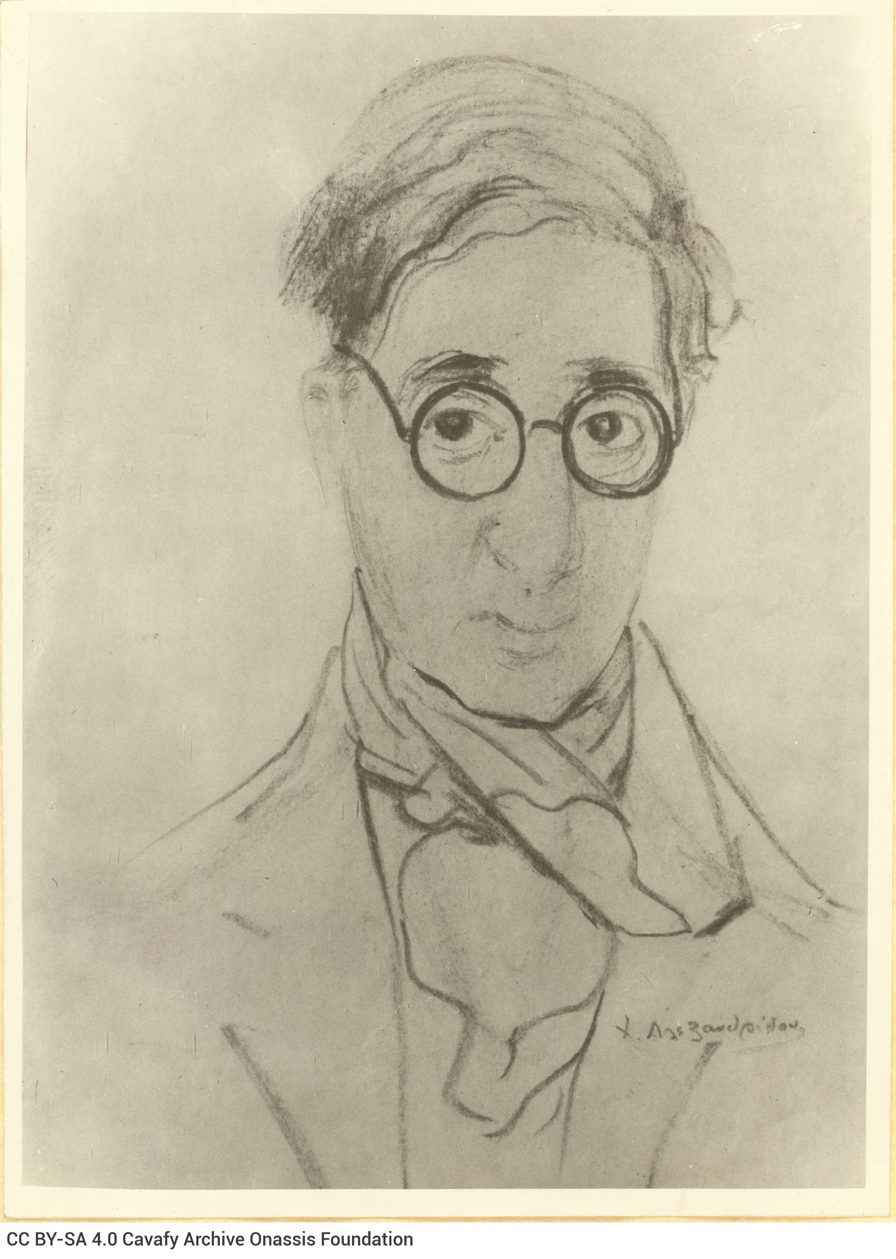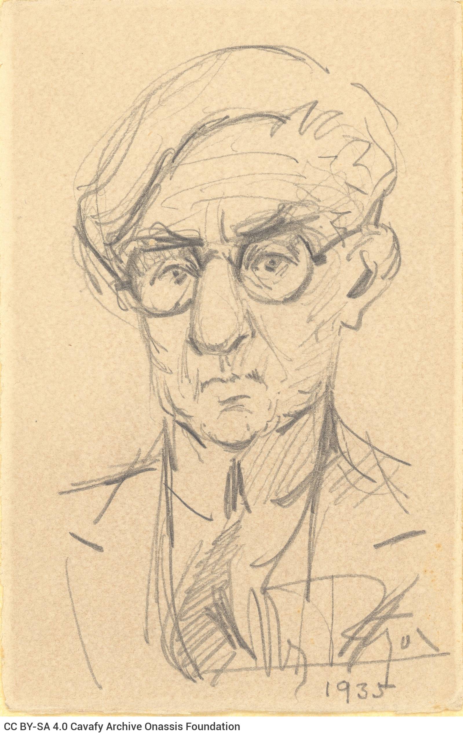 Προγενέστερο είναι το πορτρέτο του Καβάφη από τον Μιμ Παπ [Ευθύμη Παπαδημητρίου], που χρονολογείται το 1926: GR-OF CA CA-SF01-S04-F16-0006 (2031), https://cavafy.onassis.org/el/object/3h6q-efy2-ccp5/. Στο αρχείο εντοπίζεται και δεύτερο έργο του Μιμ Παπ, που όμως δεν φέρει χρονολογία: GR-OF CA SING-S01-F05-0005 (2038), https://cavafy.onassis.org/el/object/9eds-gn5p-e5hk/.