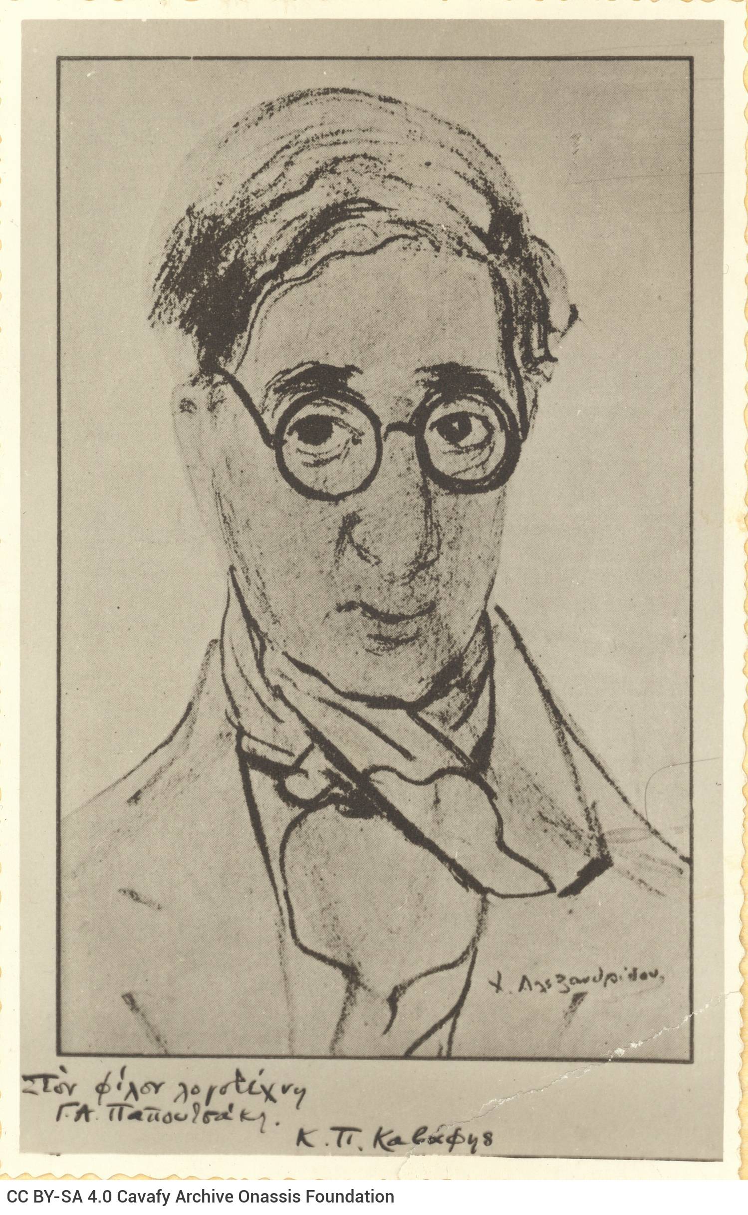 Το τεκμήριο GR-OF CA SING-S01-F05-0003 (2035), https://cavafy.onassis.org/el/object/hazw-p55n-d9wp/, που αποτελεί επίσης φωτογραφία του συγκεκριμένου πορτρέτου, φέρει ιδιόχειρη αφιέρωση του ποιητή στον μεταφραστή του, Γιώργο Παπουτσάκη.
