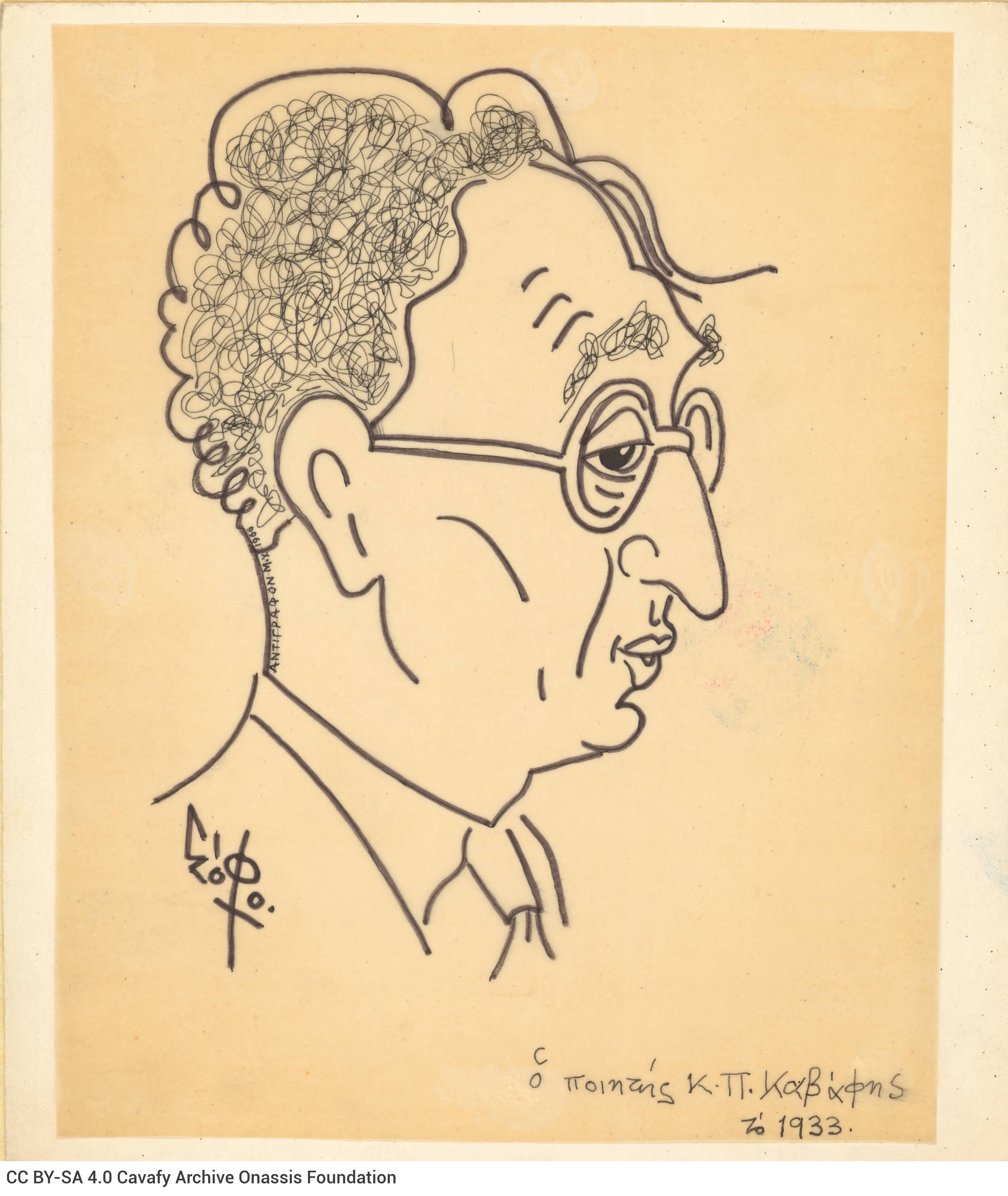 Τέλος, στην ψηφιακή συλλογή του Αρχείου Καβάφη εντοπίζονται δύο πορτρέτα φιλοτεχνημένα από τον Σόφο (Σοφοκλή Αντωνιάδη), γνωστό ζωγράφο και γελοιογράφο, που δραστηριοποιήθηκε στην Ελλάδα και στην Αίγυπτο. Το τεκμήριο GR-OF CA SING-S01-F05-0002 (2042), https://cavafy.onassis.org/el/object/kz8s-grdd-ggr5/, απεικονίζει τον Καβάφη σε κατατομή, το 1933 (εντούτοις, το τεκμήριο χρονολογείται το 1966, καθώς αποτελεί αντίγραφο του αρχικού σχεδίου).