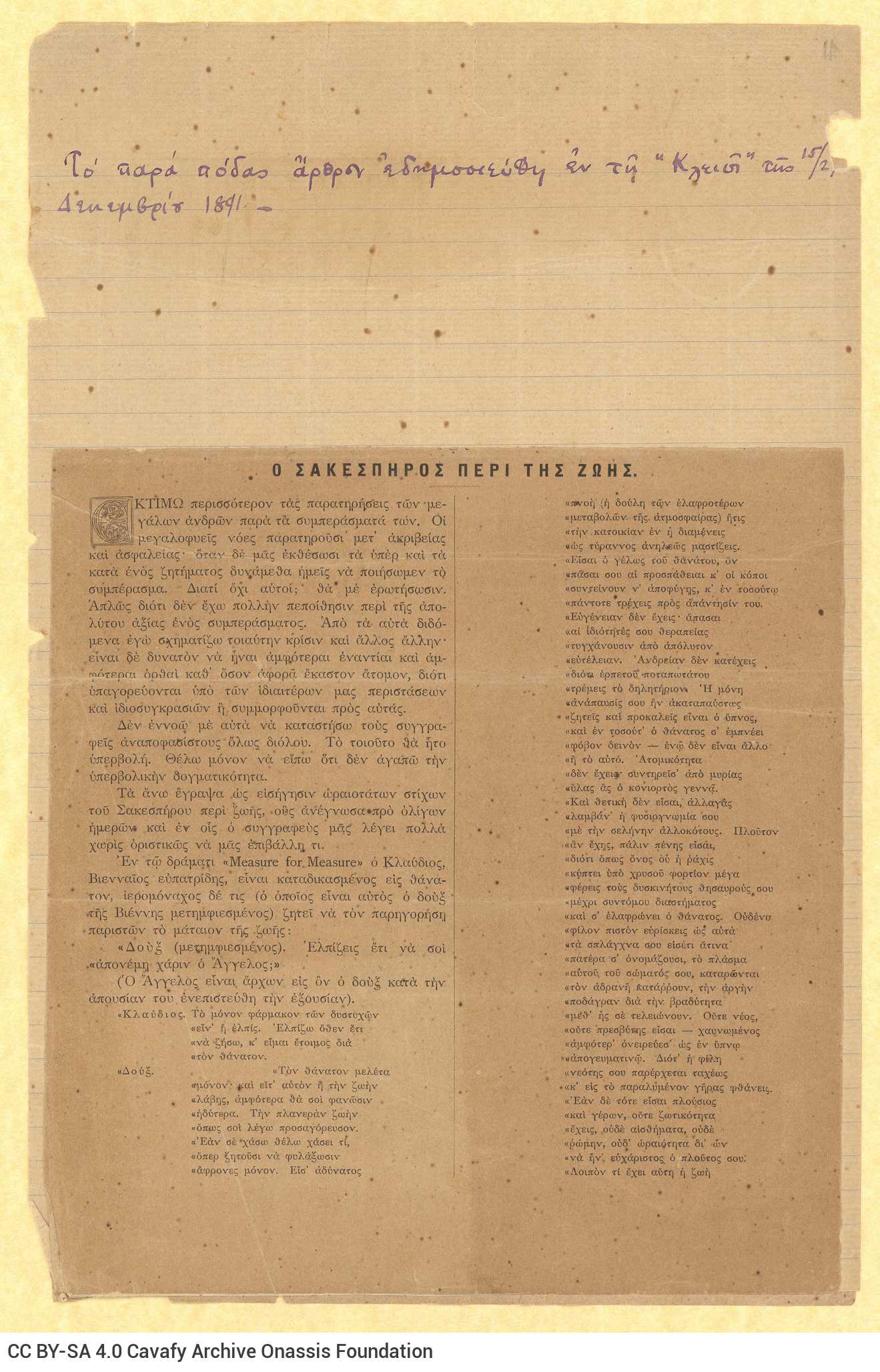 -«O Σακεσπήρος περί της ζωής» (1891): GR-OF CA CA-SF02-S02-F25-SF007-0005 (1662), https://cavafy.onassis.org/el/object/bkyg-w278-3s5m/.