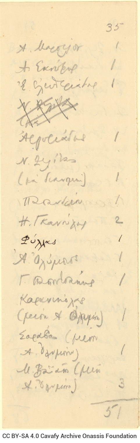 Παράλληλα, πληροφορίες για τον αναγνώστη Καβάφη αντλούμε και από σημειώματα-καταλόγους του ποιητή. Το τεκμήριο GR-OF CA CA-SF01-S03-F09-0025 (373), https://cavafy.onassis.org/el/object/h365-ennm-z35t/, αποτελεί κατάλογο εντύπων, όπου διακρίνονται κυρίως αναφορές σε ελληνικά, αγγλικά και γαλλικά έντυπα (Αττικόν Μουσείον, Φιλολογική Κοσμόπολις, The Sketch, The Cornhill Magazine, Illustrated London Herald). Παρότι το τεκμήριο δεν φέρει χρονολογία, μπορεί να τοποθετηθεί με σχετική ασφάλεια στα έτη 1888-1901.