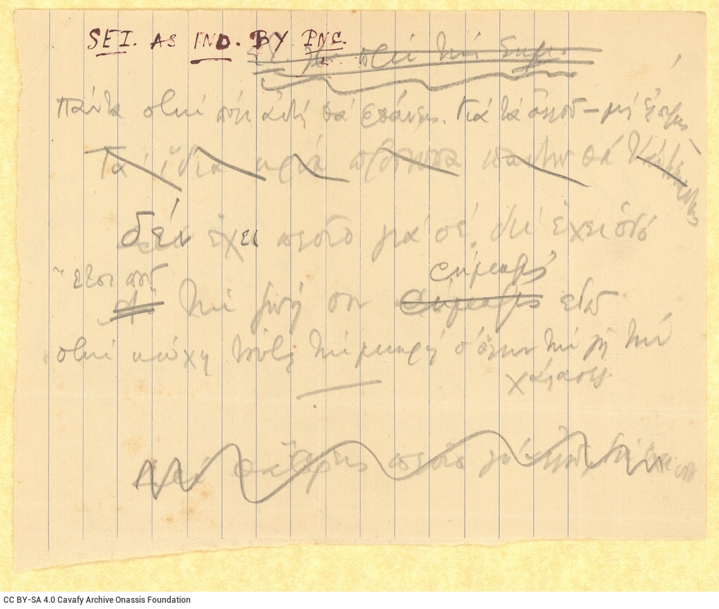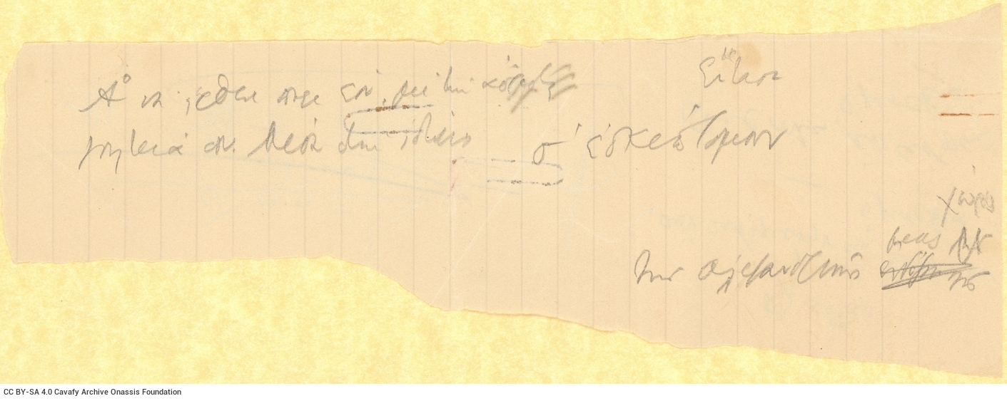 Πρόκειται για χειρόγραφο σχεδίασμα στίχων του ποιήματος «Η Πόλις» σε δύο κομμάτια διαγραμμισμένου χαρτιού. Παρατηρούνται διαγραφές, διορθώσεις και βραχυγραφίες. Ιδιαίτερα ευδιάκριτες είναι δύο διαγραφές στην προτελευταία σειρά. Ο ποιητής φαίνεται να αντικαθιστά δύο λέξεις, για να καταλήξει στον γνωστό στίχο: «Έτσι που τη ζωή σου ρήμαξες». Παράλληλα, διαγράφει έναν ολόκληρο στίχο στη δεύτερη γραμμή. Ο στίχος αυτός δεν βρίσκεται στην τελική εκδοχή του ποιήματος.