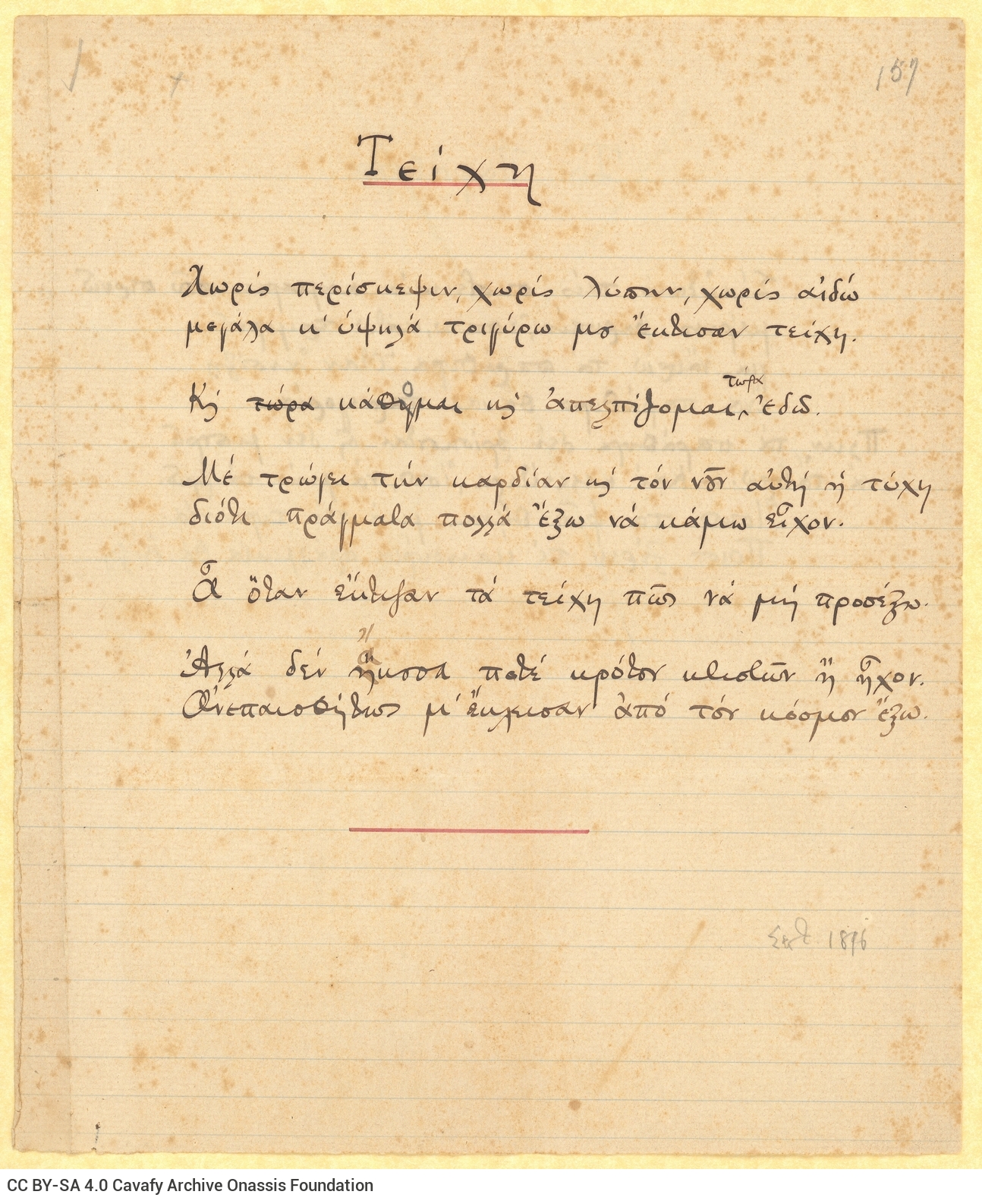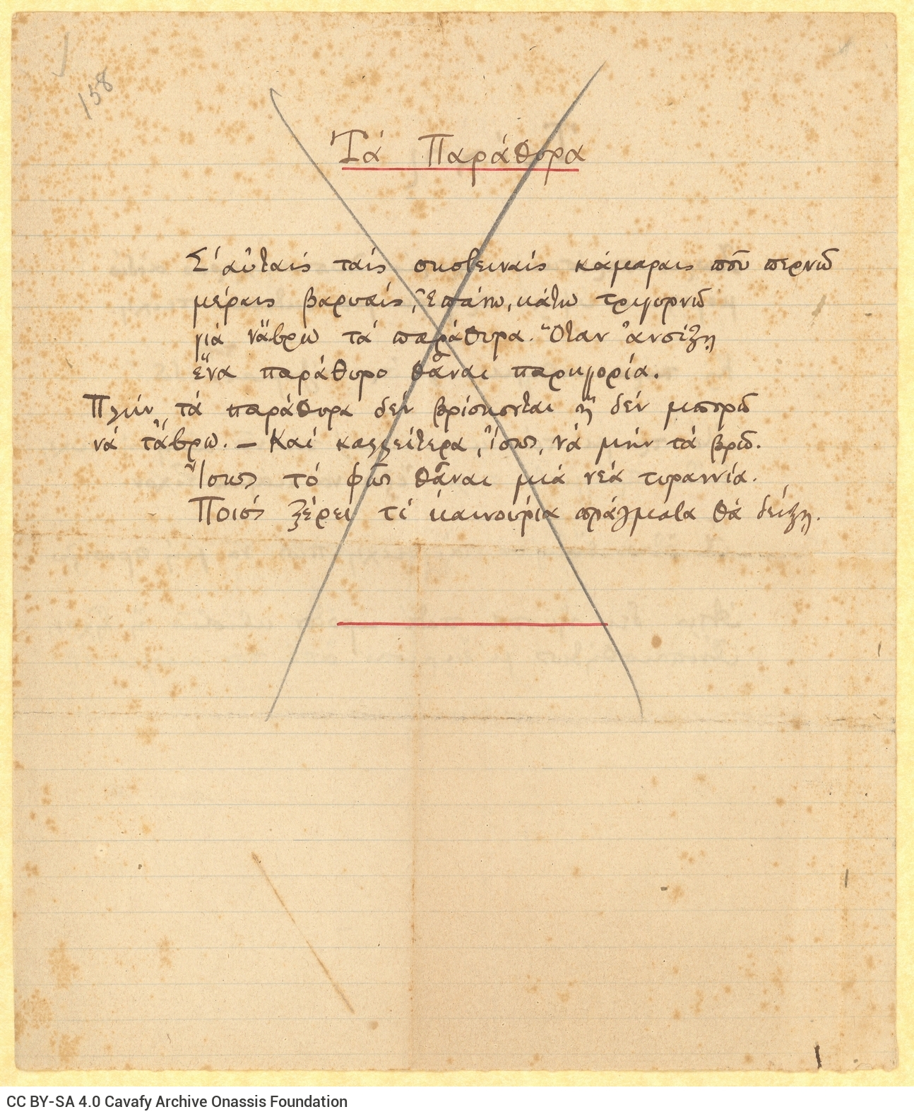 Το τεκμήριο GR-OF CA CA-SF01-S01-F01-SF001-0039 (842), https://cavafy.onassis.org/el/object/cmyq-ybk8-desg/, περιλαμβάνει χειρόγραφα σχεδιάσματα των ποιημάτων «Τείχη» και «Τα Παράθυρα».
