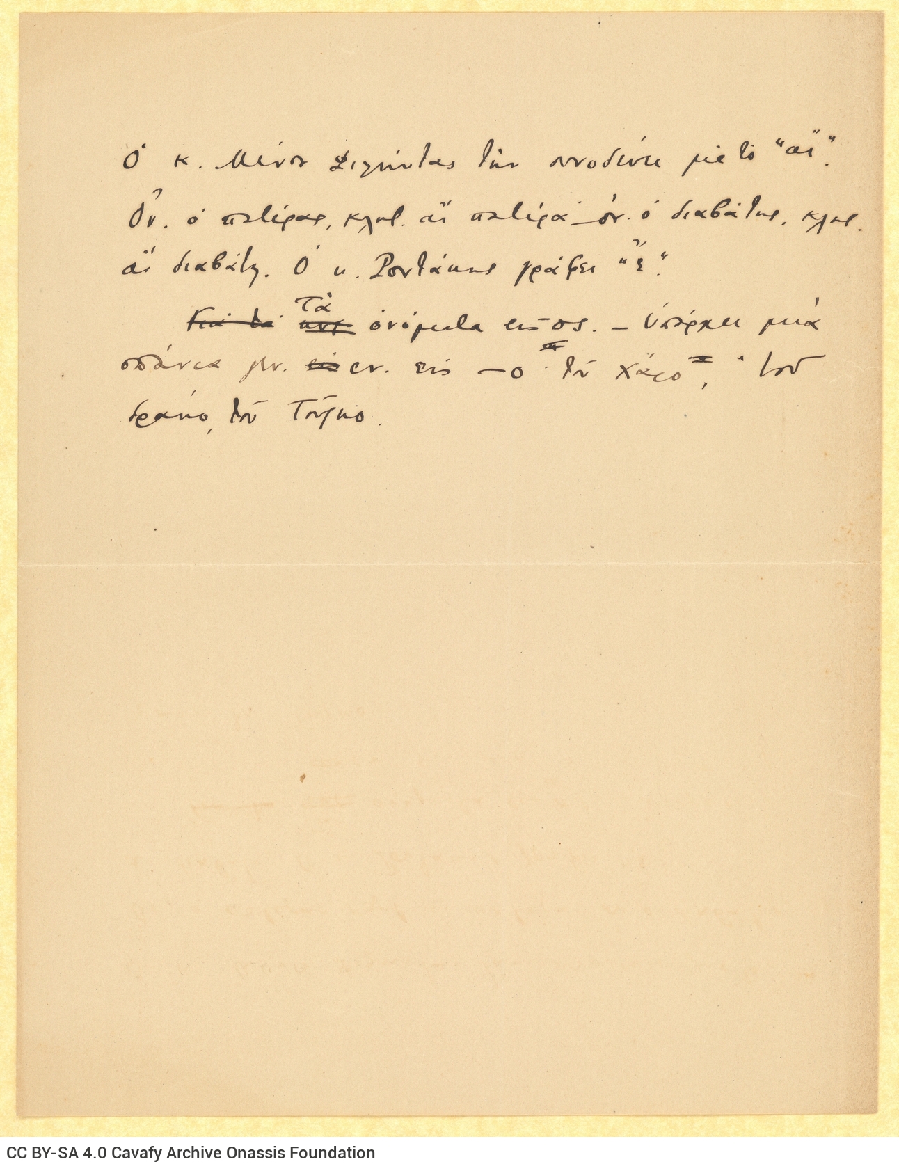 Οι γλωσσικές σημειώσεις του ποιητή αφορούν την καταγραφή γλωσσικών τύπων και παραλλαγών αλλά και σχόλια σχετικά με τον χειρισμό της γλώσσας από άλλους συγγραφείς. Για παράδειγμα, στο τεκμήριο GR-OF CA CA-SF01-S03-F08-0007 (626), https://cavafy.onassis.org/el/object/u-171/, ο Καβάφης σημειώνει τη διαφορετική γραφή κάποιας λέξης από τους Μένο Φιλήντα και Γεώργιο Ροντάκη. Η λέξη δεν διευκρινίζεται. Στο σημείωμα διαβάζουμε: «Ο κ. Μένος Φιλήντας την συνοδεύει με το “αι”», γράφει, ενώ «Ο κ. Ροντάκης γράφει “ε”».