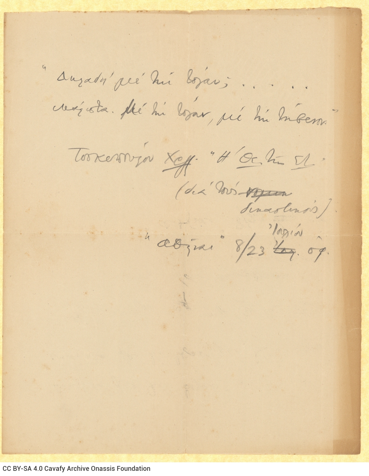Παρόμοιας θεματολογίας είναι και το τεκμήριο GR-OF CA CA-SF01-S03-F08-0006 (622), https://cavafy.onassis.org/el/object/u-168/, όπου ο Καβάφης καταγράφει παραθέματα και πληροφορίες σε σχέση με τη λέξη «τόγα». Διακρίνεται παραπομπή στην εφημερίδα Αθήναι, σε φύλλο του Ιουλίου του 1909.