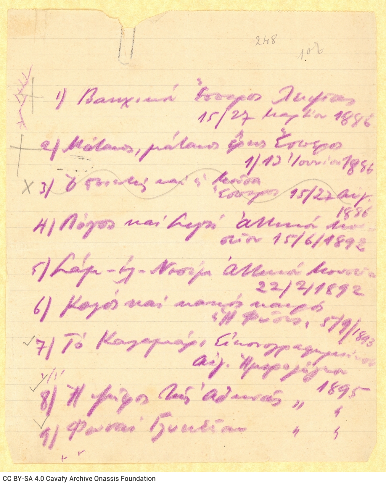 Μελετώντας την πρώτη σελίδα του συγκεκριμένου τεκμηρίου (Λήψη 1), παρατηρούμε αναφορά στην παραπάνω δημοσίευση: το ποίημα «Βακχικόν» δημοσιεύτηκε στις 15/27 Μαρτίου του 1886. Τη χρονιά αυτή, όπως μας πληροφορούν οι καταχωρίσεις με τους αριθμούς 2 και 3 του παραπάνω χειρόγραφου καταλόγου, ο Καβάφης δημοσίευσε δύο ακόμα ποιήματά του στο ίδιο περιοδικό. Το πρώτο είναι το ποίημα «Μάταιος, μάταιος Έρως», ενώ το δεύτερο έχει τίτλο «Ο Ποιητής και η Μούσα» και δημοσιεύεται στον Έσπερο στις 15/27 Αυγούστου του 1886, στο 126ο τεύχος του περιοδικού. Στο αρχείο Καβάφη σώζεται απόκομμα του εντύπου με το ποίημα «Ο Ποιητής και η Μούσα» και την υπογραφή «Κωνσταντίνος Φ. Καβάφης», ως τεκμήριο GR–OF CA CA–SF 02- S02-F25-SF007-0049 (1355), https:// cavafy.onassis.org/el/object/uu-23/ .