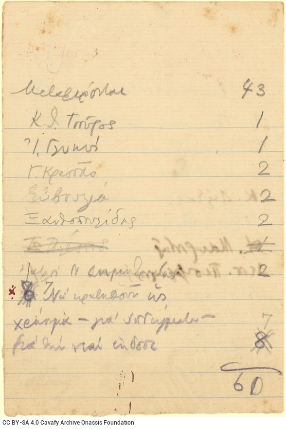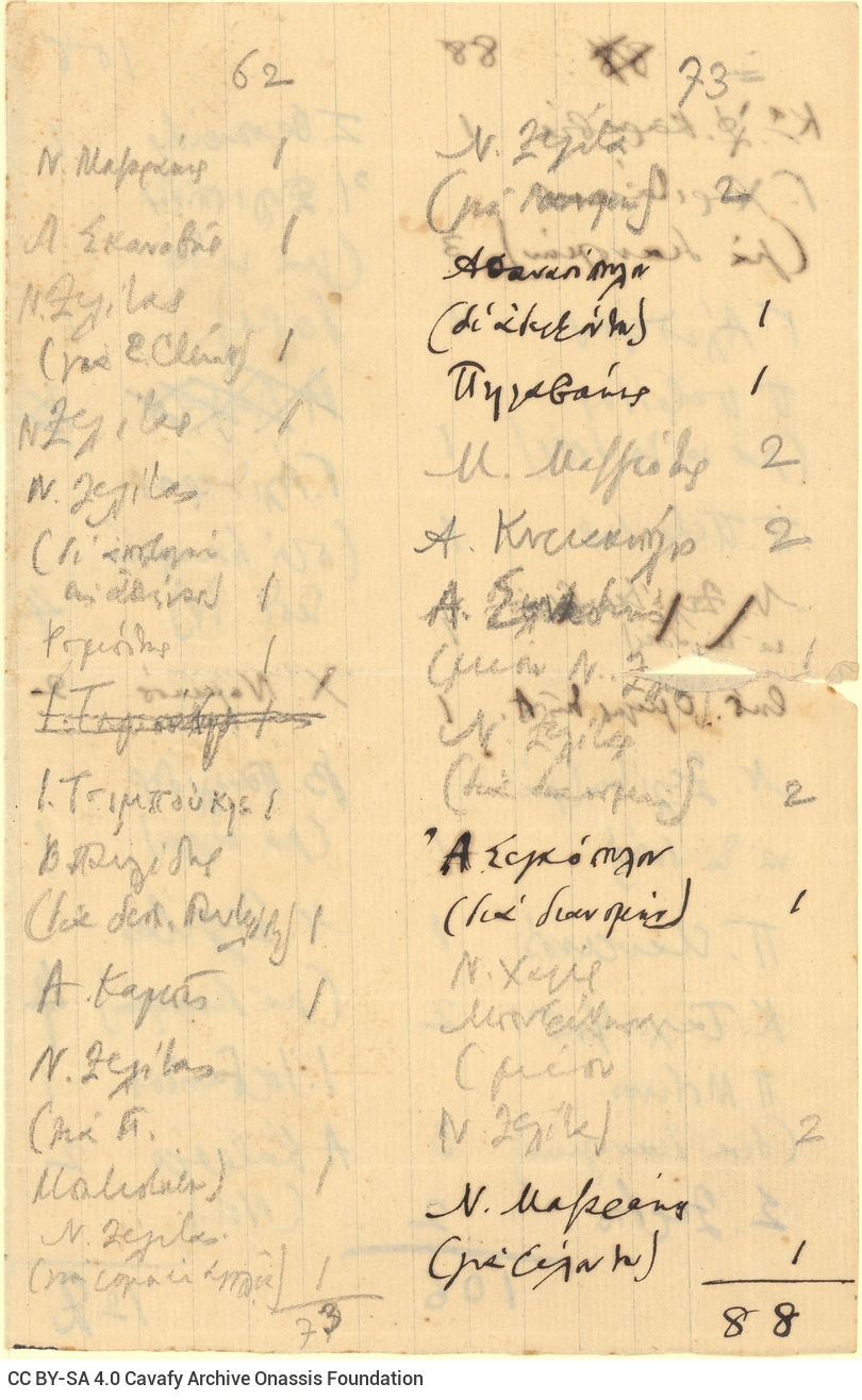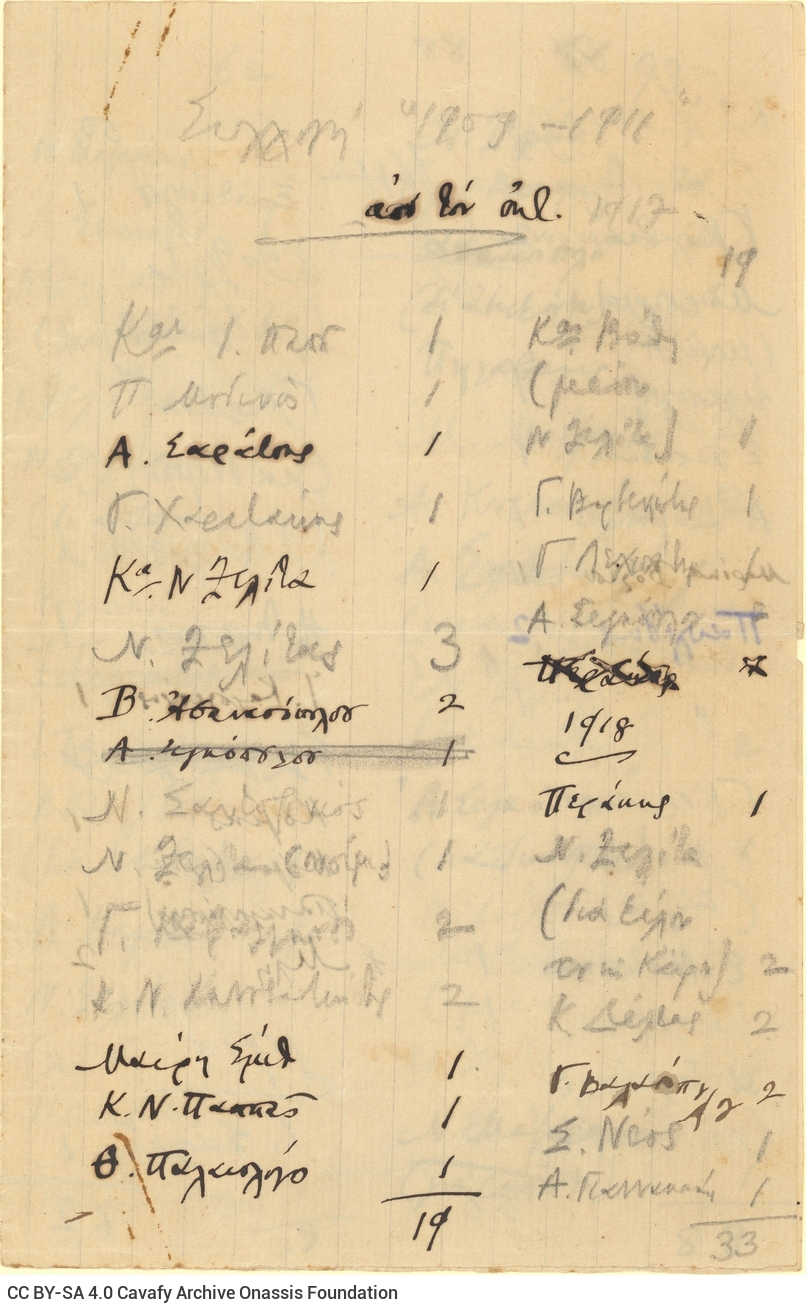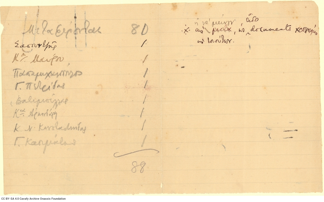 Ας δούμε το παράδειγμα του τεκμηρίου GR-OF CA CA-SF01-S01-F03-SF002-0001 (50), https://cavafy.onassis.org/el/object/1904/. Πρόκειται για τον κατάλογο διανομής του τεύχους του 1904/5. Ο εξασέλιδος κατάλογος καταγράφει αναλυτικά τα ονόματα των προσώπων που έλαβαν ένα ή περισσότερα αντίτυπα του τεύχους, ενώ η σημείωση στην πρώτη σελίδα μάς ενημερώνει ότι η διανομή «άρχισε Απρ. 1905».3
