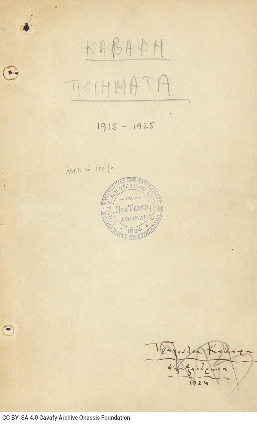 Η ίδια αναφορά εντοπίζεται και στη Λήψη 1, στο τεκμήριο GR-OF CA CA-SF01-S01-F02-SF001-0012 (2071), https://cavafy.onassis.org/el/object/u-1915-1925/, όπου μπορούμε να ξεφυλλίσουμε συλλογή αποτελούμενη από λυτά έντυπα φύλλα (Ποιήματα 1915-1925). Εδώ, ο τίτλος «Καβάφη Ποιήματα 1915-1925» φαίνεται να έχει γραφτεί από χέρι τρίτου και όχι από τον ποιητή, ενώ ο χαρακτηρισμός «Τραγούδια Καβάφη» εμφανίζεται στο κάτω δεξιά μέρος της σελίδας με διαφορετικό γραφικό χαρακτήρα. Η συλλογή φέρει επίσης και σφραγίδα του περιοδικού Νέα Τέχνη, στο εξώφυλλό της.