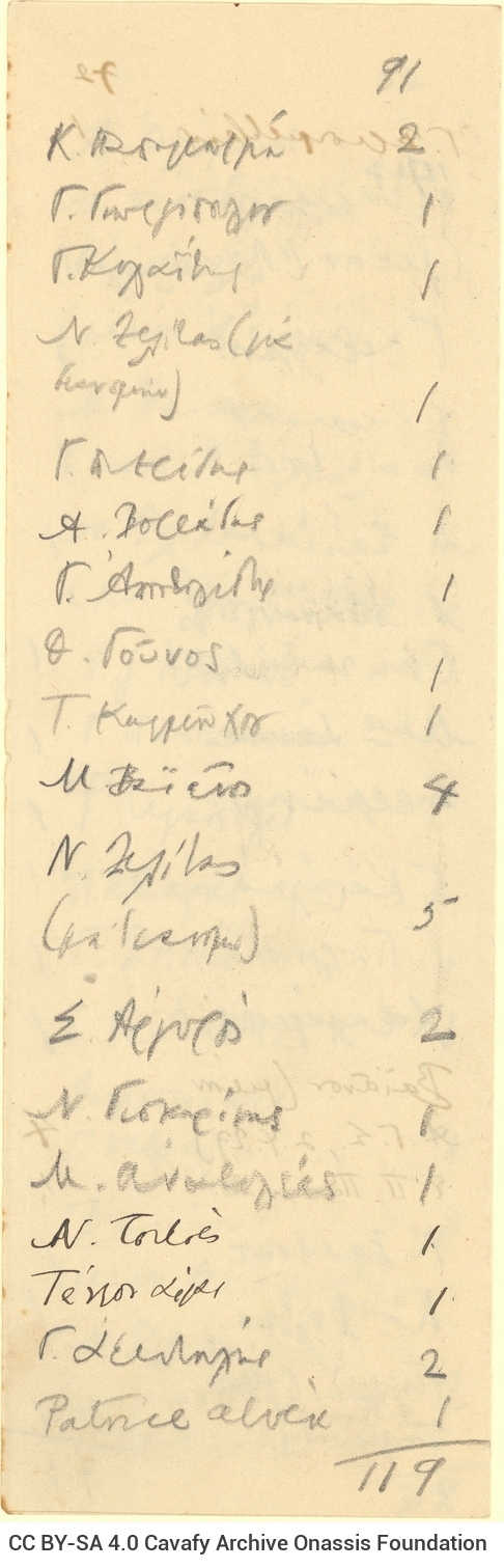από χειρόγραφο κατάλογο διανομής του ποιητή, όπου εμφανίζεται το όνομα του Τέλλου Άγρα (δεξιά).