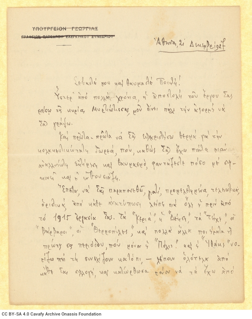 Το πρώτο φύλλο επιστολής του Τ. Άγρα στον ποιητή Κ. Π. Καβάφη (αριστερά) και σελίδα