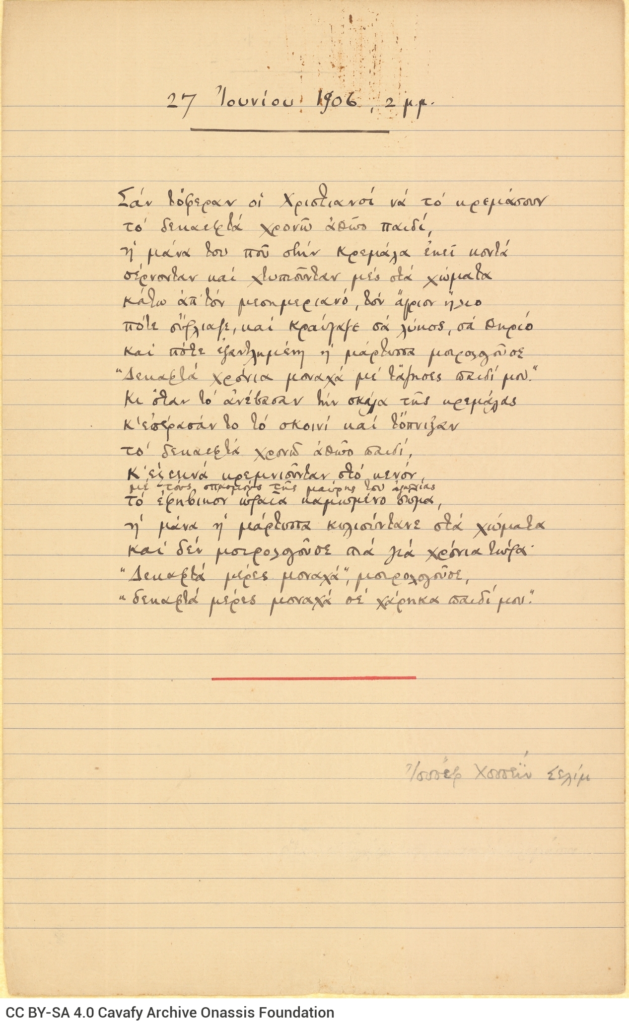 Η προφανέστερη αρχειακή ένδειξη του ενδιαφέροντος του ποιητή για ζητήματα της αιγυπτιακής επικαιρότητας είναι το ποίημα «27 Ιουνίου 1906, 2 μ.μ»., το οποίο αναφέρεται στην τραγωδία του Ντενσουάι και τον απαγχονισμό ενός Άραβα από τον αγγλικό στρατό. Τον Ιούνιο του 1906 πραγματοποιήθηκε συμπλοκή μεταξύ Άγγλων και φελάχων στο χωριό Ντενσουάι. Η δίκη που ακολούθησε κατέληξε στην απόφαση θανατικής ποινής για τέσσερις Αιγύπτιους άνδρες. Ένας από αυτούς ήταν ο Ιούσεφ Χουσεΐν Σελίμ, για τον οποίο έχει γραφτεί το καβαφικό ποίημα.
