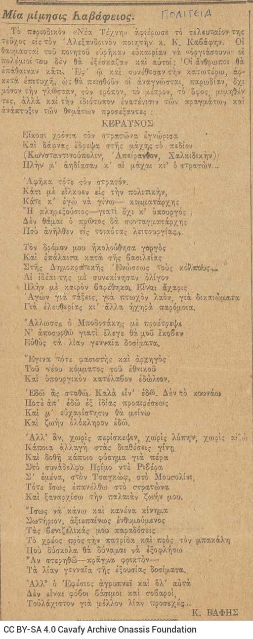 Το 1925, δημοσιεύεται στην αθηναϊκή εφημερίδα Πολιτεία η παρωδία με τον τίτλο «Κεραυνός», μαζί με σχετικό σημείωμα, το οποίο φέρει τον τίτλο «Μία μίμησης Καβάφειος». Η υπογραφή Κ. Βάφης συμπληρώνει τη χιουμοριστική προσέγγιση στο καβαφικό έργο. Στην περίπτωση αυτή, το απόκομμα της δημοσίευσης σώζεται στο αρχείο Καβάφη. Πρόκειται για το τεκμήριο GR-OF CA CA-SF02-S02-F25-SF007-0055 (1349), https://cavafy.onassis.org/el/object/uu-18/.