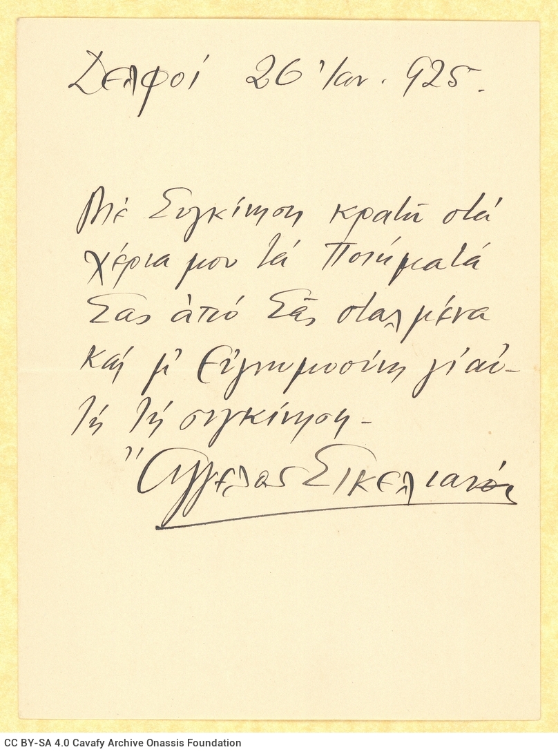 Ο Σικελιανός εκφράζει επίσης τον θαυμασμό του προς τον Καβάφη, ενώ επικοινωνεί για το ζήτημα αυτό και με τη Ρίκα Σεγκοπούλου. Το τεκμήριο GR-OF CA CA-SF02-S01-SS01-F18-SF003-0087 (691), https://cavafy.onassis.org/el/object/dxq5-95cw-xy3g/, αποτελεί επιστολή του Σικελιανού στον Καβάφη, του 1925. Ο Σικελιανός βρίσκεται στους Δελφούς και γράφει στον ποιητή για να του εκφράσει τον θαυμασμό του. Αντίστοιχα, το τεκμήριο GR-OF CA SING-S01-F02-SF002-0001 (715), https://cavafy.onassis.org/el/object/rt42-pq8w-wqwx/, είναι επιστολή του Σικελιανού στη Ρίκα Σεγκοπούλου, μέσω της οποίας προαναγγέλλει την άφιξή του στην Αίγυπτο το 1929.