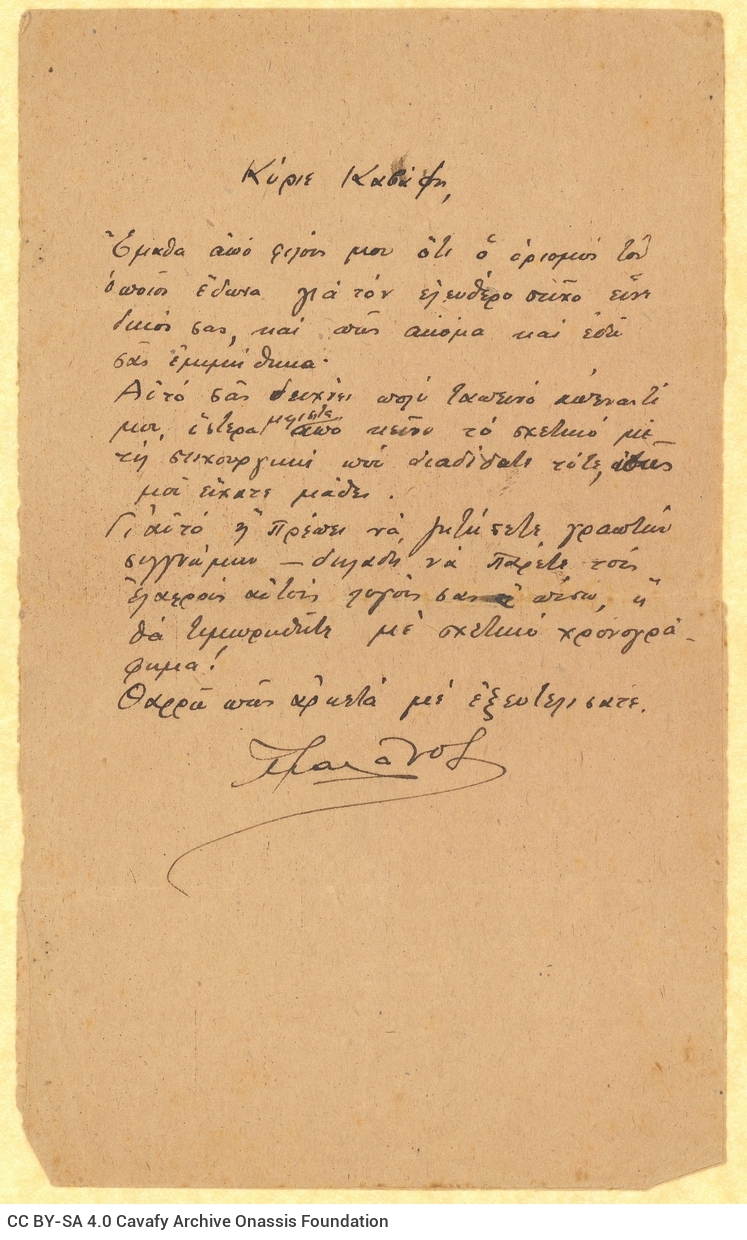 Συναφές είναι και το παρακάτω δείγμα· στο τεκμήριο GR-OF CA CA-SF02-S01-SS01-F18-SF003-0167 (1191), https://cavafy.onassis.org/el/object/u-u-104/, σε αχρονολόγητο σημείωμα του Μαλάνου προς τον Καβάφη, διαβάζουμε: