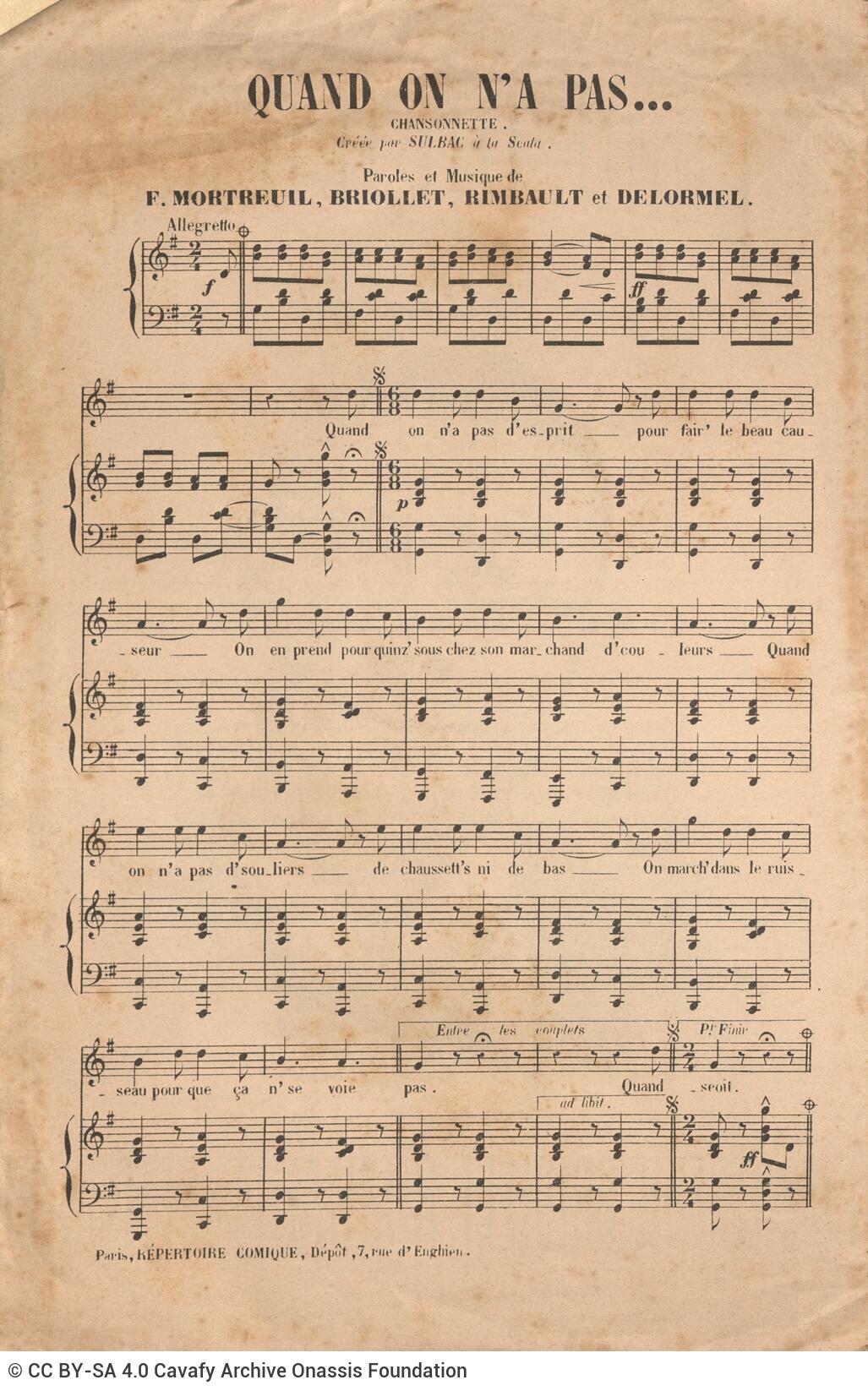 Τετρασέλιδο φυλλάδιο με την παρτιτούρα και τους στίχους του τραγουδιού “Quand on n’a pas” του Sulbac, υπό τη μουσική επιμέλεια των Félix Mortreuil, Paul Briollet, Eugène Rimbault και Lucien Delormel. Η μουσική παράσταση πραγματοποιήθηκε στο Alcazar d’Été στο Παρίσι.