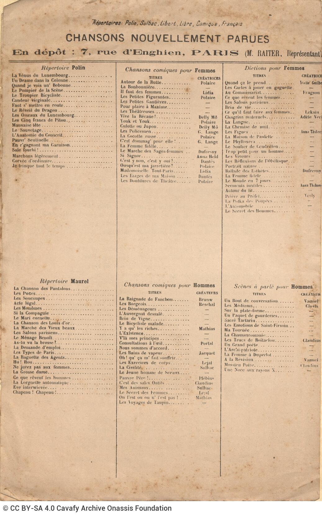 Édition Répertoire comique, «Φυλλάδιο “Quand on n’a pas”» (χ.χ.), Φυλλάδιο (διαφημιστικό), Αρχείο Κ. Π. Καβάφη του Ιδρύματος Ωνάση, GR-OF CA CA-SF02-S02-F25-SF009-0065 (2186), στο: Ψηφιακή Συλλογή του Αρχείου Καβάφη, επιμ. Ίδρυμα Ωνάση, Αθήνα, τελευταία ενημέρωση 01.10.2025: https://doi.org/10.26256/CA-SF02-S02-F25-SF009-0065.