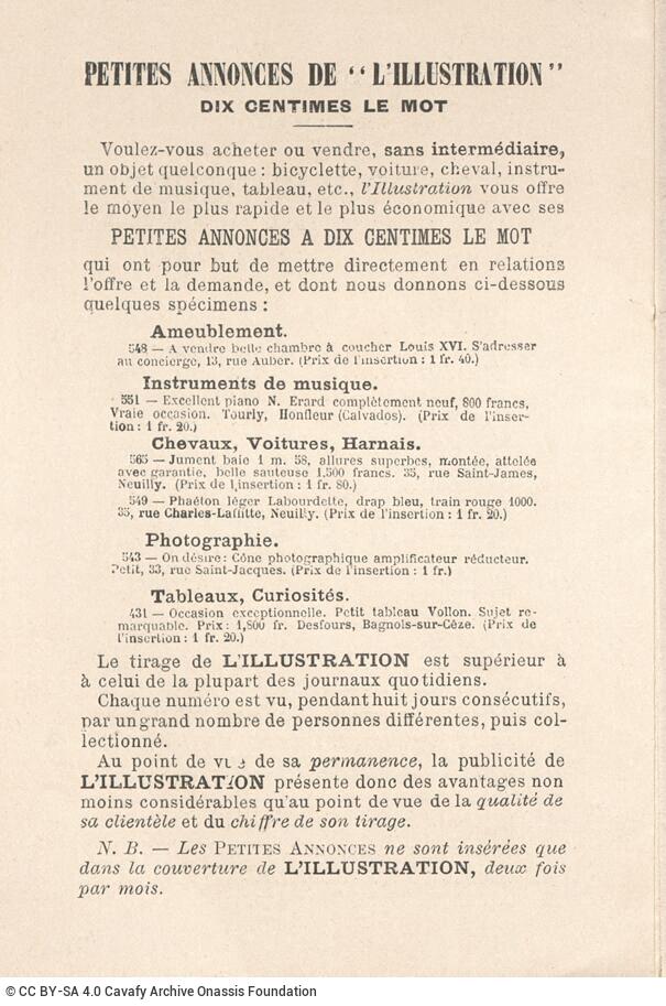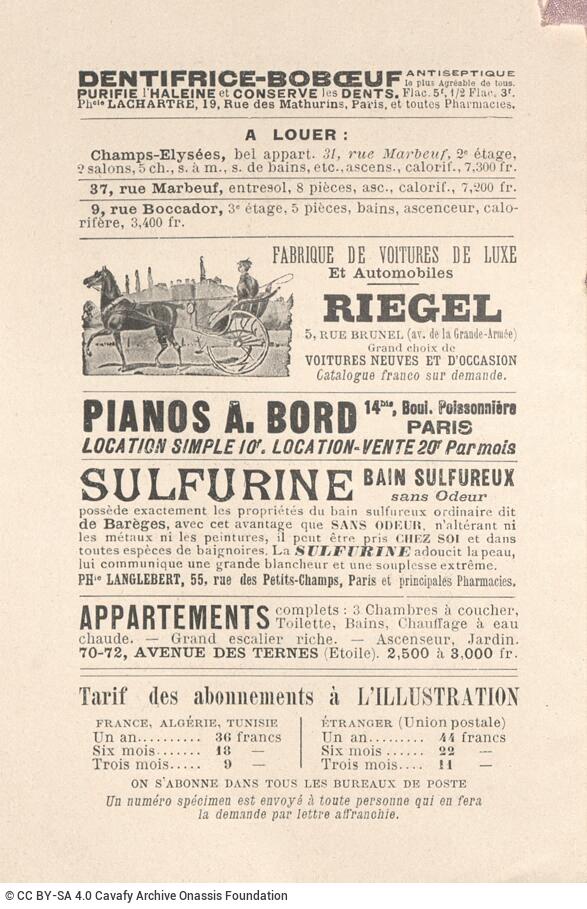 L’illustration (εφημερίδα), «Θεατρικό πρόγραμμα “L’illustration”» (17.05.1897), Θεατρικό πρόγραμμα, Αρχείο Κ. Π. Καβάφη του Ιδρύματος Ωνάση, GR-OF CA CA-SF02-S02-F25-SF009-0021 (2142), στο: Ψηφιακή Συλλογή του Αρχείου Καβάφη, επιμ. Ίδρυμα Ωνάση, Αθήνα, τελευταία ενημέρωση 01.10.2025: https://doi.org/10.26256/CA-SF02-S02-F25-SF009-0021.