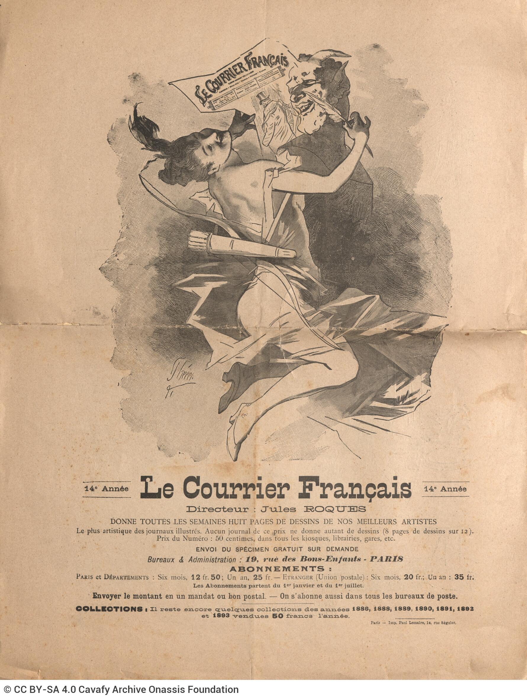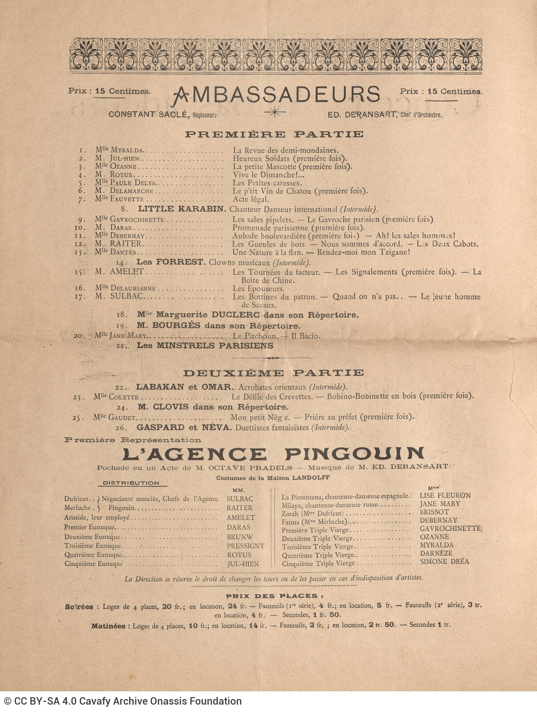 Le Courrier français (περιοδικό), «Πρόγραμμα θεαμάτων “Concert des Ambassadeurs”» (09.05.1897), Πρόγραμμα εκδήλωσης, Αρχείο Κ. Π. Καβάφη του Ιδρύματος Ωνάση, GR-OF CA CA-SF02-S02-F25-SF009-0015 (2136), στο: Ψηφιακή Συλλογή του Αρχείου Καβάφη, επιμ. Ίδρυμα Ωνάση, Αθήνα, τελευταία ενημέρωση 01.10.2025: https://doi.org/10.26256/CA-SF02-S02-F25-SF009-0015.