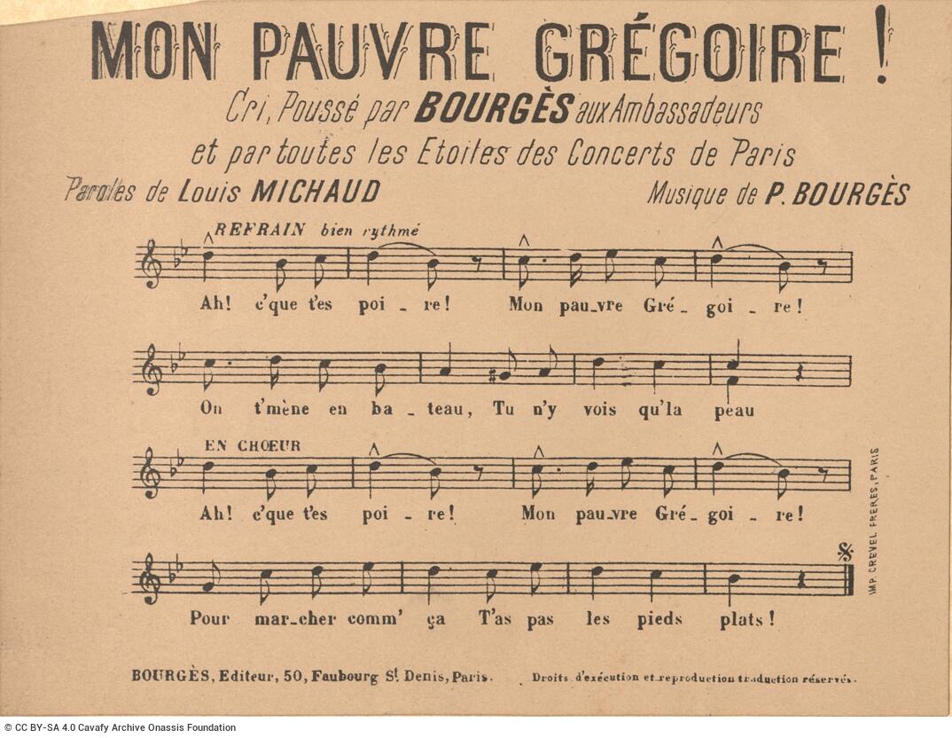 Τετρασέλιδο πρόγραμμα εκδηλώσεων του καφωδείου Concert des Ambassadeurs. Στο εξώφυλλο αναγράφεται ο εικονογράφος της αφίσας, Adolphe Willette. Το πρόγραμμα αποτελεί ένθετο του γαλλικού περιοδικού Le Courrier français, τα στοιχεία του οποίου αναγράφονται στο οπισθόφυλλο. Εντοπίζεται ένθετη παρτιτούρα του τραγουδιού “Mon pauvre Grégoire” εντός του προγράμματος, όπου αναφέρονται οι συνθέτες, Louis Michaud και P. Bourgès. Στο εξώφυλλο αναγράφεται η τιμή του προγράμματος: “Quinze Centimes”.