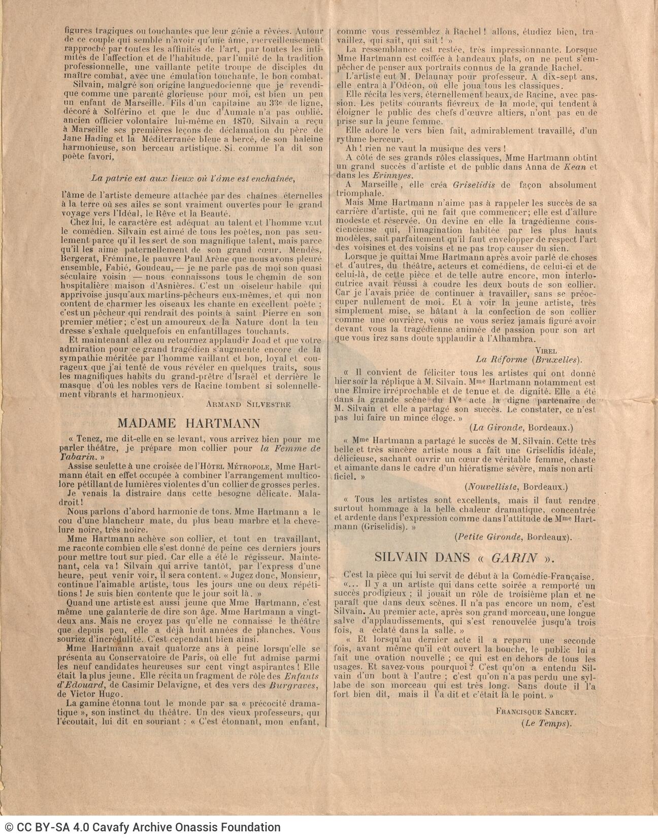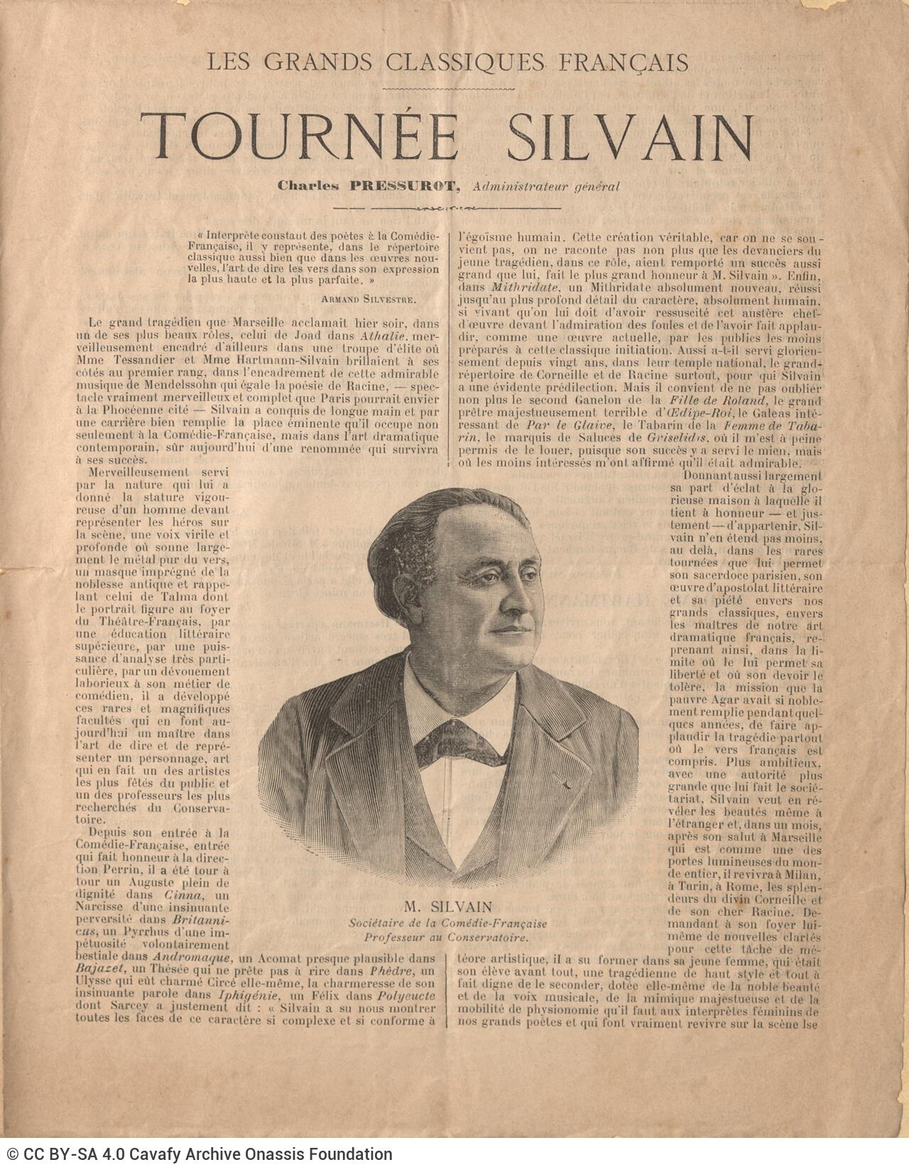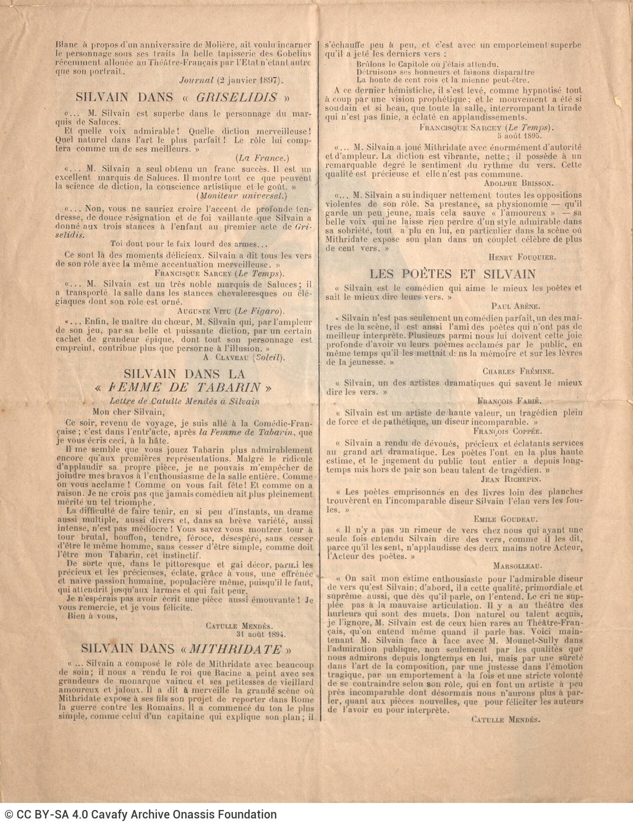 Four-page pamphlet of Comédie Française dedicated to the French actor Eugène Silvain. The pamphlet contains excerpts of reviews from important theatrical plays of the actor.