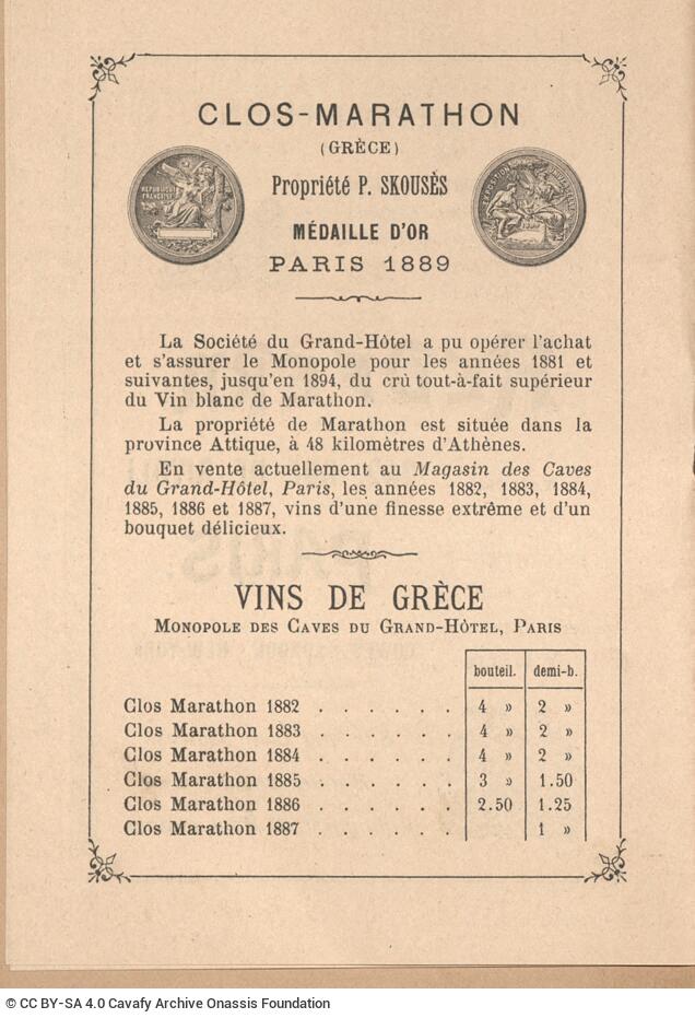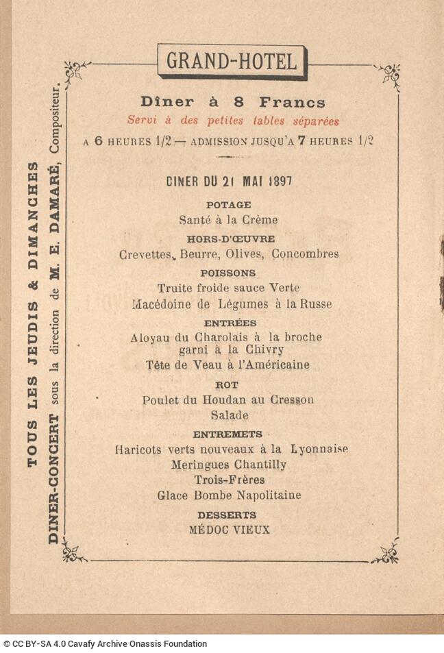 Grand Hôtel (Paris). “Menu of the Grand Hôtel, Paris”. (Menu) Card, 21.05.1897. GR-OF CA CA-SF02-S02-F25-SF009-0022 (2143), Onassis Foundation C. P. Cavafy Fonds. From The Digital Collection of the Cavafy Archive, edited by Onassis Foundation, Athens, last modified 01.10.2025. https://doi.org/10.26256/CA-SF02-S02-F25-SF009-0022.