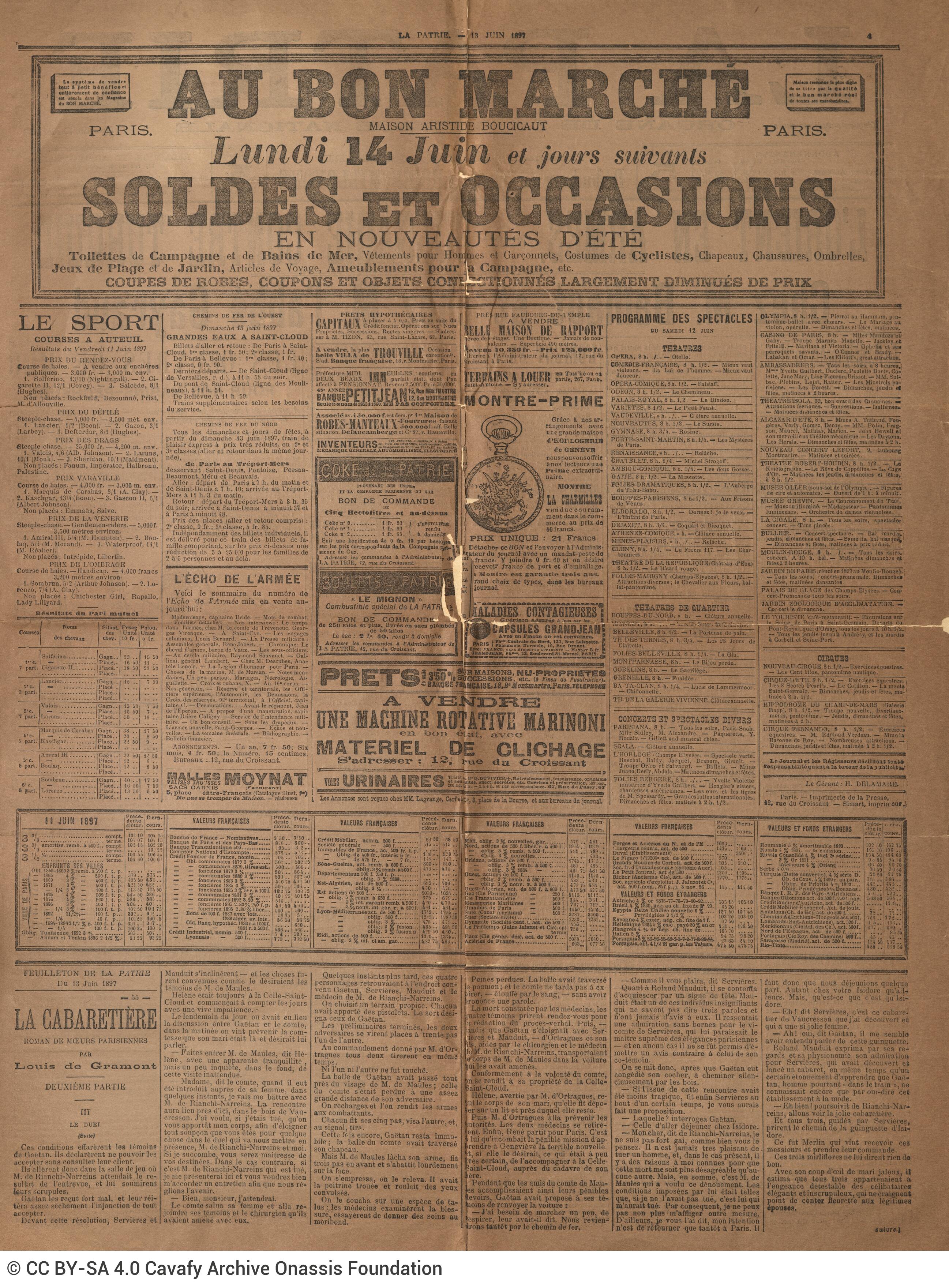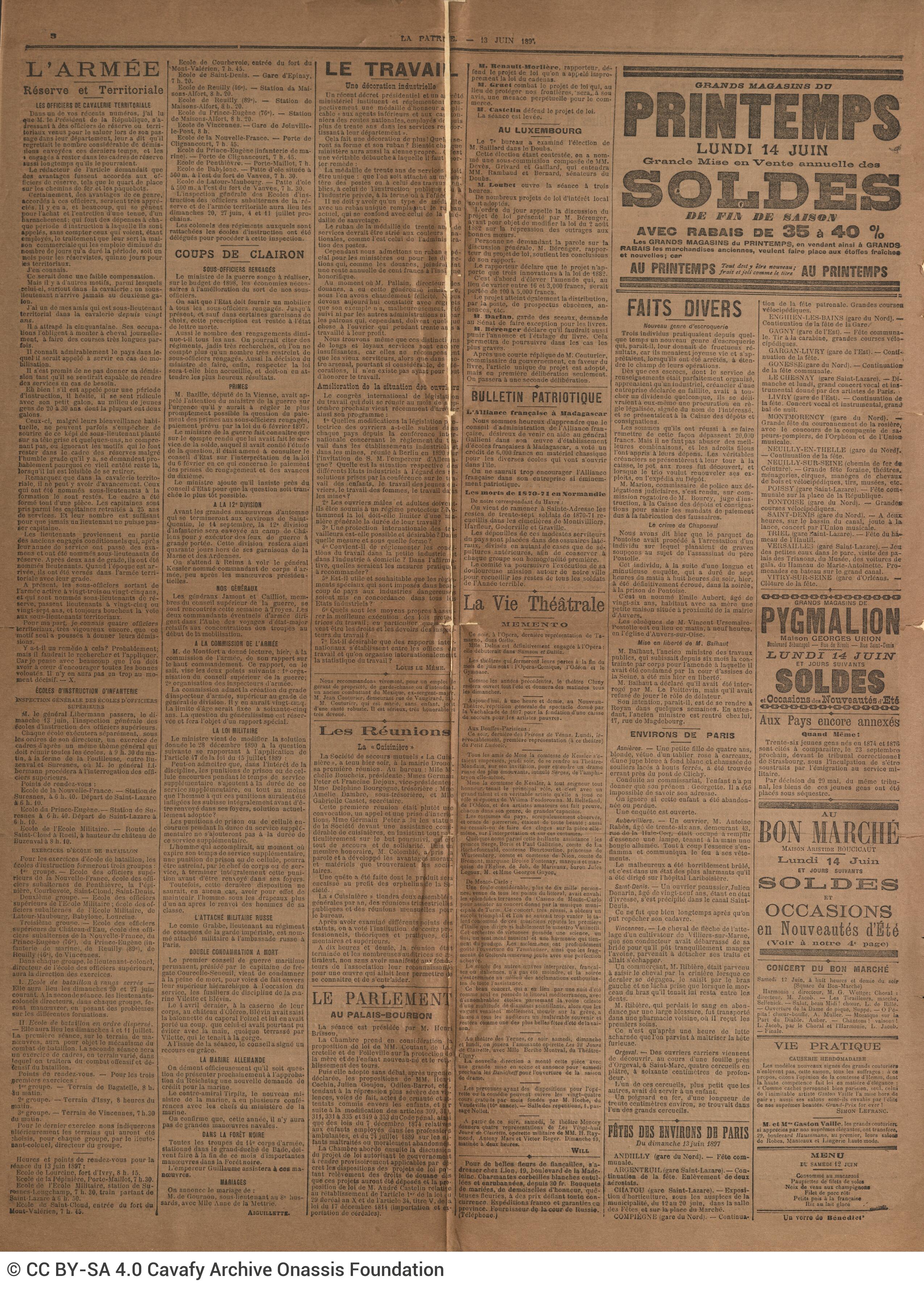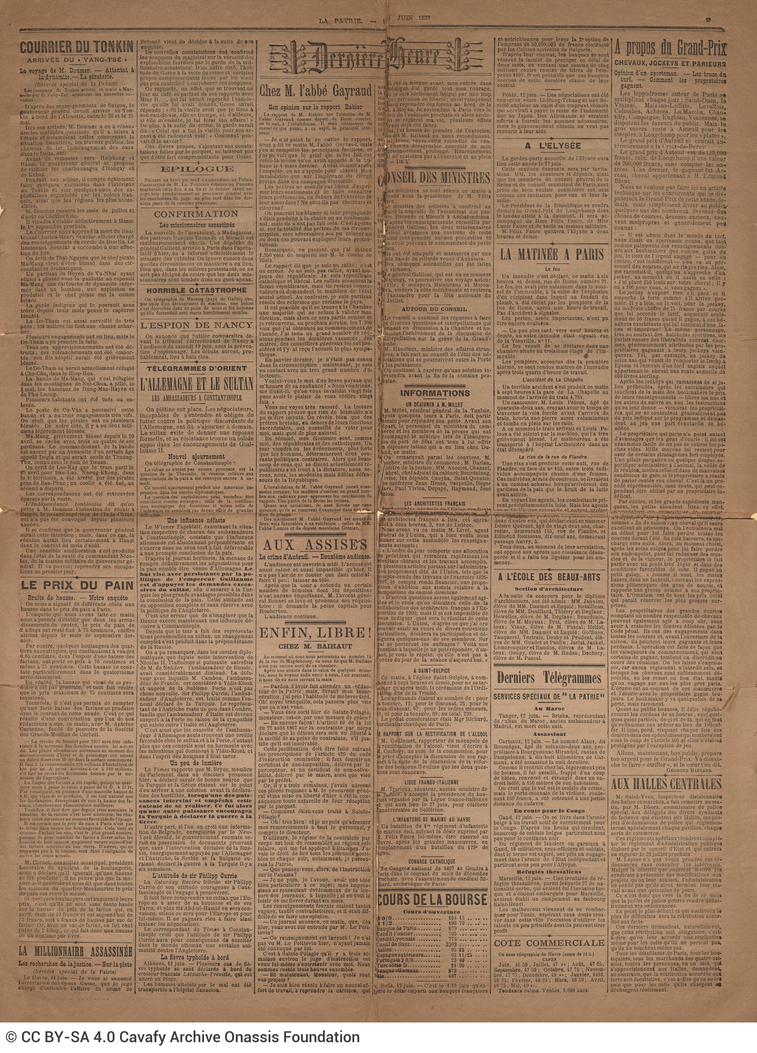 La Patrie (newspaper from Paris). “News. La Patrie”. Publication (newspaper issue), 13.06.1897. GR-OF CA CA-SF02-S02-F25-SF009-0041 (2162), Onassis Foundation C. P. Cavafy Fonds. From The Digital Collection of the Cavafy Archive, edited by Onassis Foundation, Athens, last modified 01.10.2025. https://doi.org/10.26256/CA-SF02-S02-F25-SF009-0041.