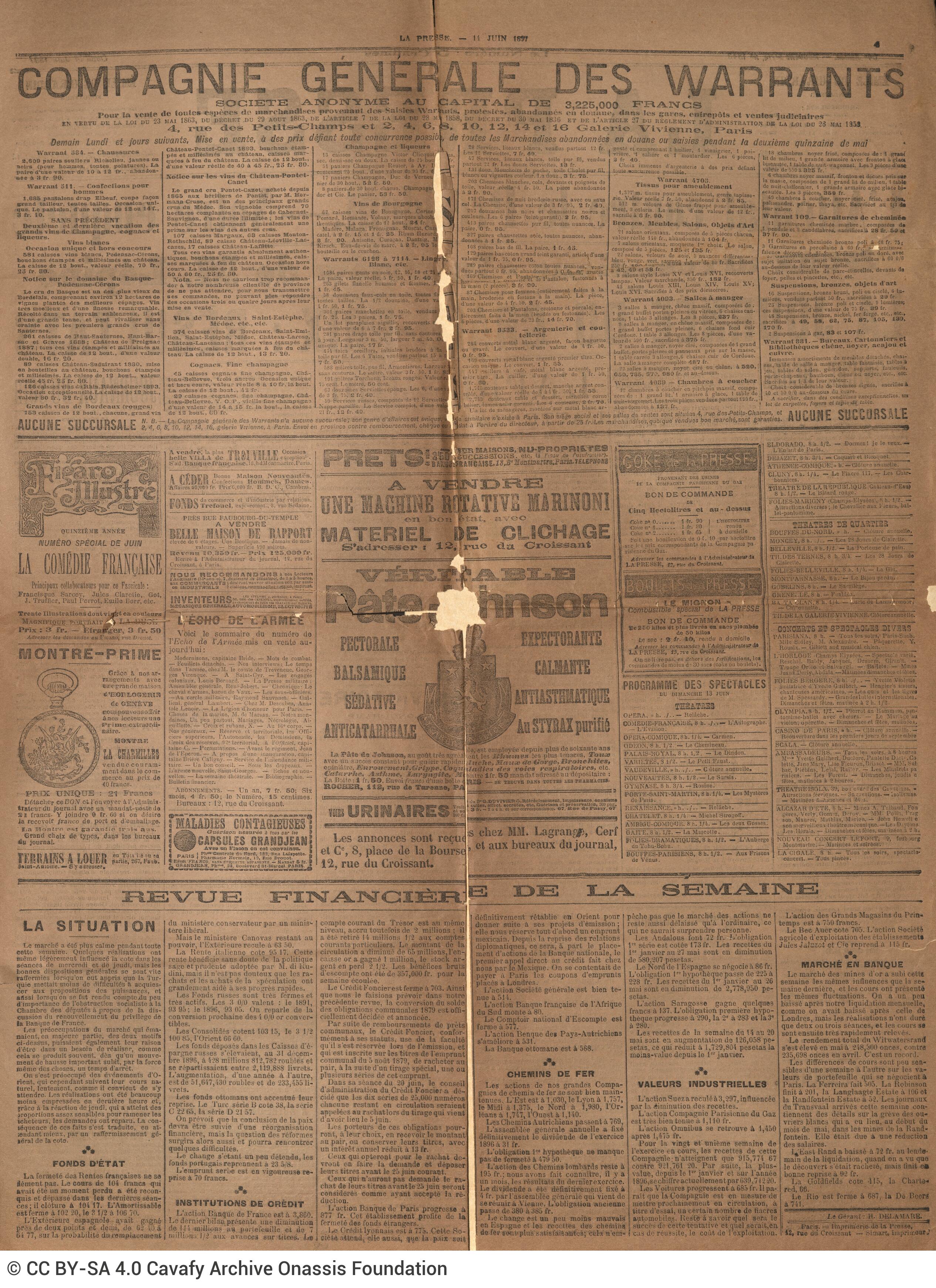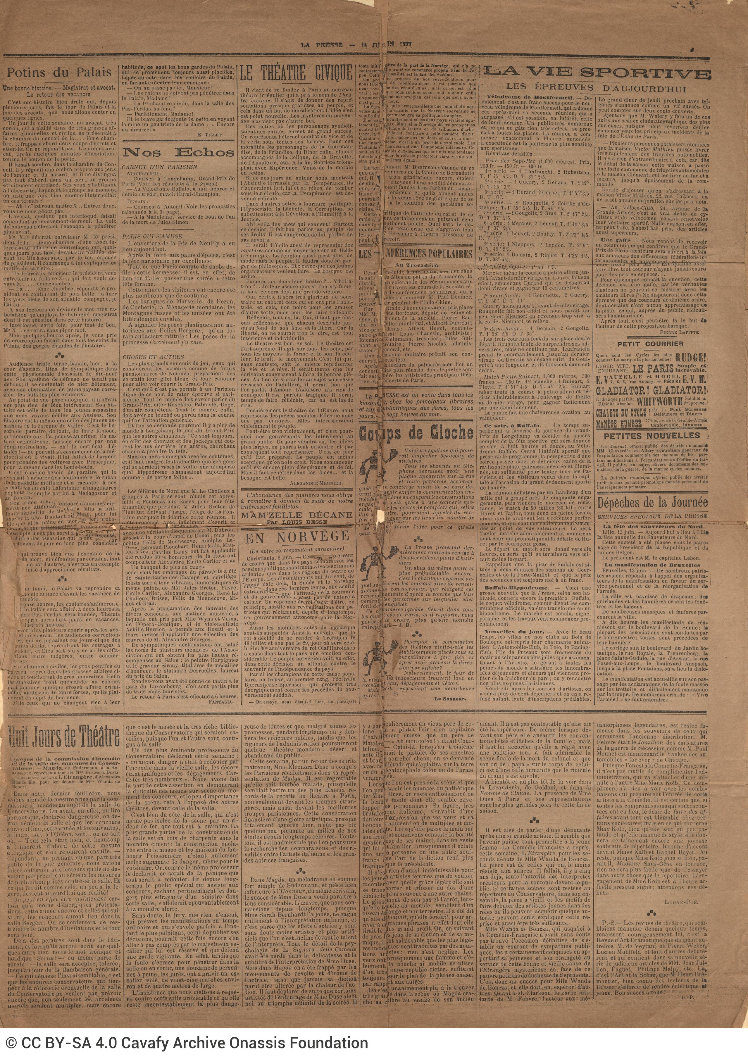 La Presse (newspaper). “News. La Presse”. Publication (newspaper issue), 14.06.1897. GR-OF CA CA-SF02-S02-F25-SF009-0044 (2165), Onassis Foundation C. P. Cavafy Fonds. From The Digital Collection of the Cavafy Archive, edited by Onassis Foundation, Athens, last modified 01.10.2025. https://doi.org/10.26256/CA-SF02-S02-F25-SF009-0044.