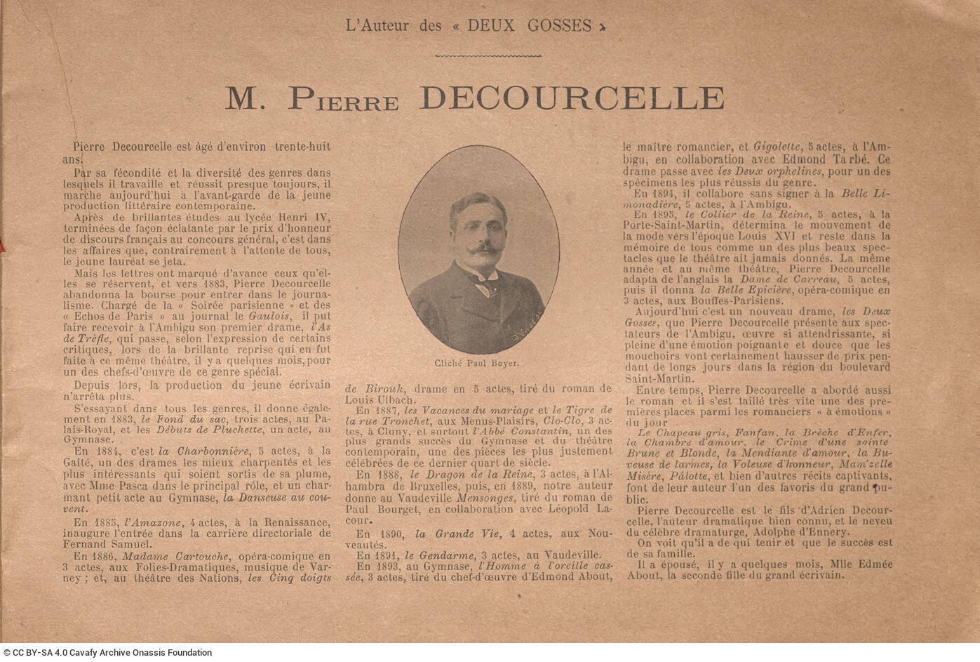 Theatre programme titled “Le photo-programme, Revue Illustrée des théâtres” of the Théâtre de l’Ambigu-Comique for the performance of the play Les Deux Gosses by Pierre Decourcelle in Paris. The portraits and biographies of the directors, authors, and actors are included together with the history of the theatre, along with information on the ticket prices and the distribution of the programmes. The price of the programme is on the front cover: “20 Centimes”.