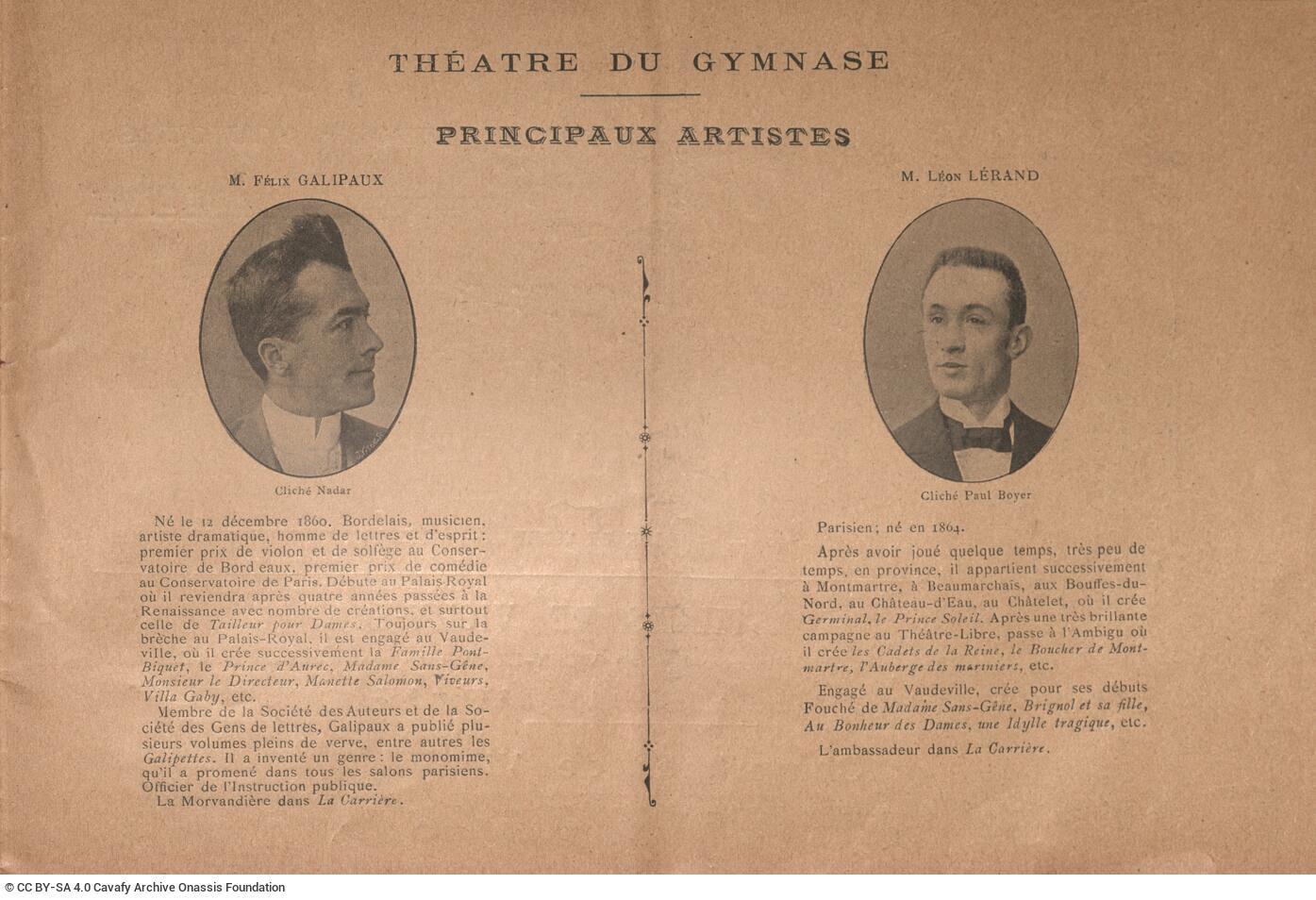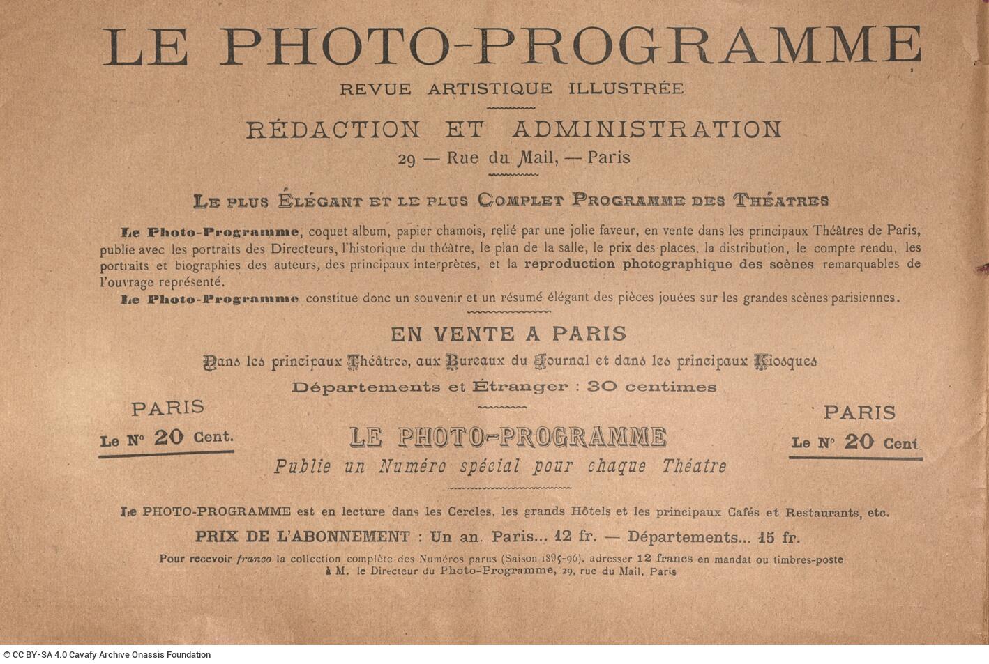 Théâtre du Gymnase (Paris). ““Le photo-programme, Revue Illustrée des théâtres””. Theatre programme, 1896-1897. GR-OF CA CA-SF02-S02-F25-SF009-0005 (2126), Onassis Foundation C. P. Cavafy Fonds. From The Digital Collection of the Cavafy Archive, edited by Onassis Foundation, Athens, last modified 01.10.2025. https://doi.org/10.26256/CA-SF02-S02-F25-SF009-0005.