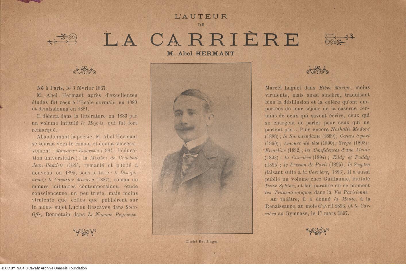 Theatre programme titled “Le photo-programme, Revue Illustrée des théâtres” of the Théâtre du Gymnase for the performance of the play La carrière by Abel Hermant in Paris. The portraits and biographies of the directors, authors, and actors are included together with the history of the theatre, along with information on the ticket prices and the distribution of the programmes. The price of the programme is on the front cover: “20 Centimes”.