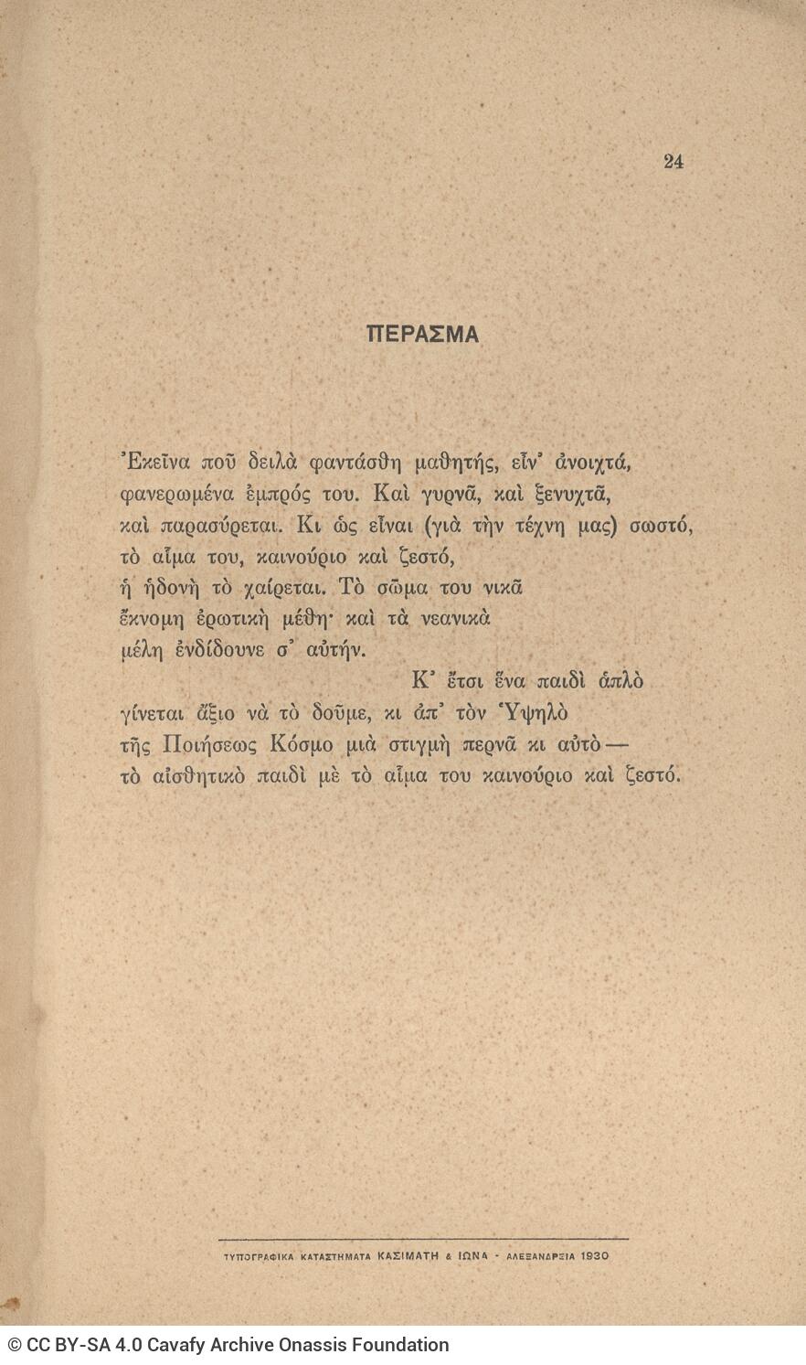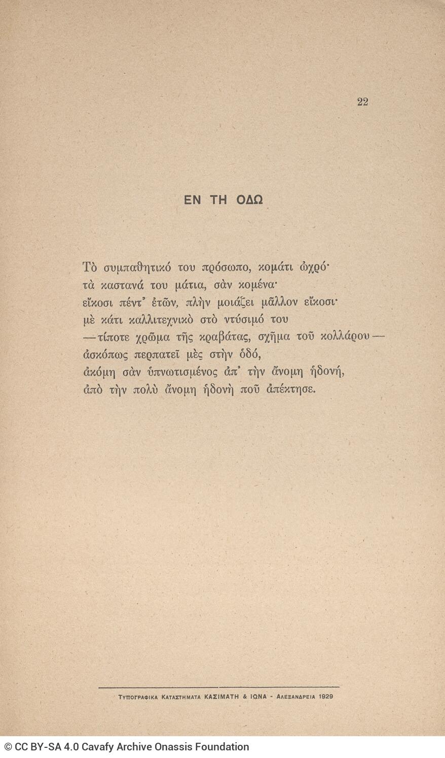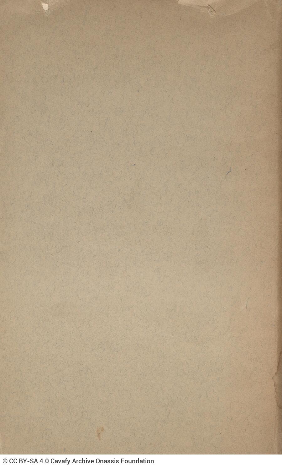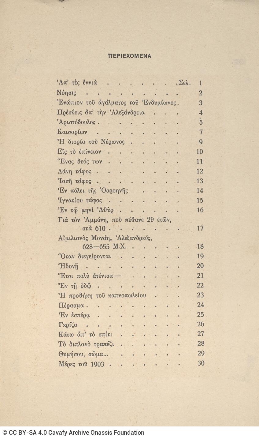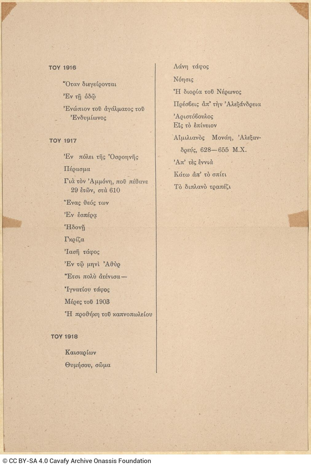 Printed poetry collection by Cavafy, consisting of bound broadsheets printed in Alexandria by the Kasimatis & Ionas printing house. It contains 28 poems, as well as an insert sheet with the titles of the poems chronologically arranged, in two columns. Printed title “C. P. Cavafy Poems (1916-1918)” on its front cover. Page numbers are printed and on some pages there are handwritten corrections in ink. Several of the poems are printed by the Kasimatis & Ionas printing house in Alexandria, accompanied by the year of printing (1927-1931). Table of contents on the last page. The insert sheet contains the printed titles of the poems, chronologically arranged by year (1916-1918).