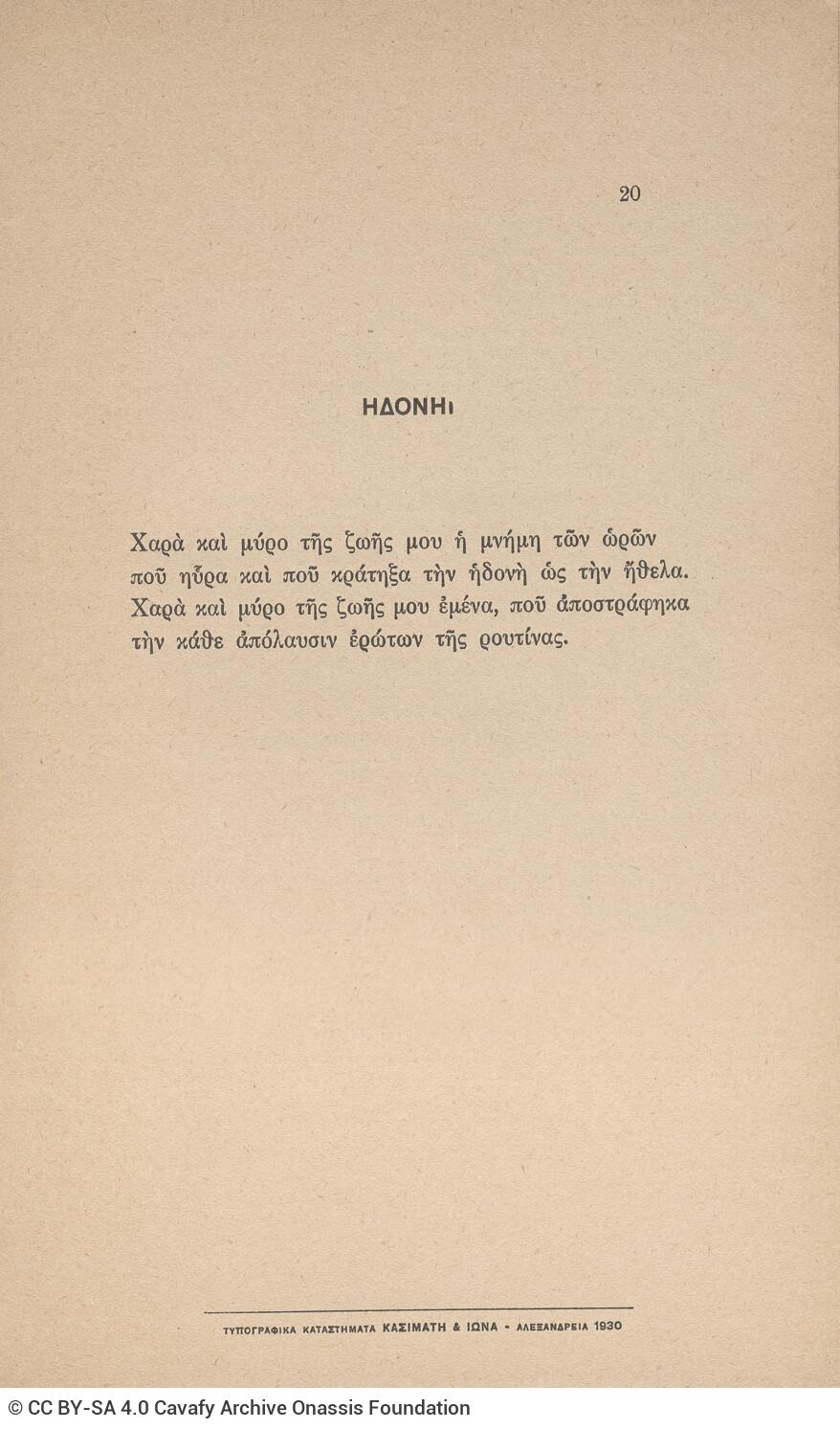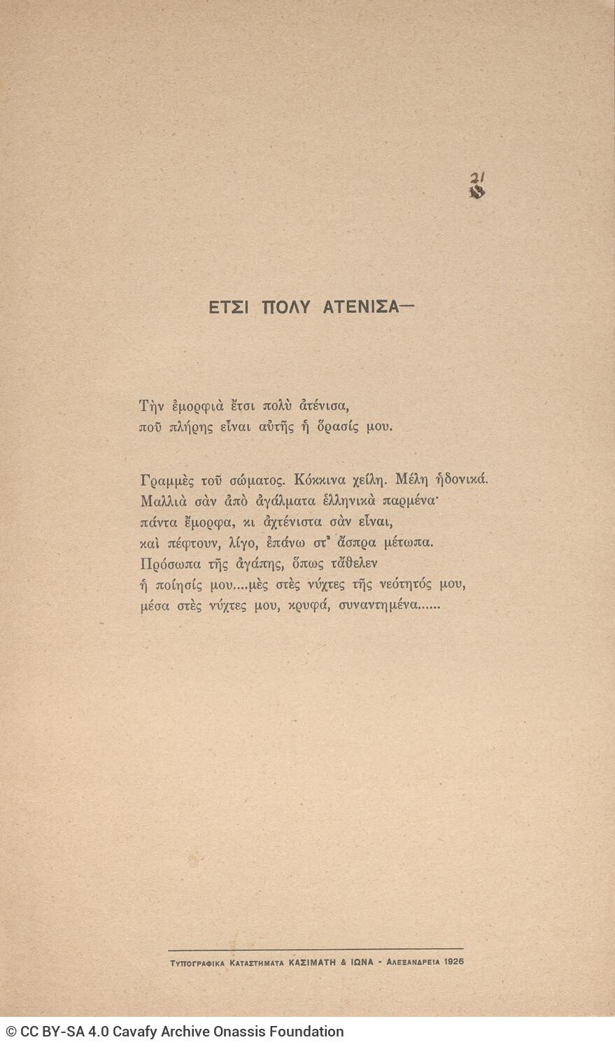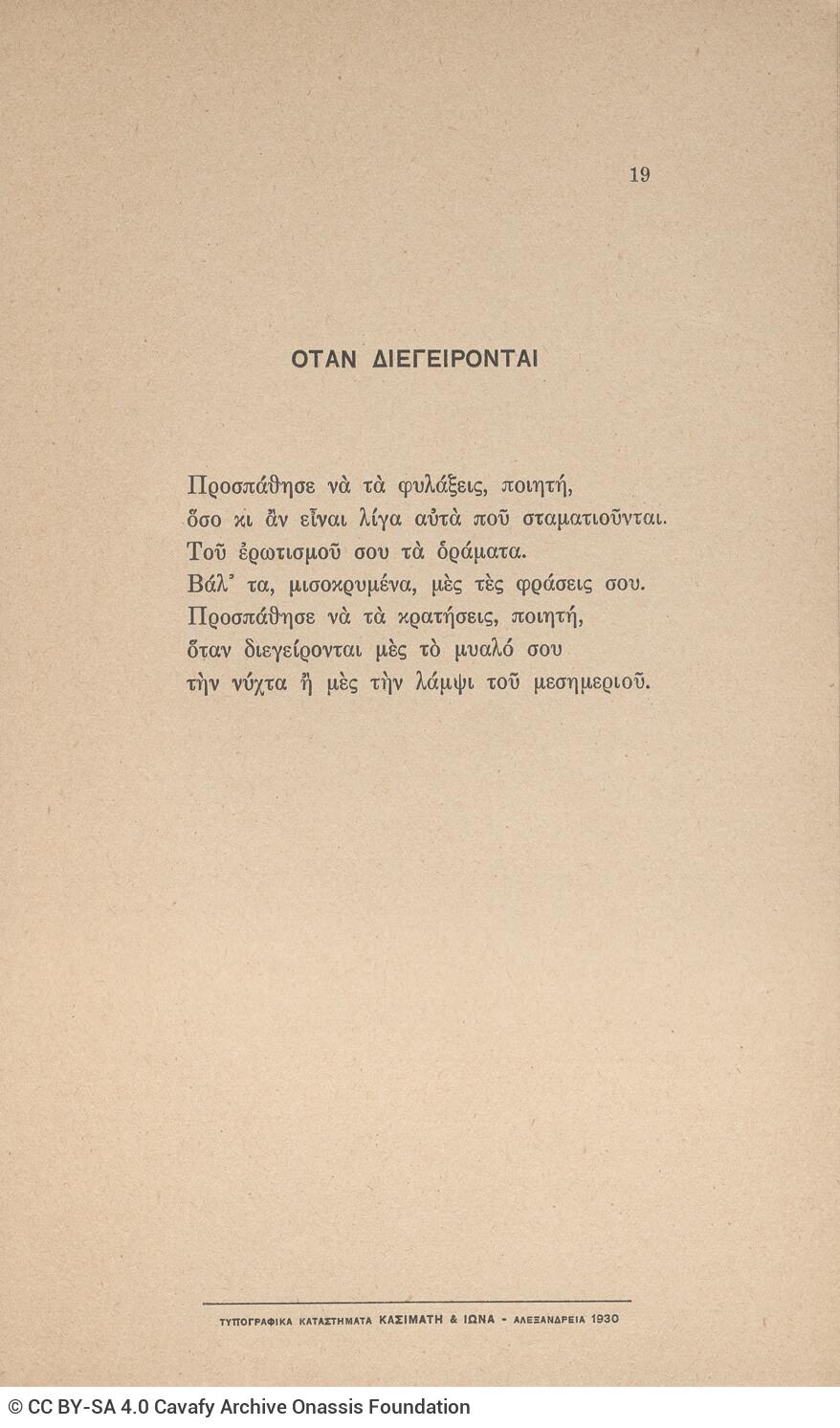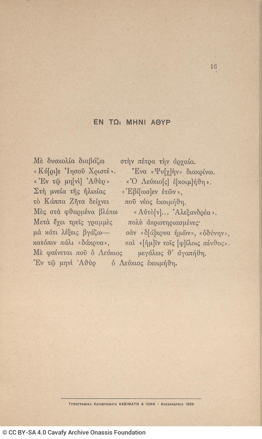 Printed poetry collection by Cavafy, consisting of bound broadsheets printed in Alexandria by the Kasimatis & Ionas printing house. It contains 28 poems, as well as an insert sheet with the titles of the poems chronologically arranged, in two columns. Printed title “C. P. Cavafy Poems (1916-1918)” on its front cover. Page numbers are printed and on some pages there are handwritten corrections in ink. Several of the poems are printed by the Kasimatis & Ionas printing house in Alexandria, accompanied by the year of printing (1927-1931). Table of contents on the last page. The insert sheet contains the printed titles of the poems, chronologically arranged by year (1916-1918).