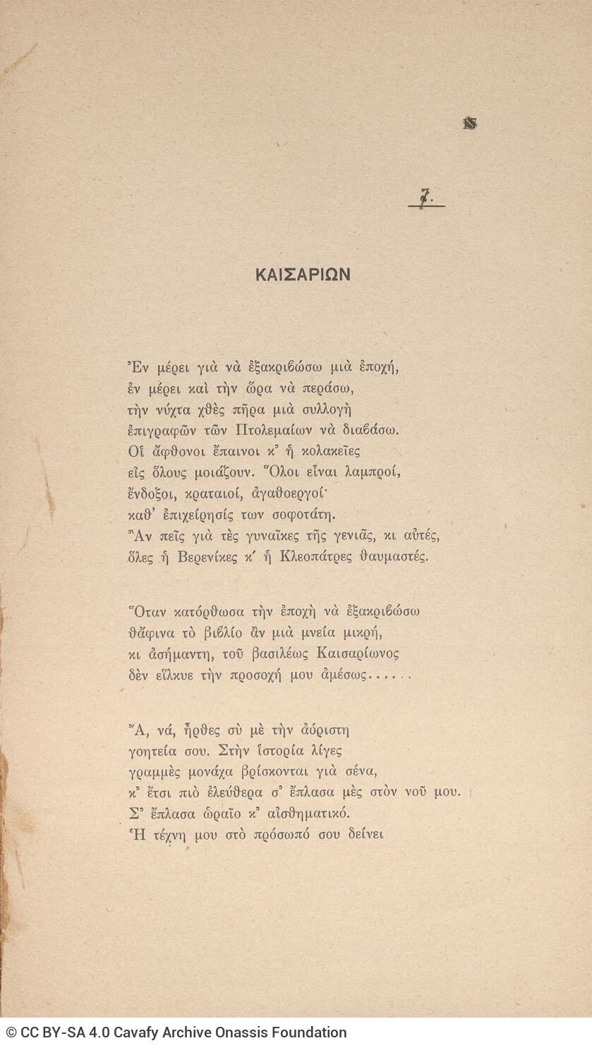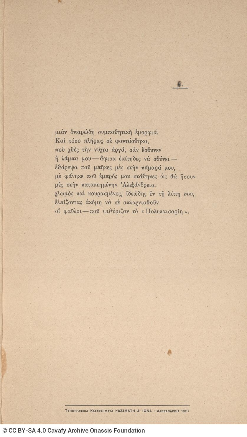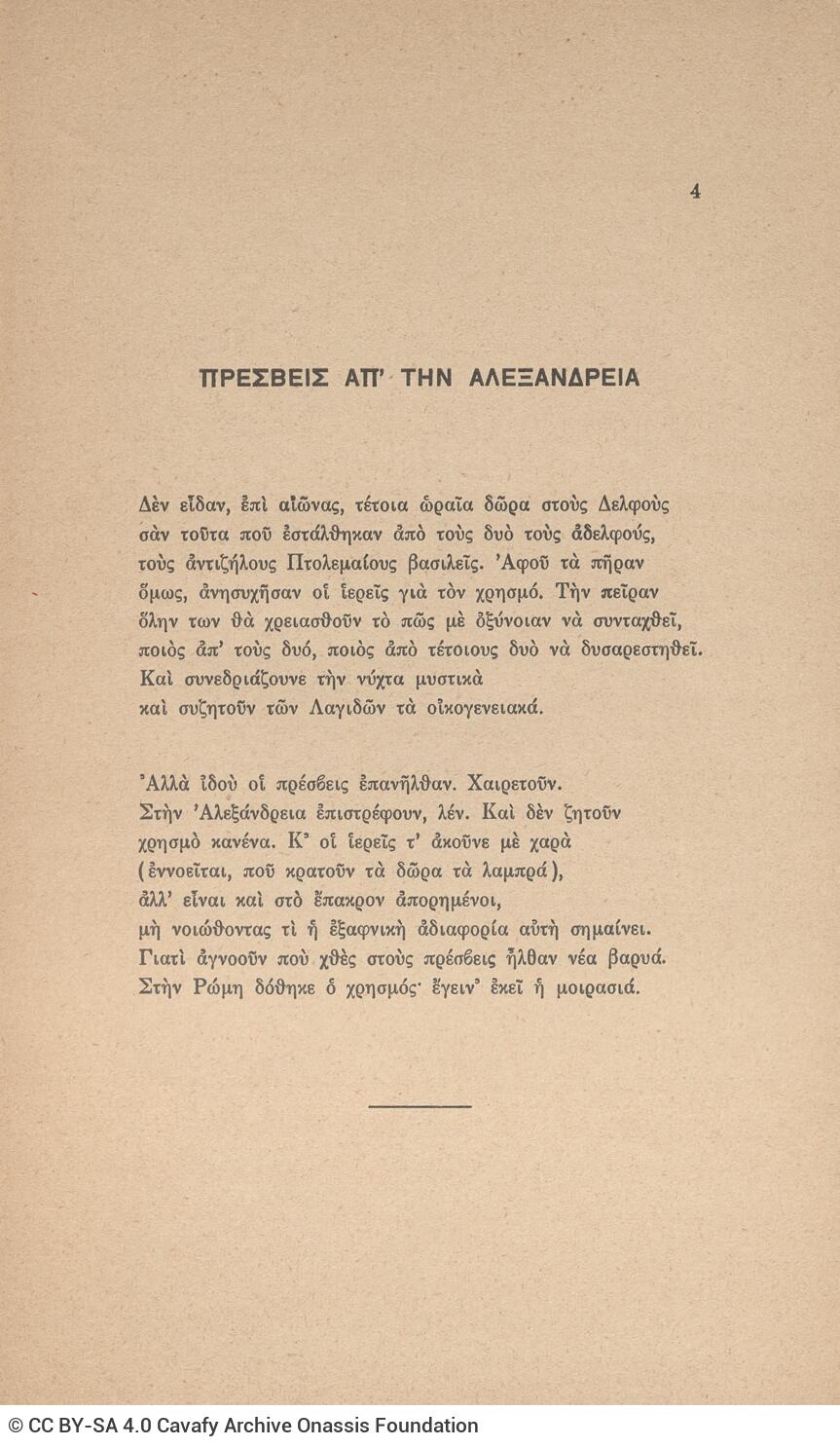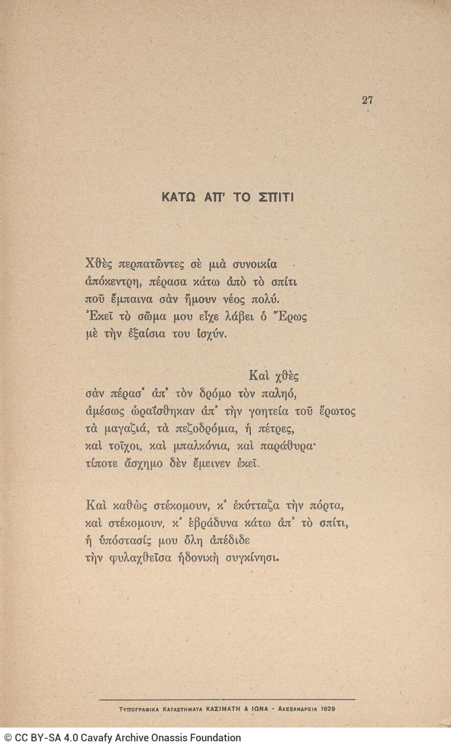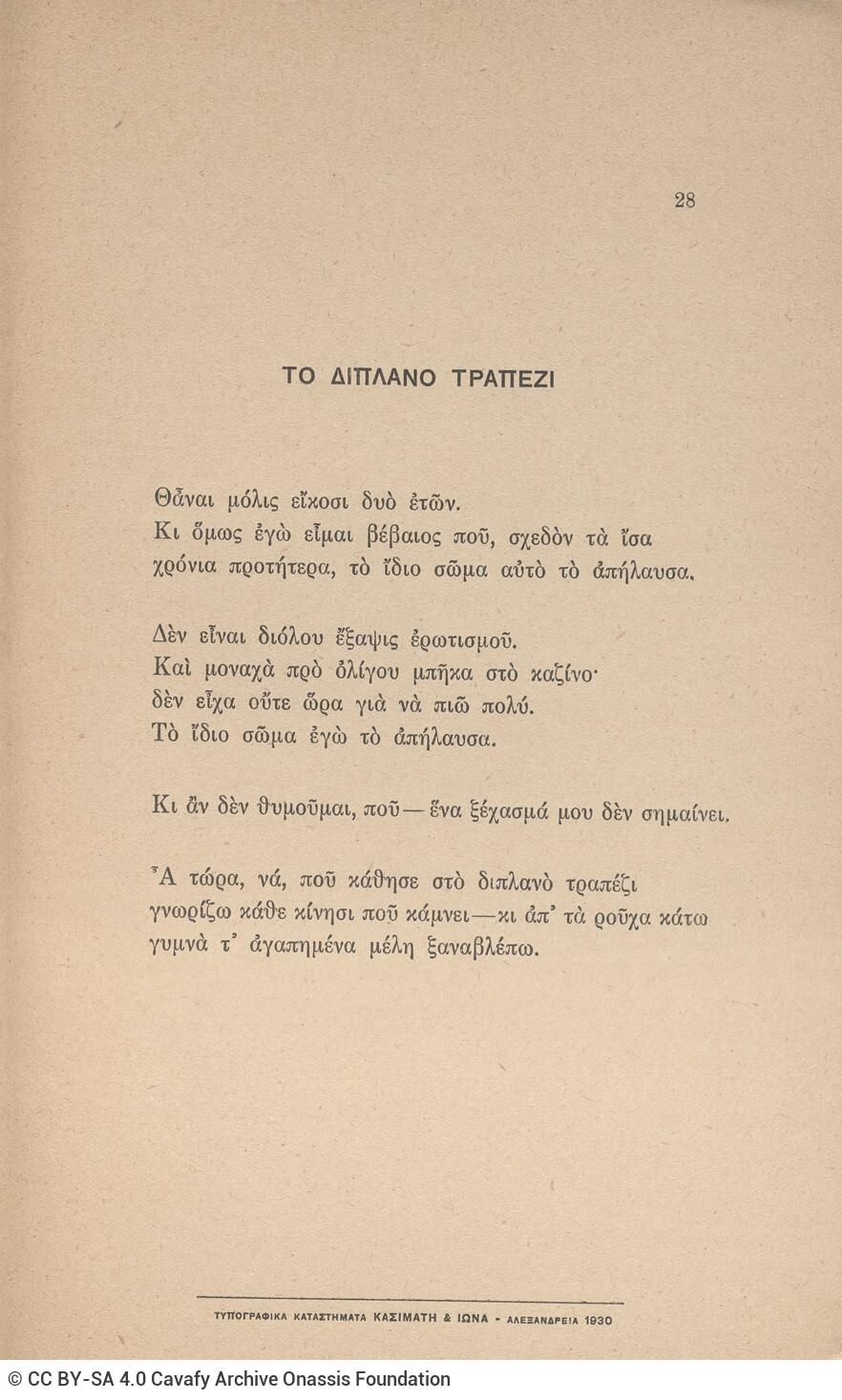 Printed poetry collection by Cavafy, consisting of bound broadsheets printed in Alexandria by the Kasimatis & Ionas printing house. It contains 28 poems, as well as an insert sheet with the titles of the poems chronologically arranged, in two columns. Printed title “C. P. Cavafy Poems (1916-1918)” on its front cover. Page numbers are printed and on some pages there are handwritten corrections in ink. Several of the poems are printed by the Kasimatis & Ionas printing house in Alexandria, accompanied by the year of printing (1927-1931). Table of contents on the last page. The insert sheet contains the printed titles of the poems, chronologically arranged by year (1916-1918).