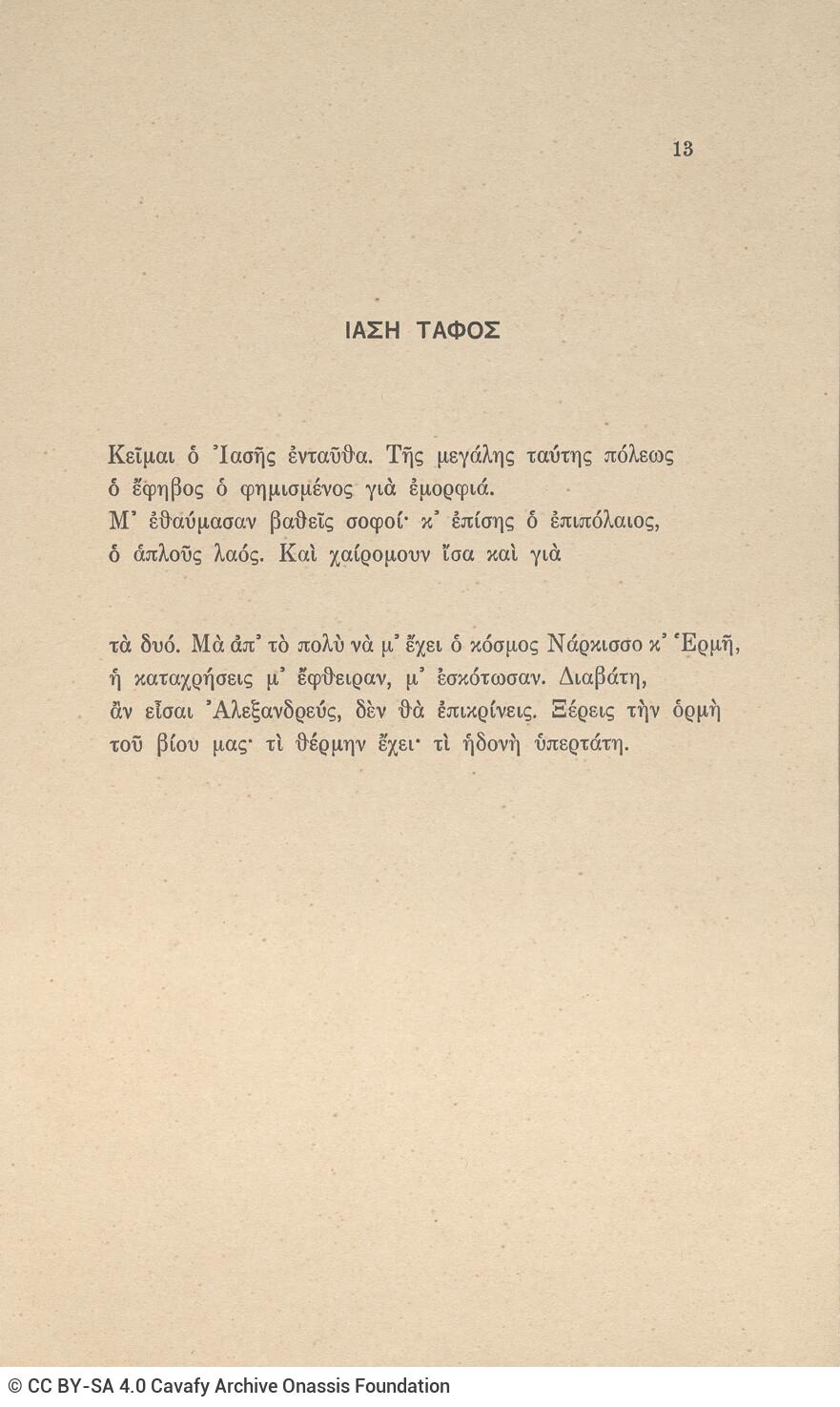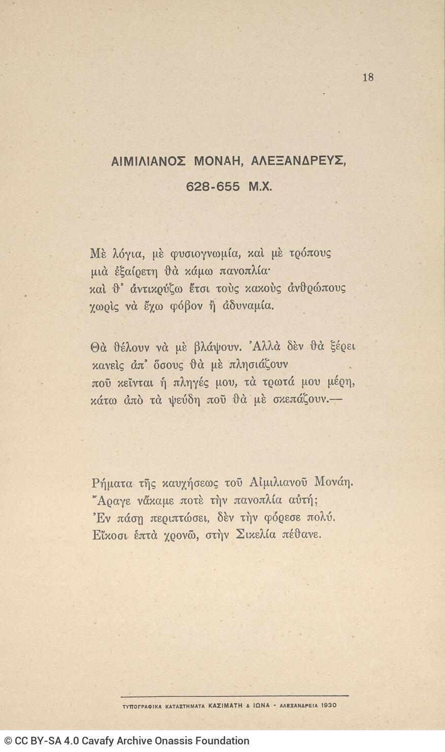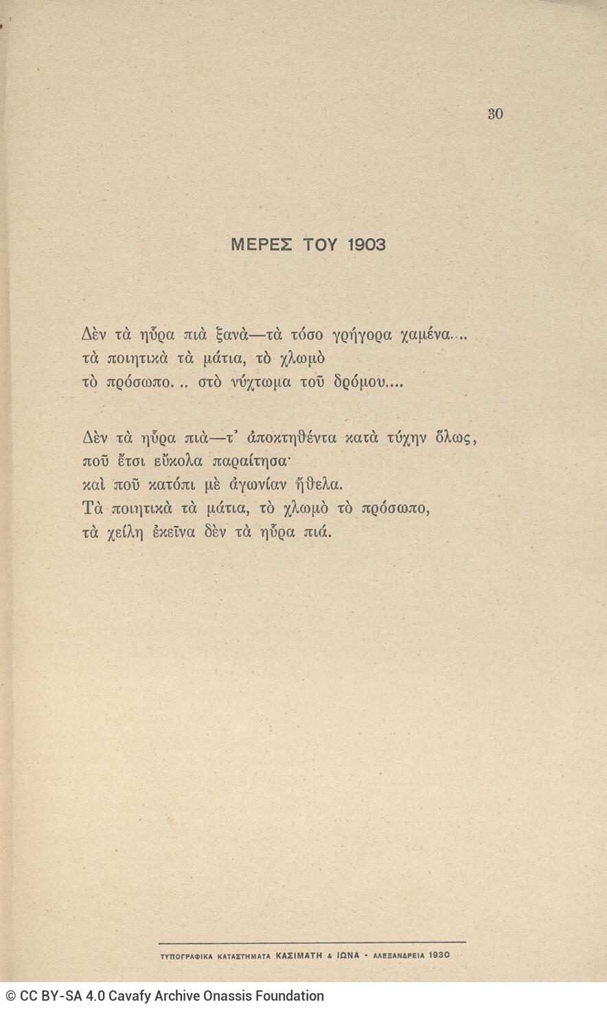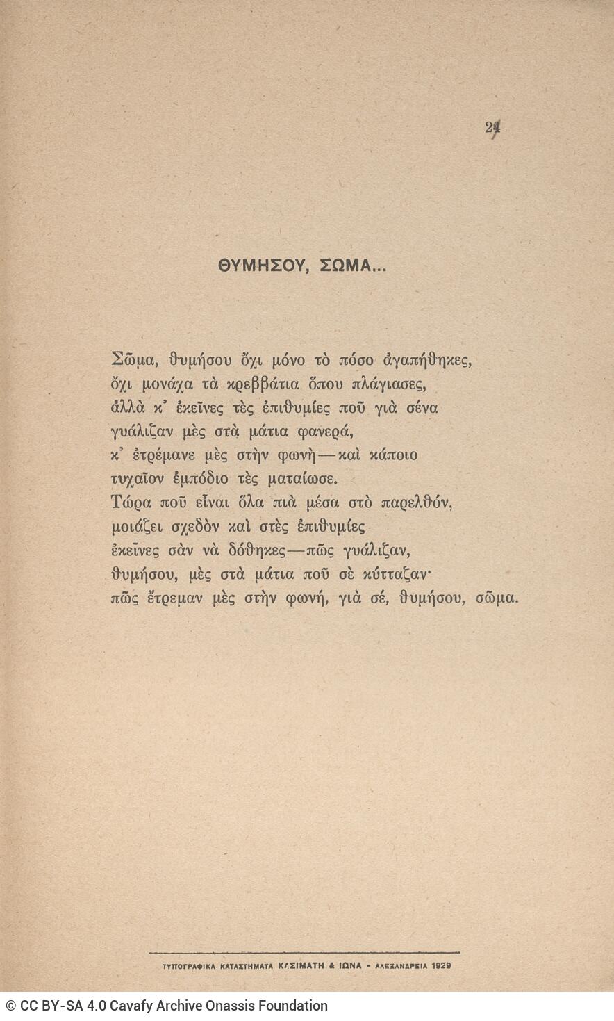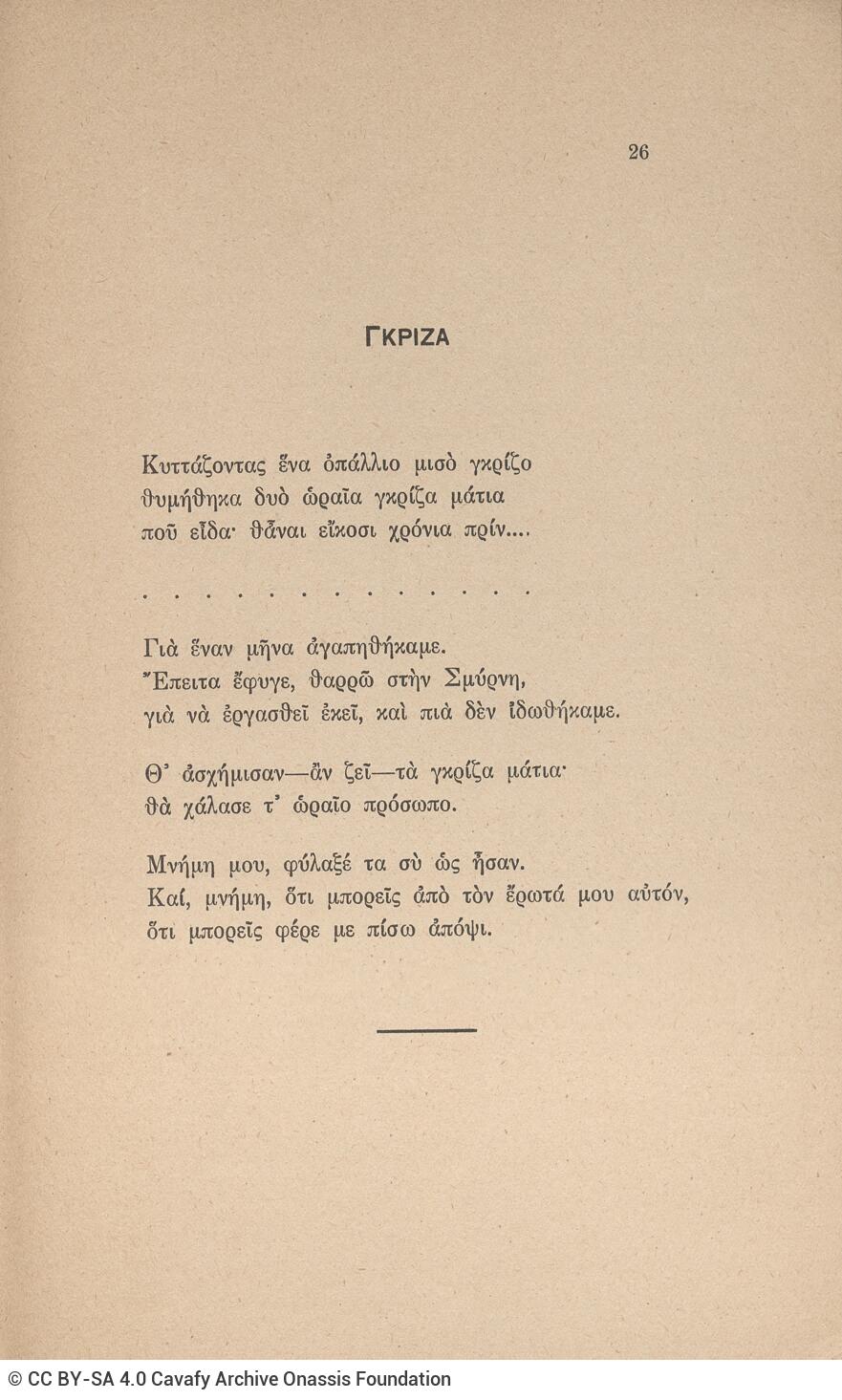 Printed poetry collection by Cavafy, consisting of bound broadsheets printed in Alexandria by the Kasimatis & Ionas printing house. It contains 28 poems, as well as an insert sheet with the titles of the poems chronologically arranged, in two columns. Printed title “C. P. Cavafy Poems (1916-1918)” on its front cover. Page numbers are printed and on some pages there are handwritten corrections in ink. Several of the poems are printed by the Kasimatis & Ionas printing house in Alexandria, accompanied by the year of printing (1927-1931). Table of contents on the last page. The insert sheet contains the printed titles of the poems, chronologically arranged by year (1916-1918).