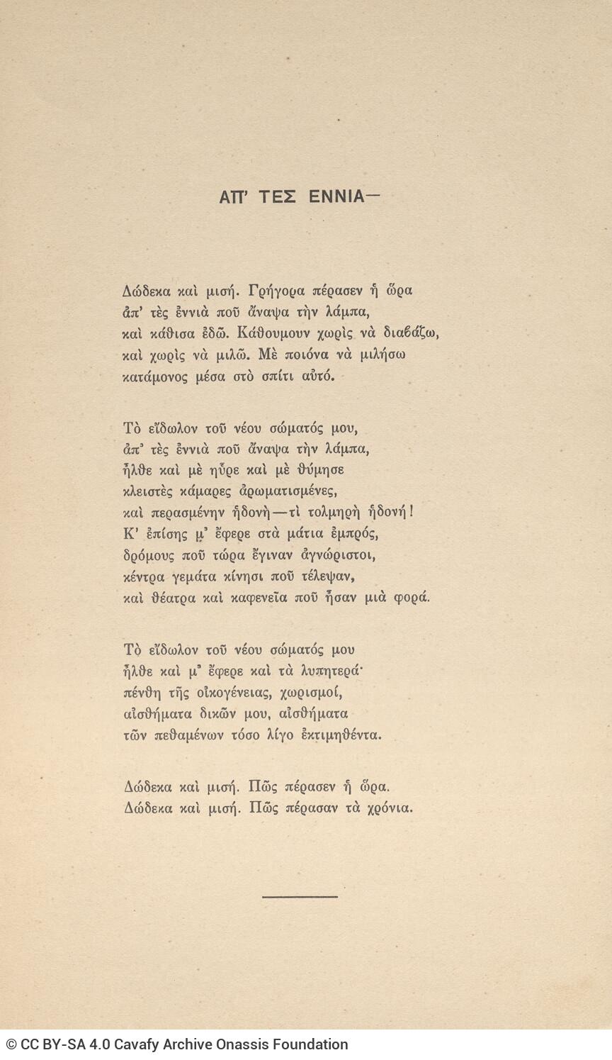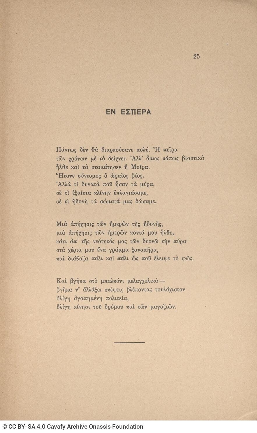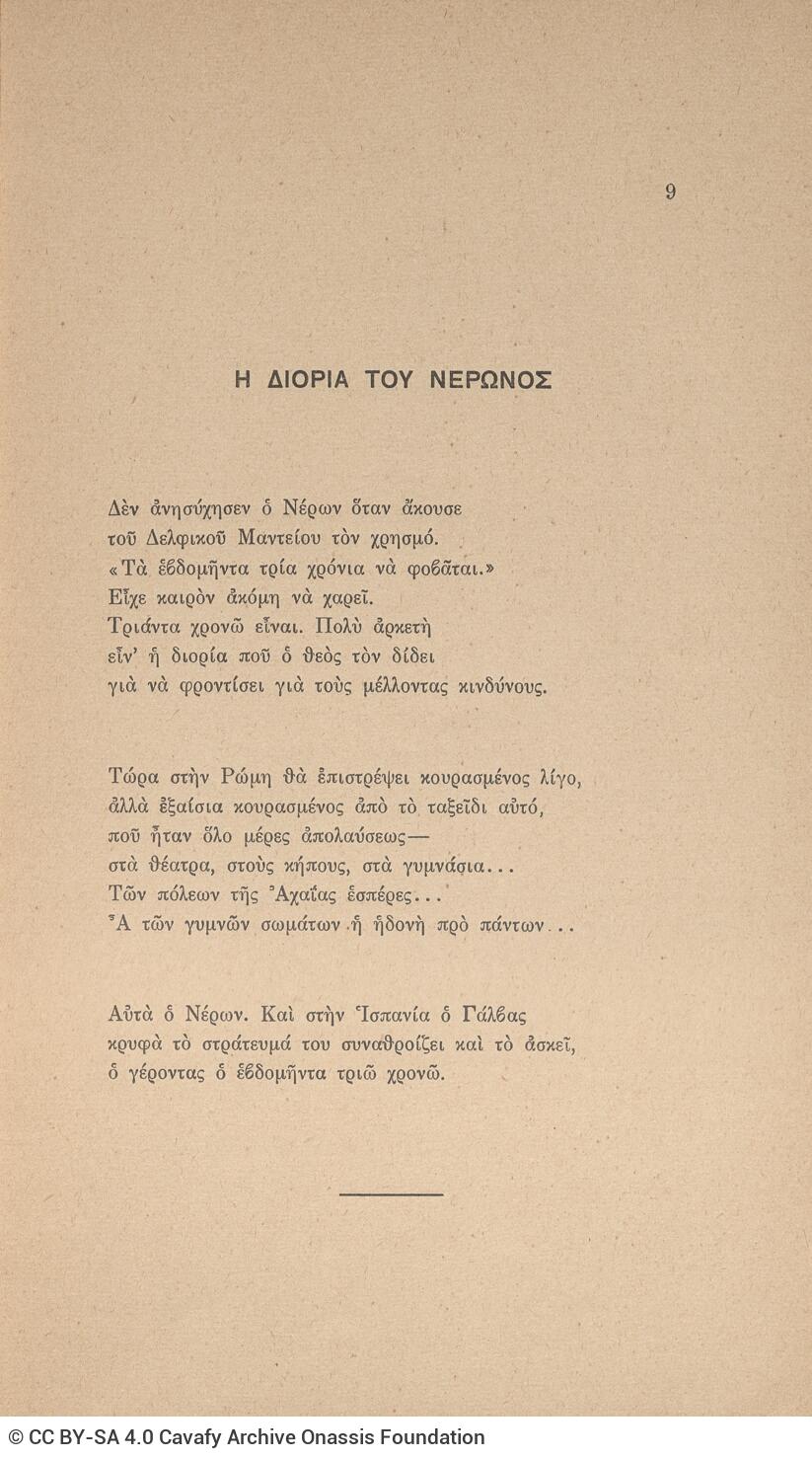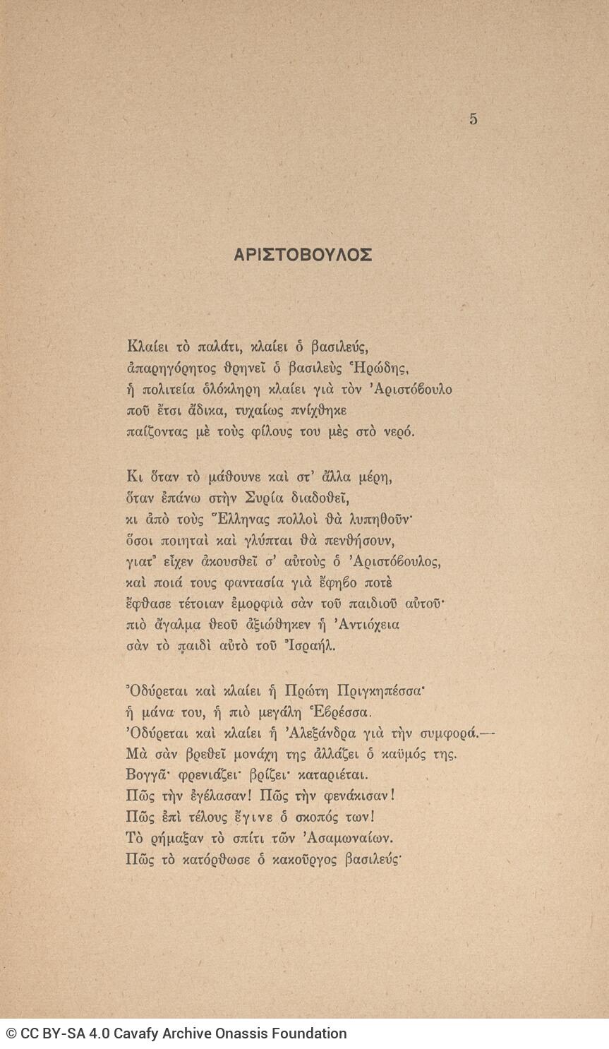 Printed poetry collection by Cavafy, consisting of bound broadsheets printed in Alexandria by the Kasimatis & Ionas printing house. It contains 28 poems, as well as an insert sheet with the titles of the poems chronologically arranged, in two columns. Printed title “C. P. Cavafy Poems (1916-1918)” on its front cover. Page numbers are printed and on some pages there are handwritten corrections in ink. Several of the poems are printed by the Kasimatis & Ionas printing house in Alexandria, accompanied by the year of printing (1927-1931). Table of contents on the last page. The insert sheet contains the printed titles of the poems, chronologically arranged by year (1916-1918).