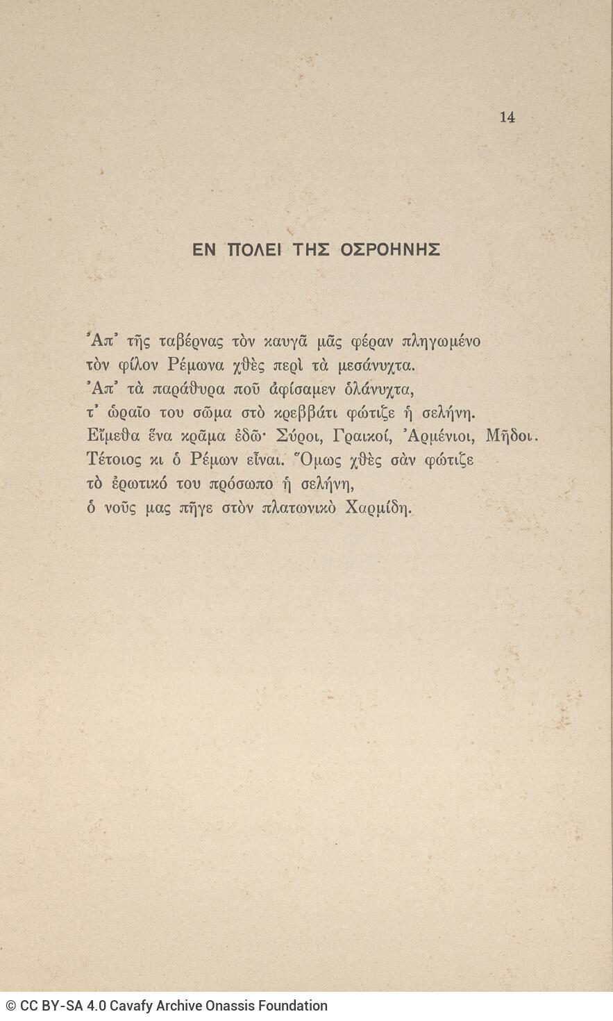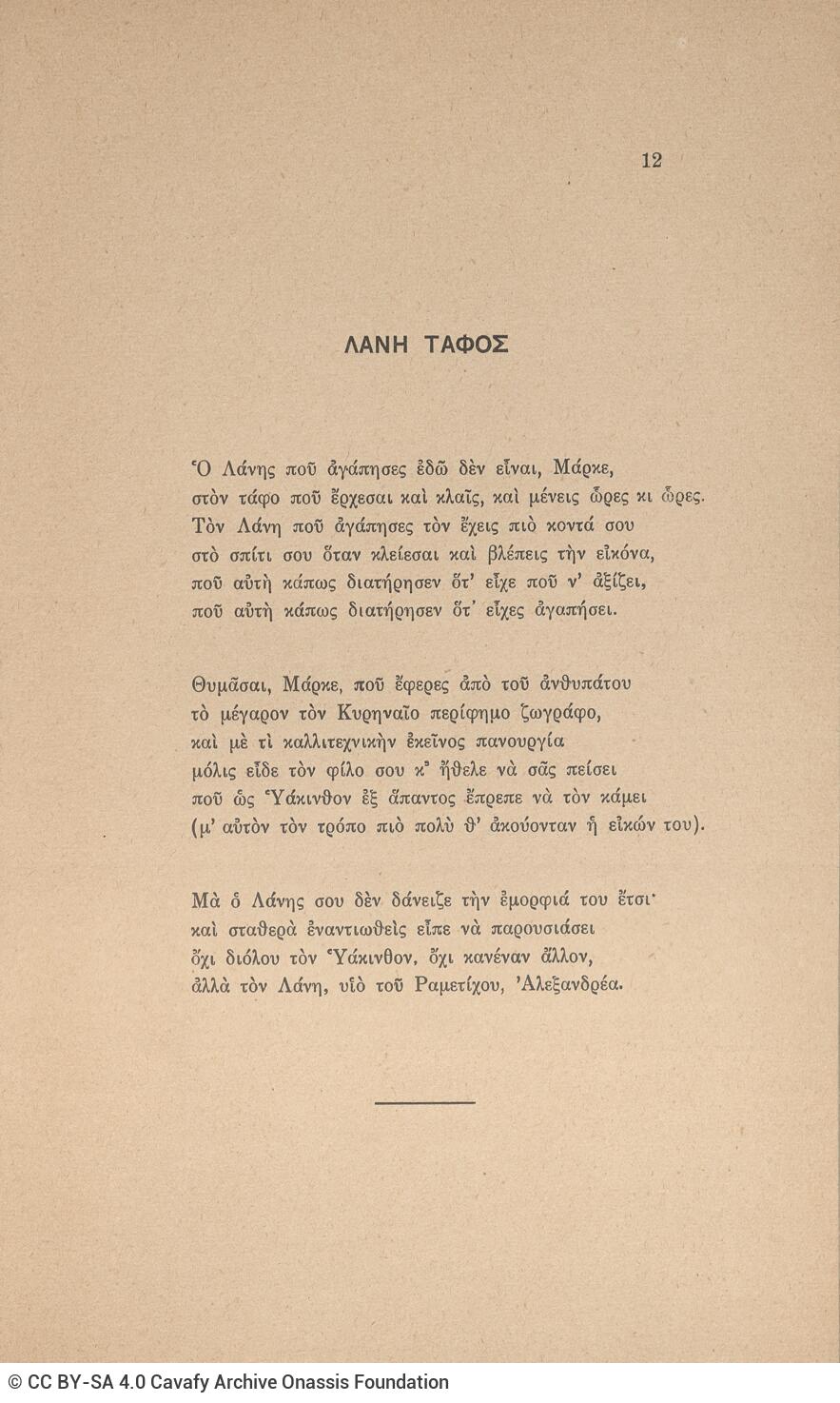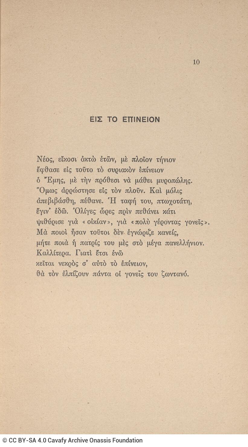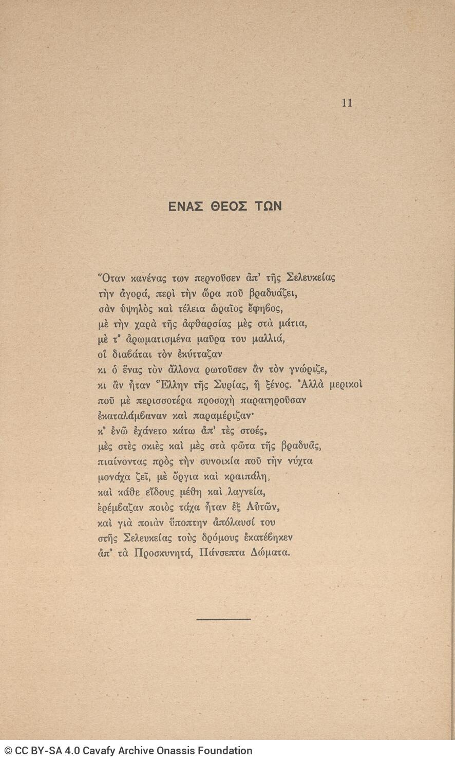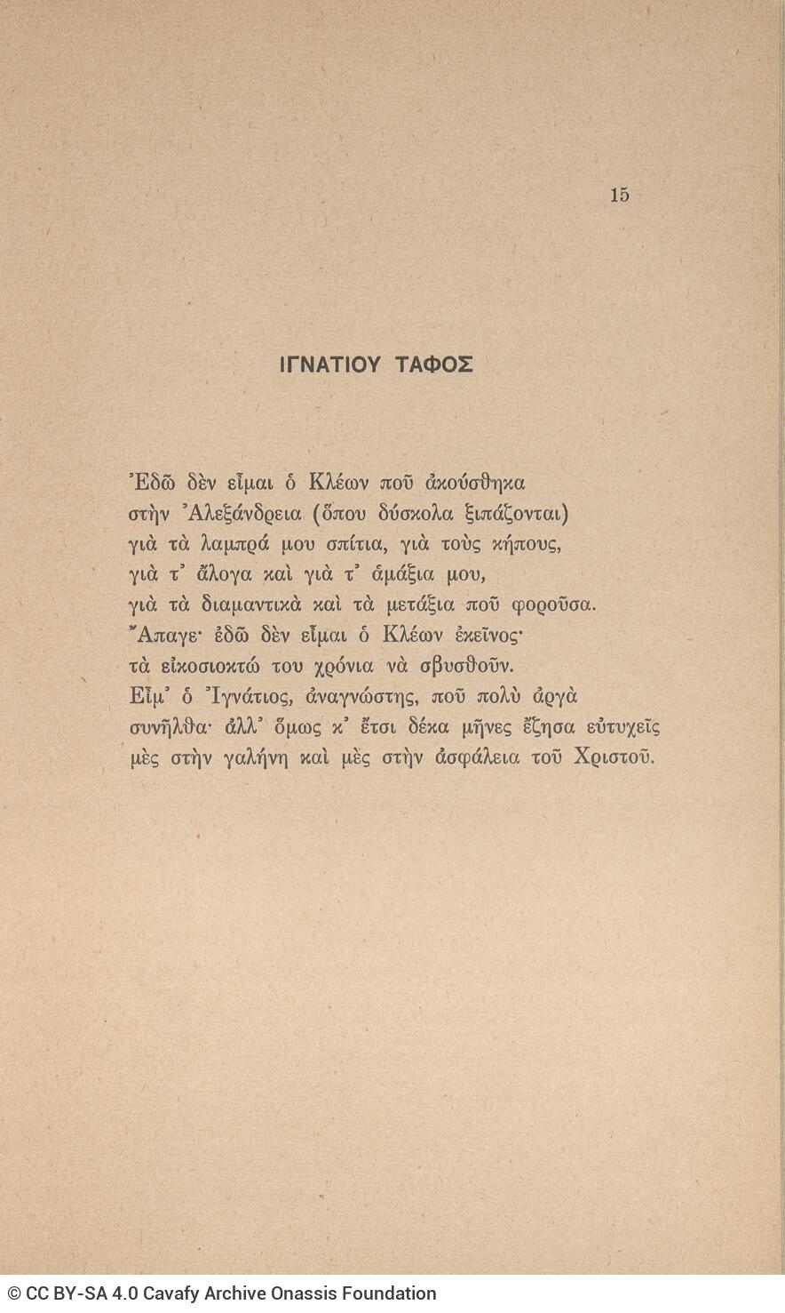 Printed poetry collection by Cavafy, consisting of bound broadsheets printed in Alexandria by the Kasimatis & Ionas printing house. It contains 28 poems, as well as an insert sheet with the titles of the poems chronologically arranged, in two columns. Printed title “C. P. Cavafy Poems (1916-1918)” on its front cover. Page numbers are printed and on some pages there are handwritten corrections in ink. Several of the poems are printed by the Kasimatis & Ionas printing house in Alexandria, accompanied by the year of printing (1927-1931). Table of contents on the last page. The insert sheet contains the printed titles of the poems, chronologically arranged by year (1916-1918).