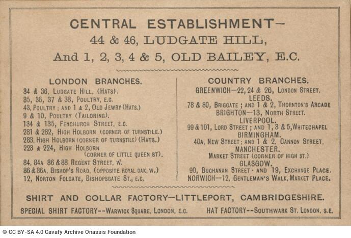 Hope Brothers Ltd (London). “Advertisement card “Hope Brothers Tailors, Hosiers, Glovers””. (Advertisement) Card, n.d.. GR-OF CA CA-SF02-S02-F25-SF009-0049 (2170), Onassis Foundation C. P. Cavafy Fonds. From The Digital Collection of the Cavafy Archive, edited by Onassis Foundation, Athens, last modified 01.10.2025. https://doi.org/10.26256/CA-SF02-S02-F25-SF009-0049.