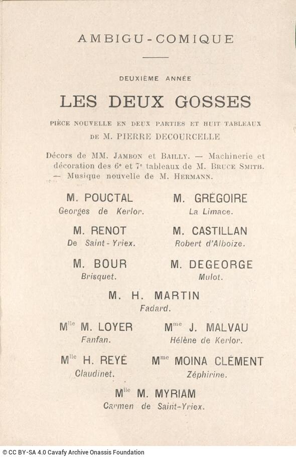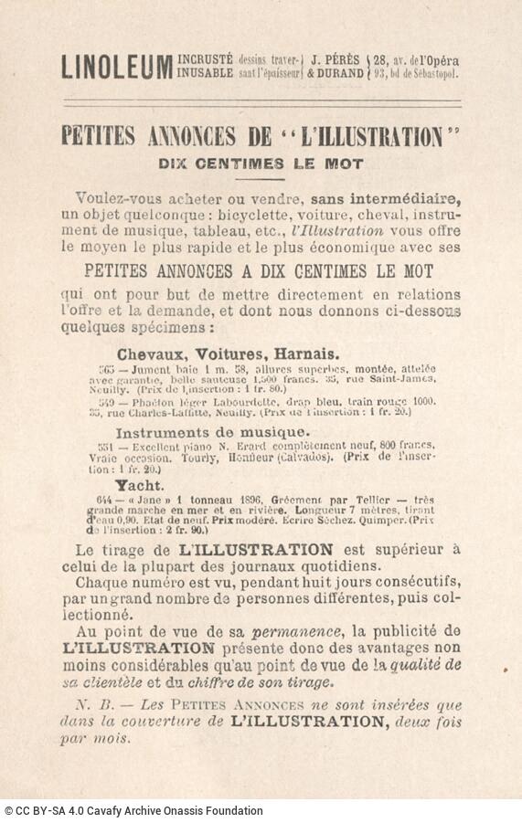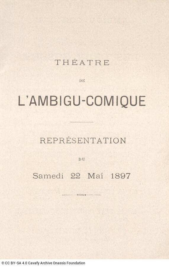 L’illustration (newspaper). “Theatre programme by “L’illustration””. Theatre programme, 22.05.1897. GR-OF CA CA-SF02-S02-F25-SF009-0024 (2145), Onassis Foundation C. P. Cavafy Fonds. From The Digital Collection of the Cavafy Archive, edited by Onassis Foundation, Athens, last modified 01.10.2025. https://doi.org/10.26256/CA-SF02-S02-F25-SF009-0024.